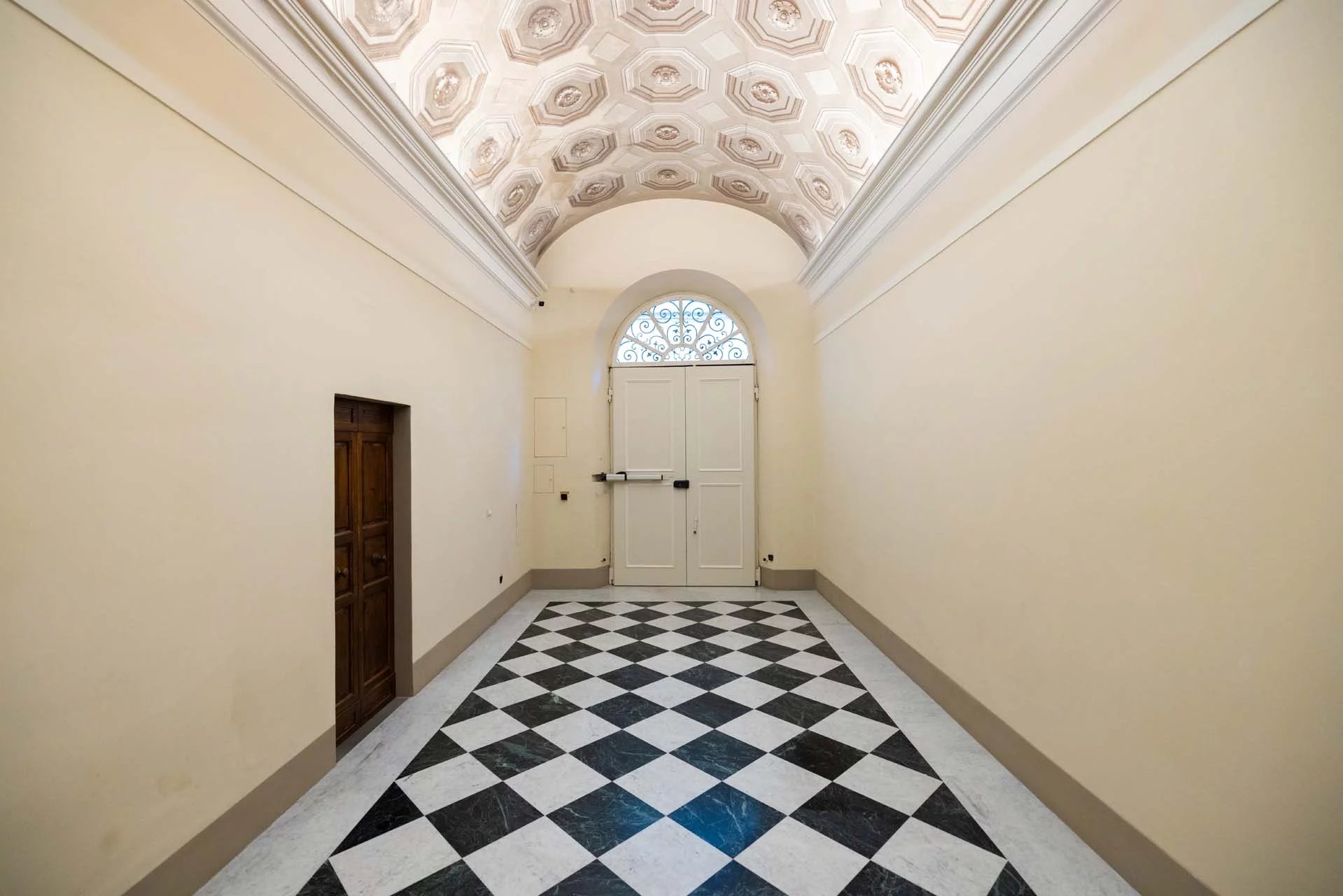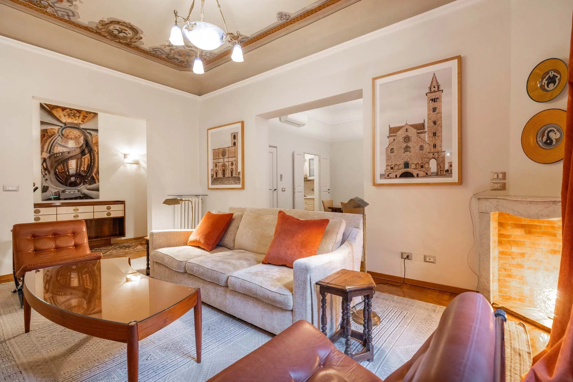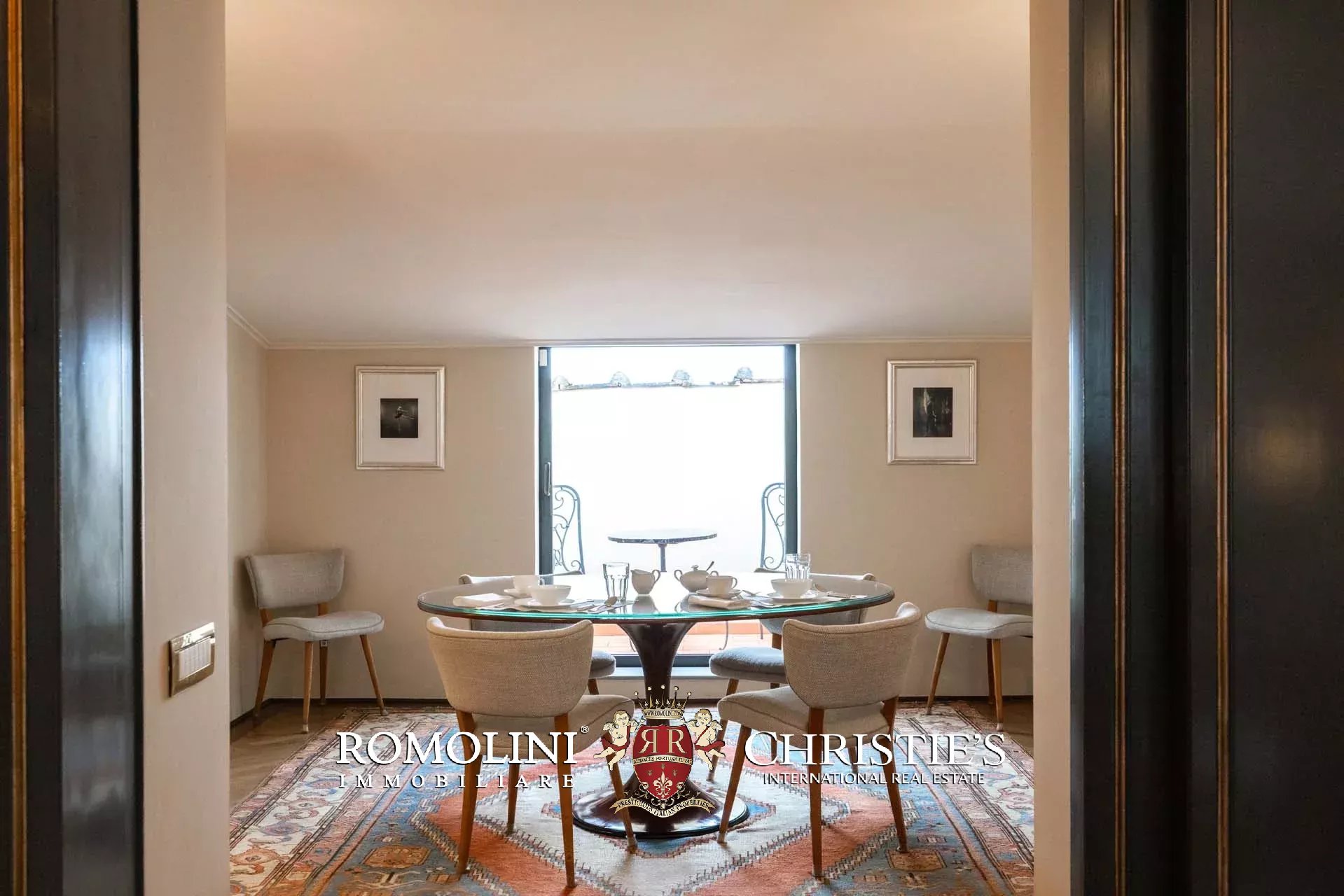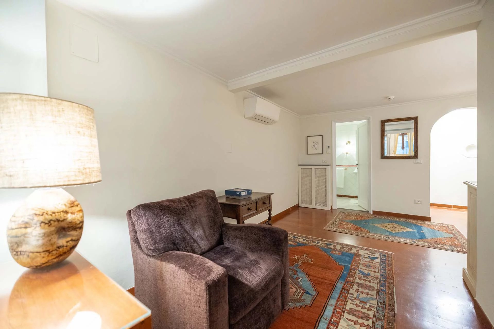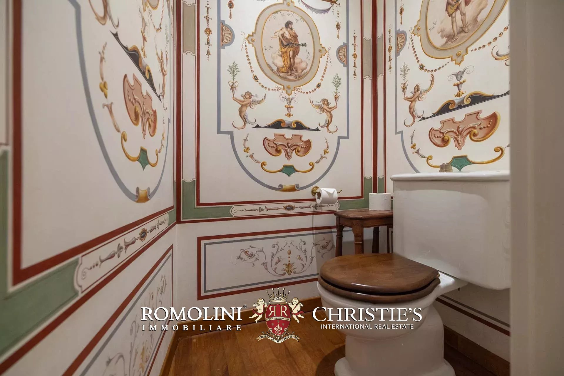- Appartamento Giotto (147 m², 1 camera e 2 bagni): sempre al piano terra, l’unità è accessibile direttamente dalla strada o dall’androne condominiale e viene attualmente usata dai custodi della proprietà. Le due porte si aprono su un salotto con bagno, collegato posteriormente alla lavanderia. Salendo una scala interna si arriva alla sala da pranzo con annessa cucina e alla camera con bagno e cabina armadio.