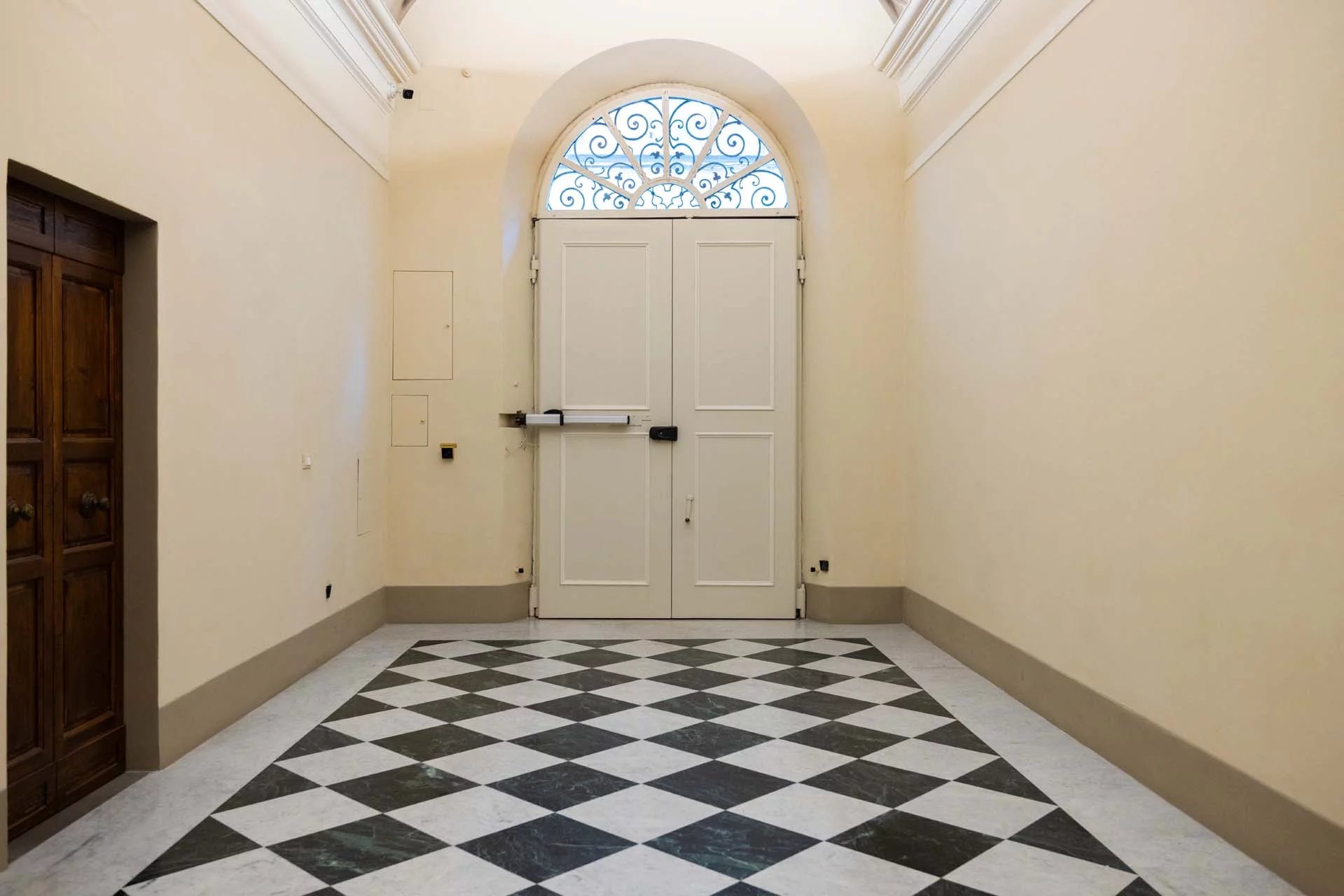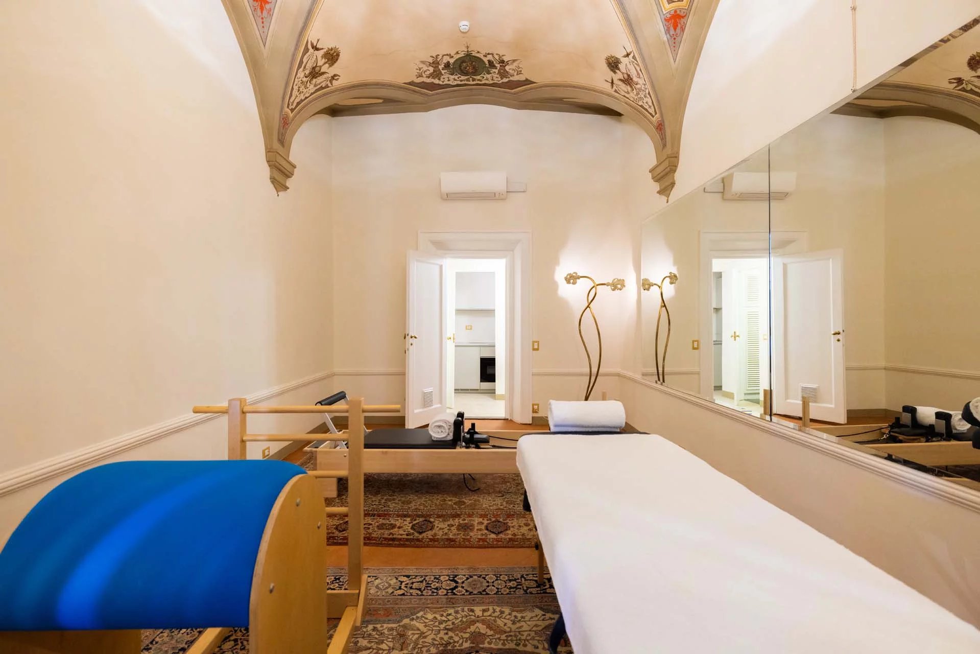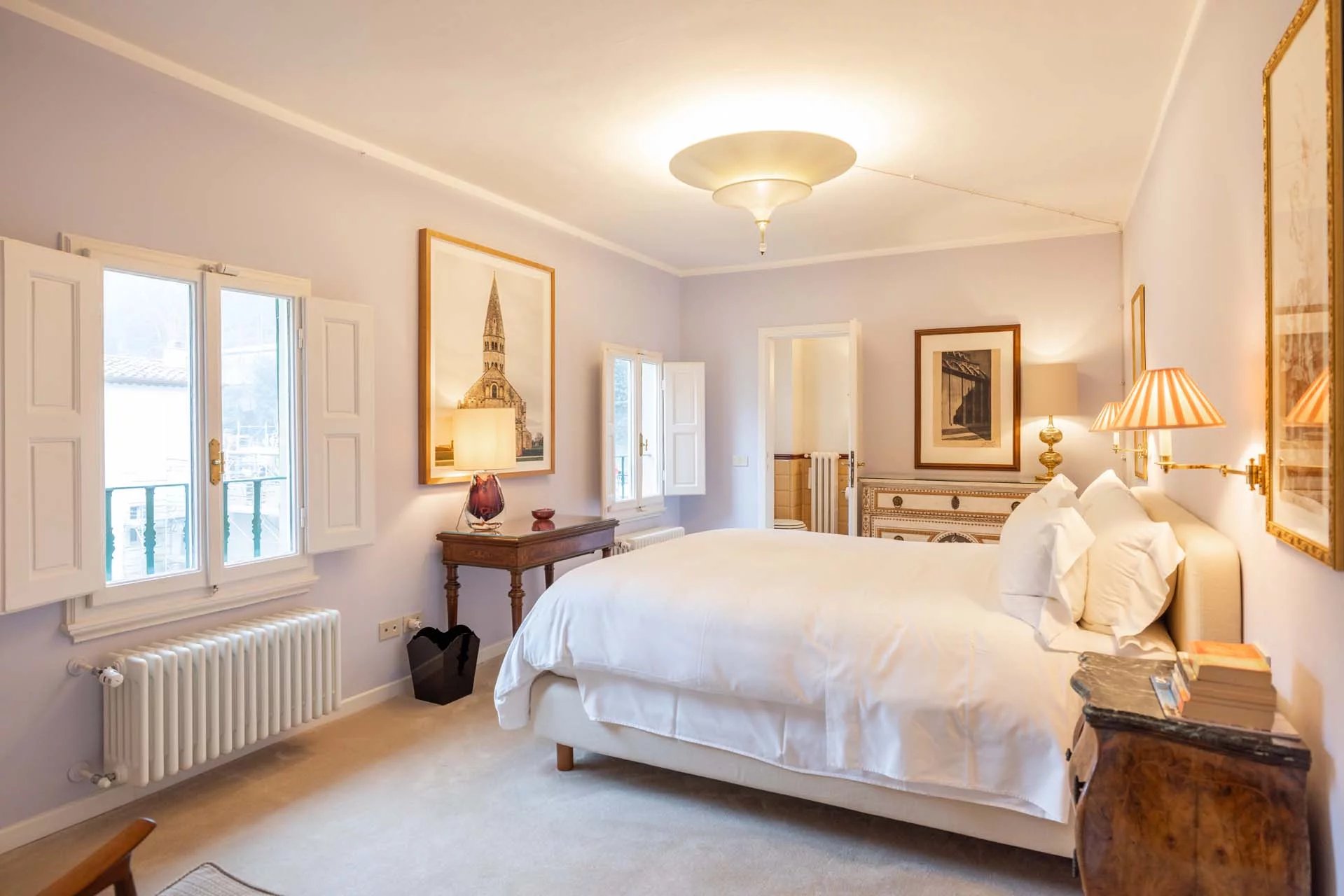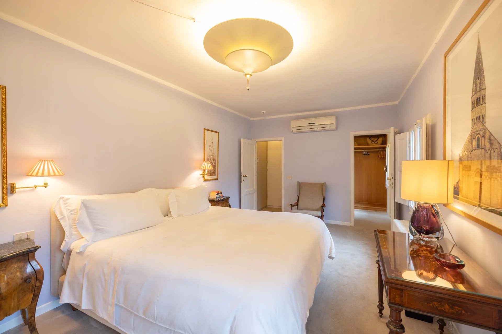 - Appartamento Giotto (147 m², 1 camera e 2 bagni): sempre al piano terra, l’unità è accessibile direttamente dalla strada o dall’androne condominiale e viene attualmente usata dai custodi della proprietà. Le due porte si aprono su un salotto con bagno, collegato posteriormente alla lavanderia. Salendo una scala interna si arriva alla sala da pranzo con annessa cucina e alla camera con bagno e cabina armadio.