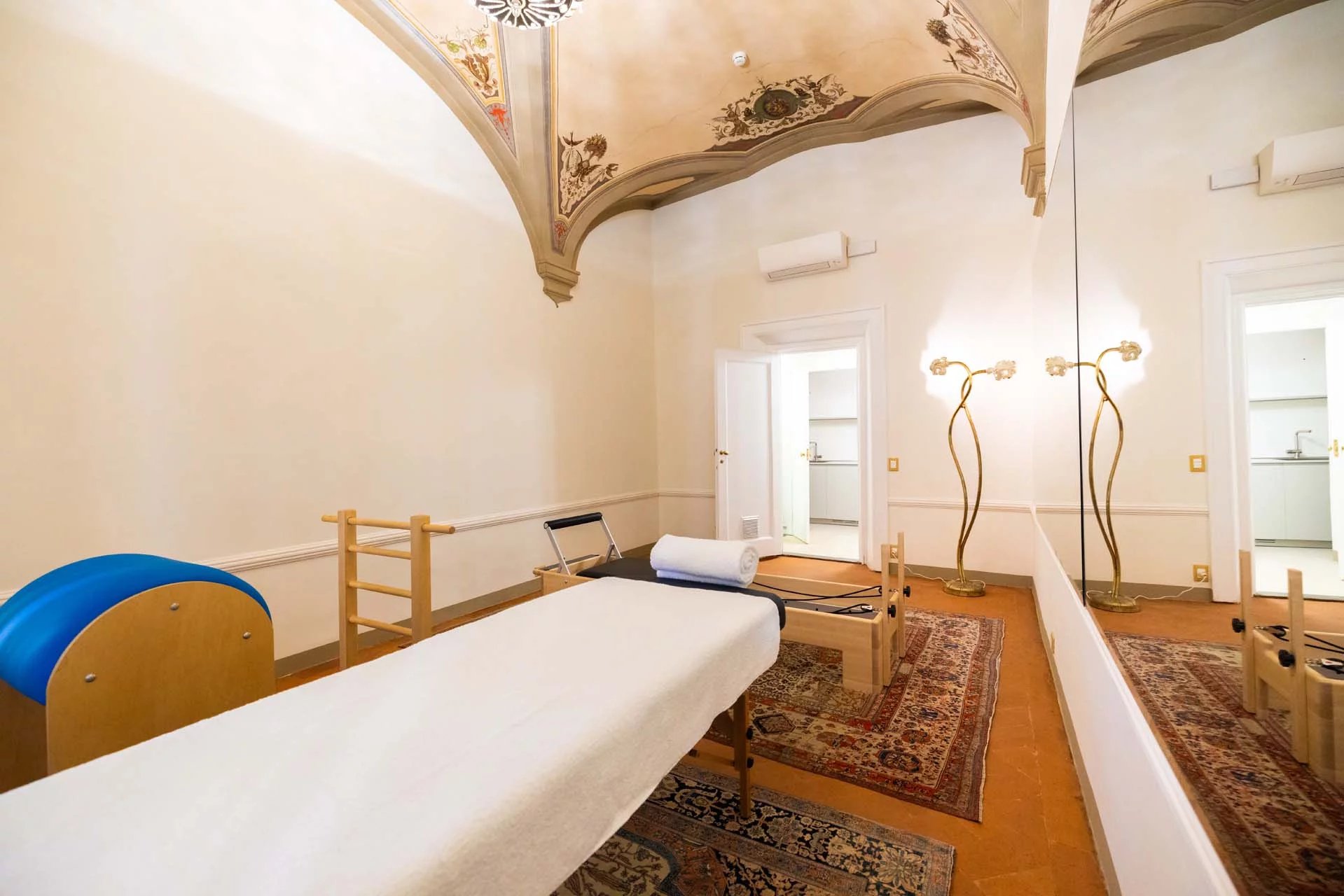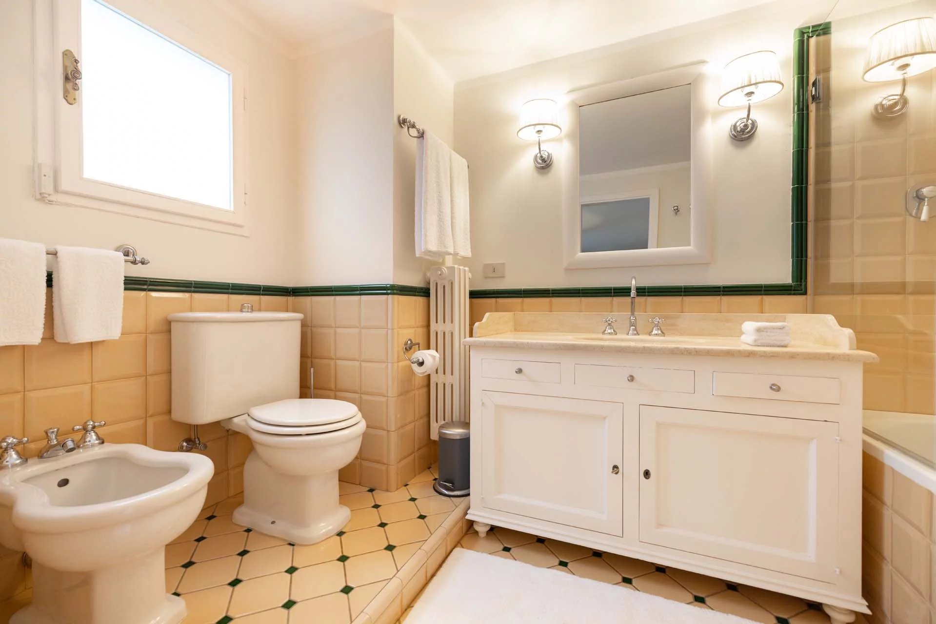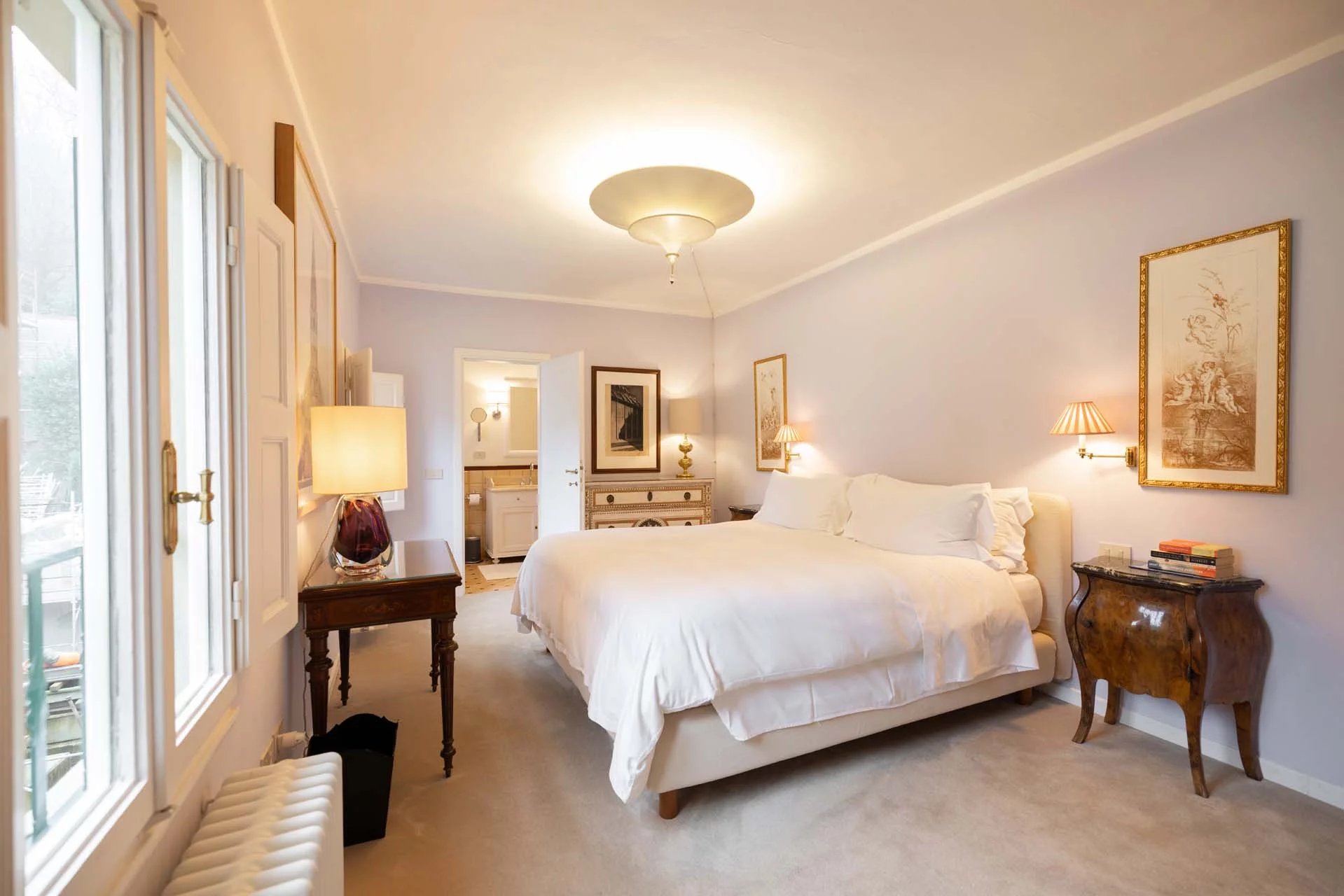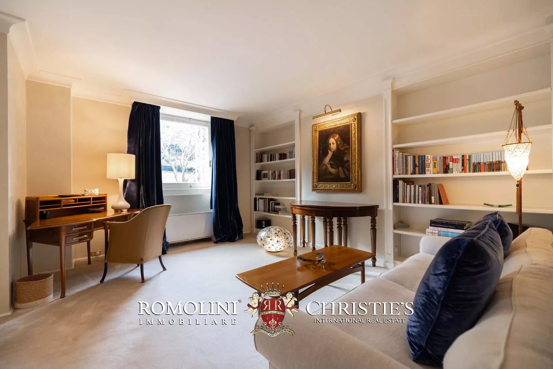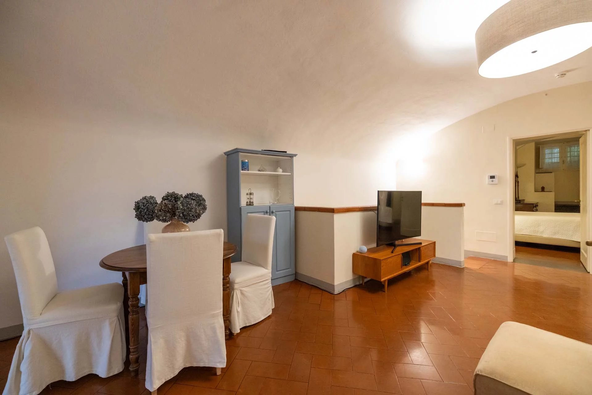 - Appartamento Giotto (147 m², 1 camera e 2 bagni): sempre al piano terra, l’unità è accessibile direttamente dalla strada o dall’androne condominiale e viene attualmente usata dai custodi della proprietà. Le due porte si aprono su un salotto con bagno, collegato posteriormente alla lavanderia. Salendo una scala interna si arriva alla sala da pranzo con annessa cucina e alla camera con bagno e cabina armadio.