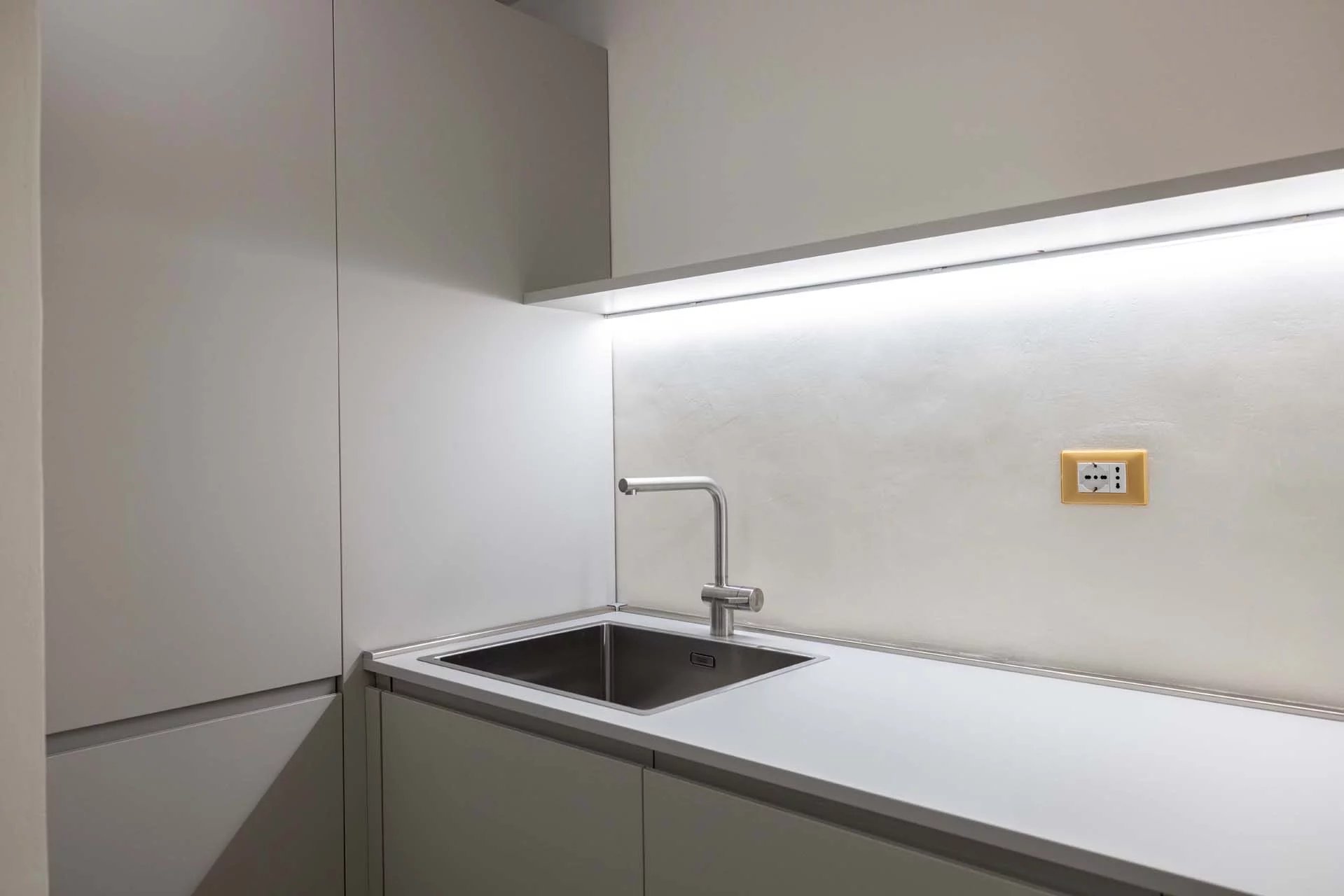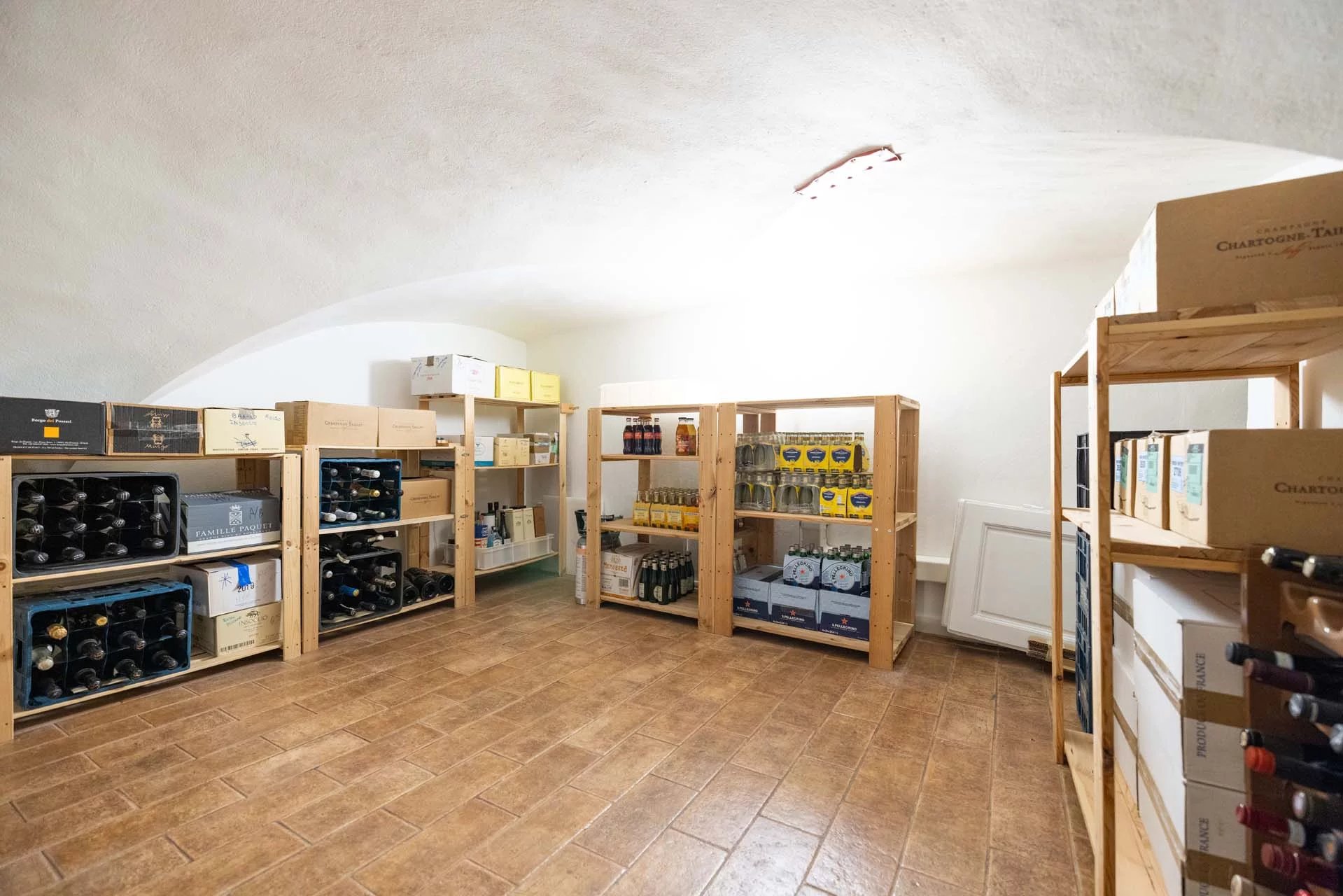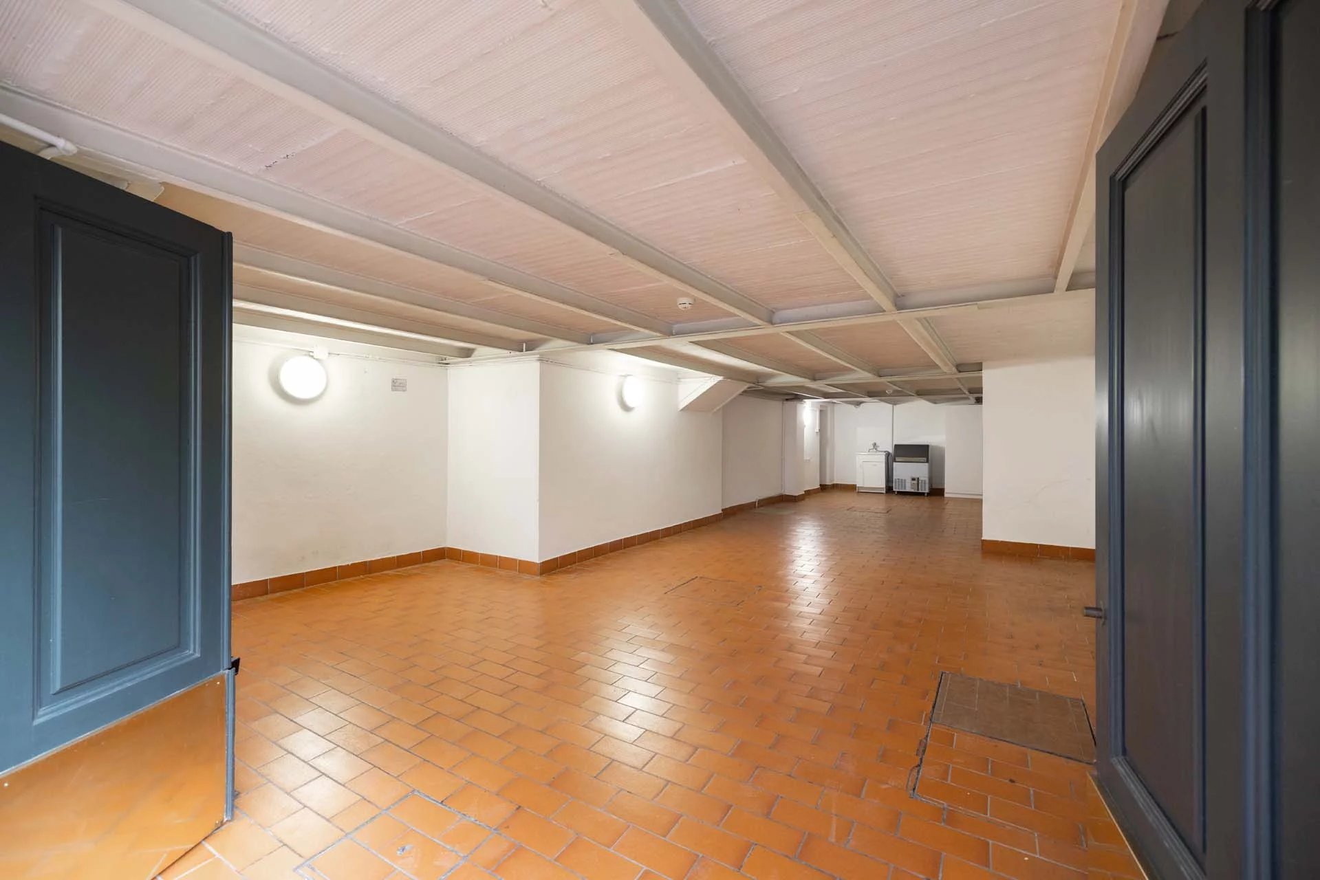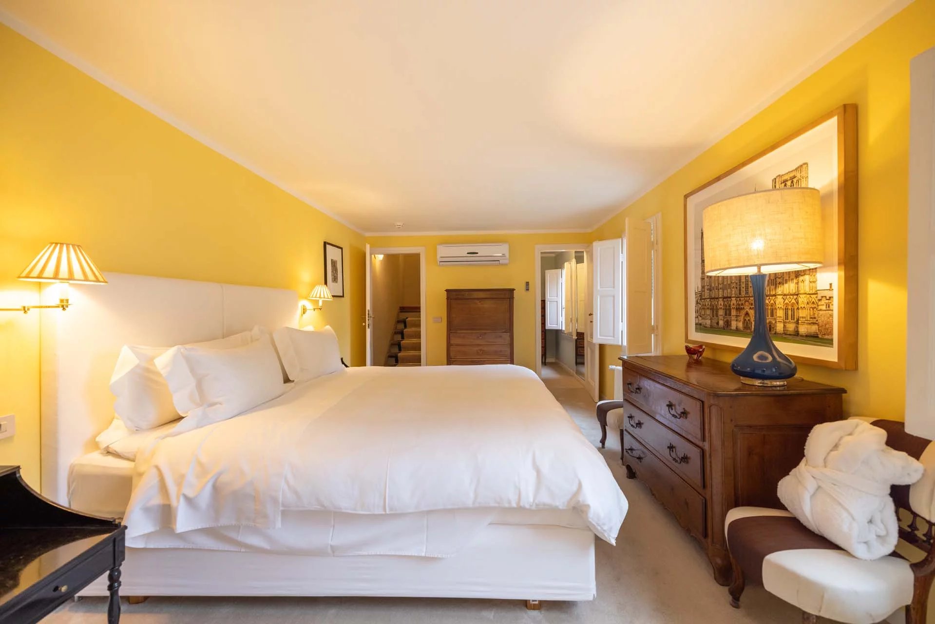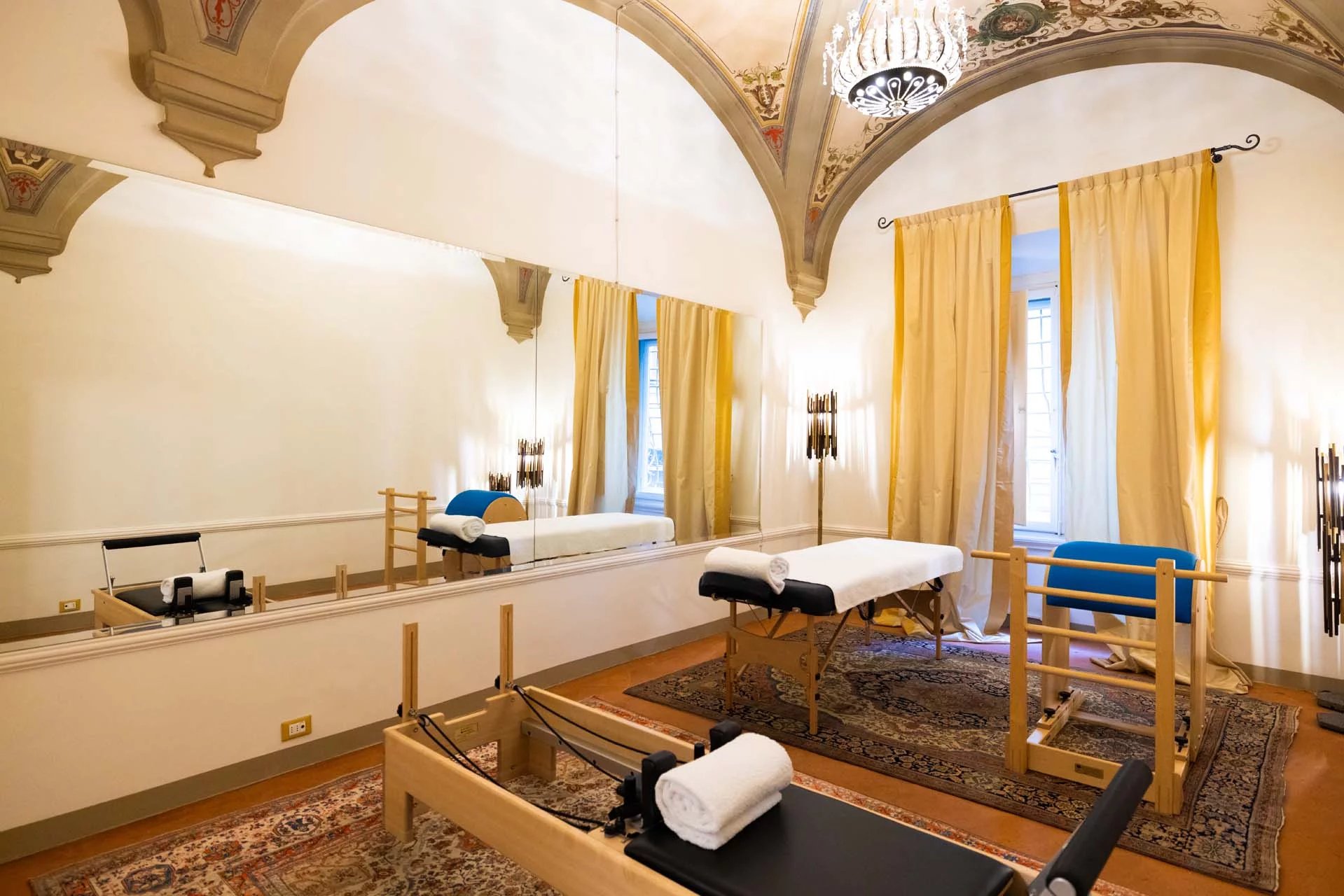 - Appartamento Giotto (147 m², 1 camera e 2 bagni): sempre al piano terra, l’unità è accessibile direttamente dalla strada o dall’androne condominiale e viene attualmente usata dai custodi della proprietà. Le due porte si aprono su un salotto con bagno, collegato posteriormente alla lavanderia. Salendo una scala interna si arriva alla sala da pranzo con annessa cucina e alla camera con bagno e cabina armadio.