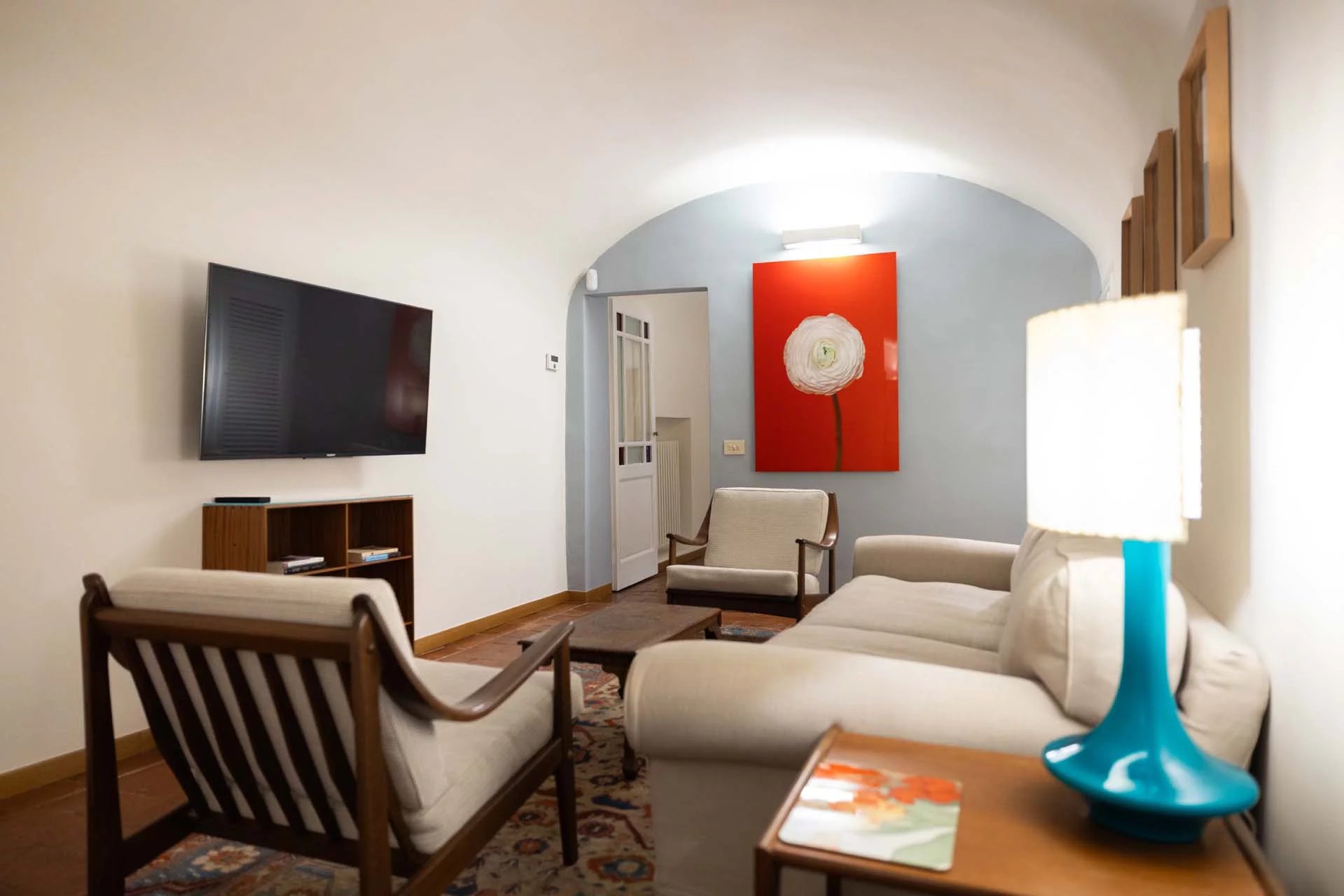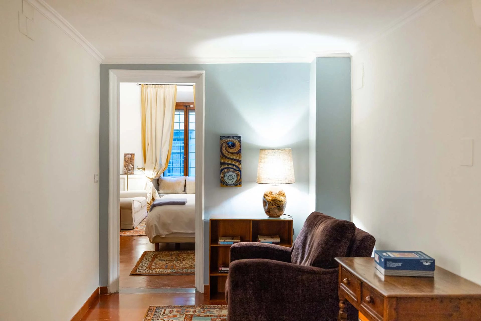 - Appartamento Raffaello (57 m², 1 camera e 1 bagno): la porta dell’appartamento si trova sul secondo pianerottolo della scala condominiale e si apre su un soggiorno con zona pranzo e cucinotto, collegato a sua volta alla camera (affacciata su Via de’ Bardi) e a un bagno.