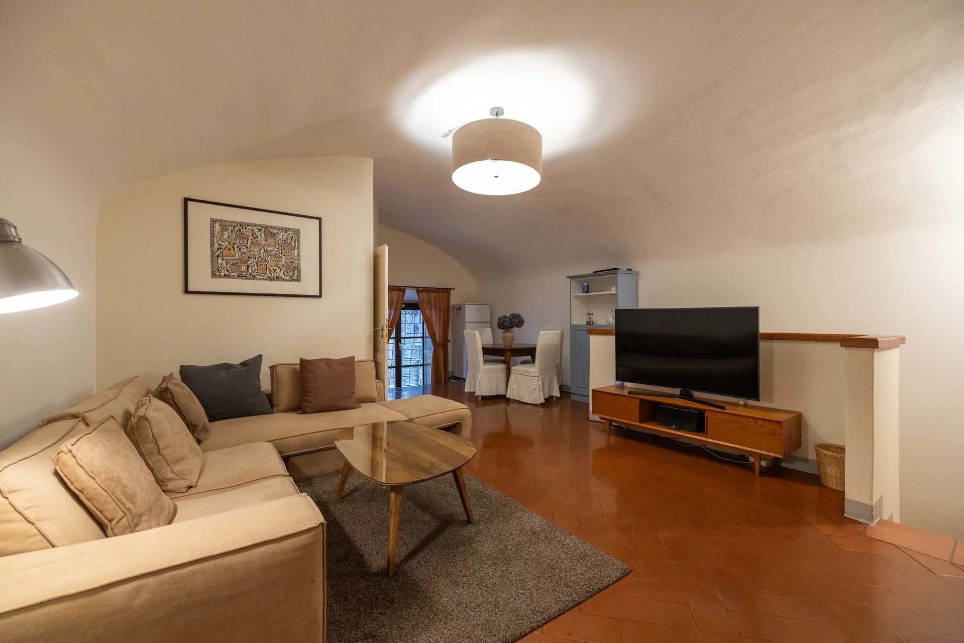- Appartamento Cimabue (116 m², 1 camera e 1 bagno): l’accesso a questa unità si trova sul primo pianerottolo dello scalone condominiale. Da qui un corridoio conduce al soggiorno/sala da pranzo con cucina e bagno. Oltre la zona giorno, affacciata su Via de’ Bardi, troviamo poi la camera. Subito prima di entrare nell’appartamento una porta secondaria conduce a una stanza che dà accesso al soppalco, costituito da vari locali ideali come magazzino e/o cantina per i vini.