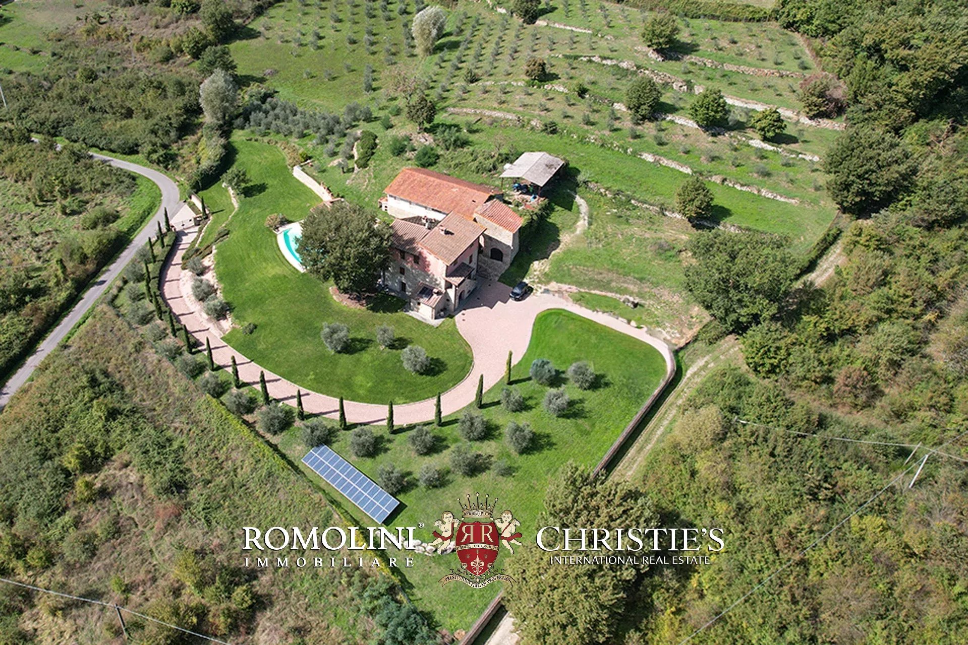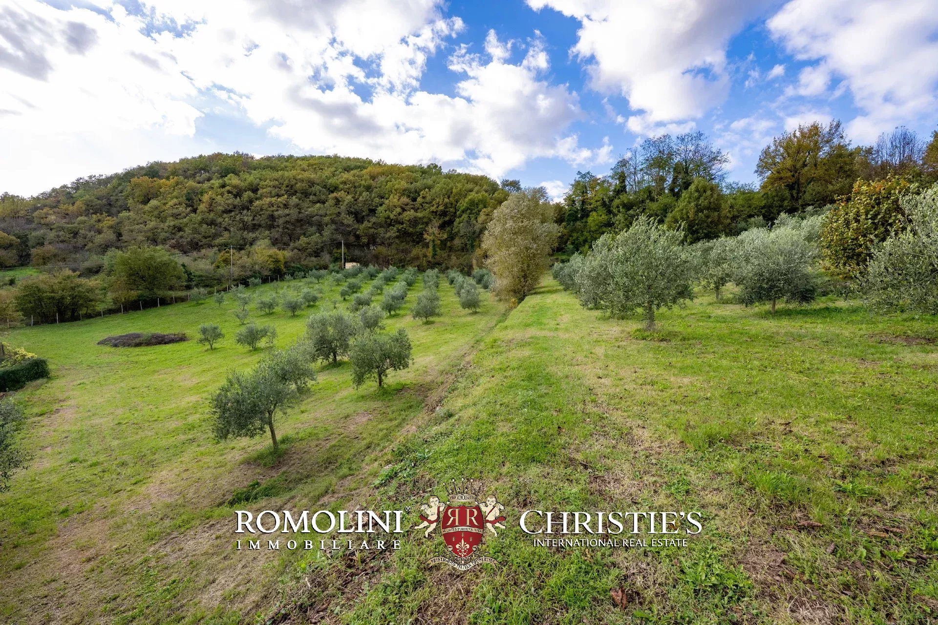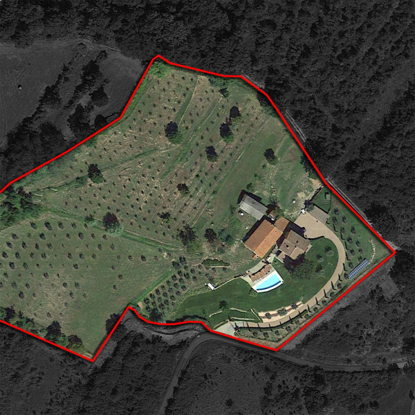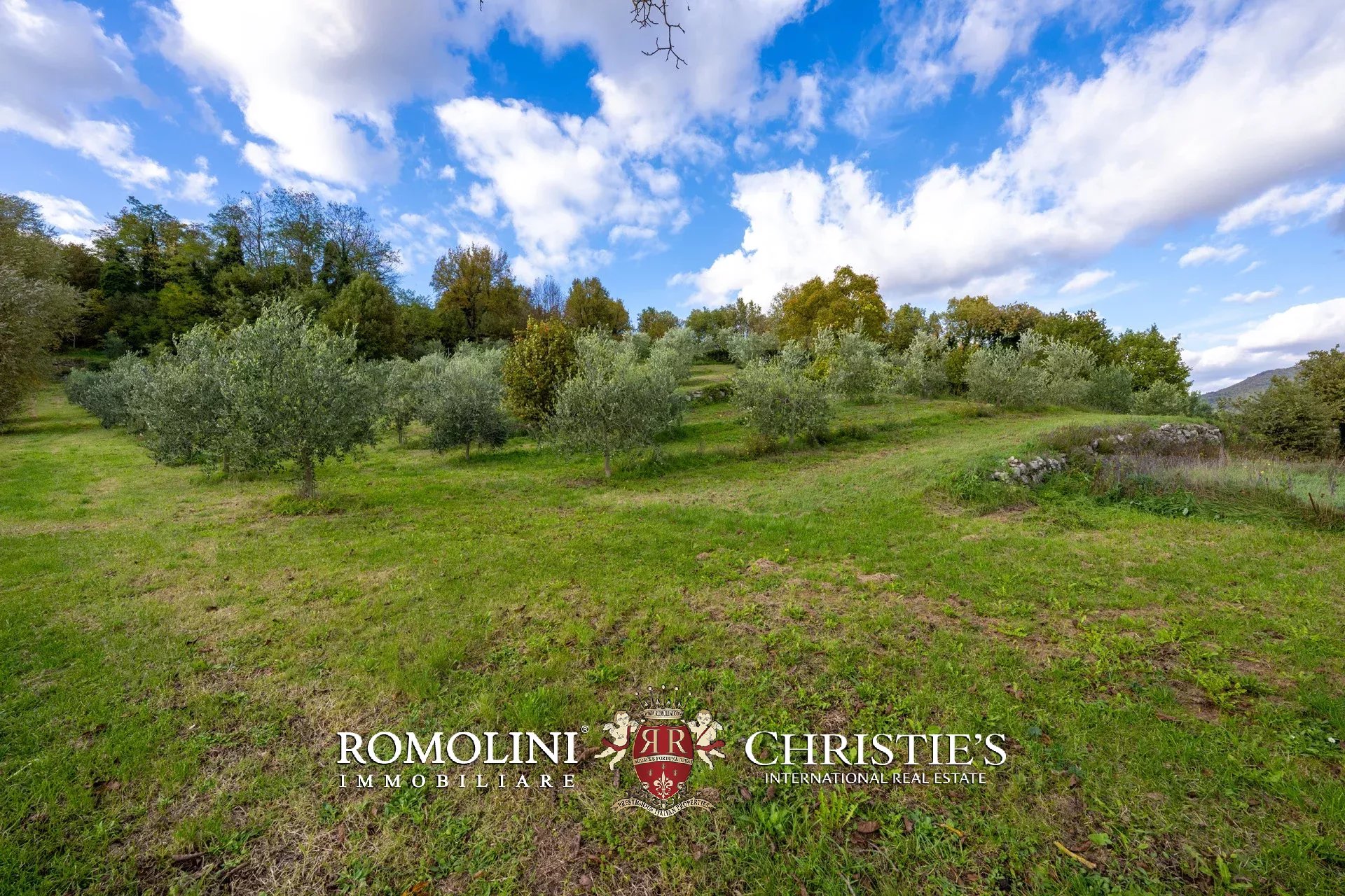 I terreni costituiscono un unico corpo recintato intorno alla casa di circa 2,3 ha, che includono un giardino ben curato (circa 7.900 m²) e un ampio oliveto (circa 320 piante). È presente una sorgente naturale e, sul lato a valle, è possibile aggiungere su richiesta circa 6.500 m² di seminativo.