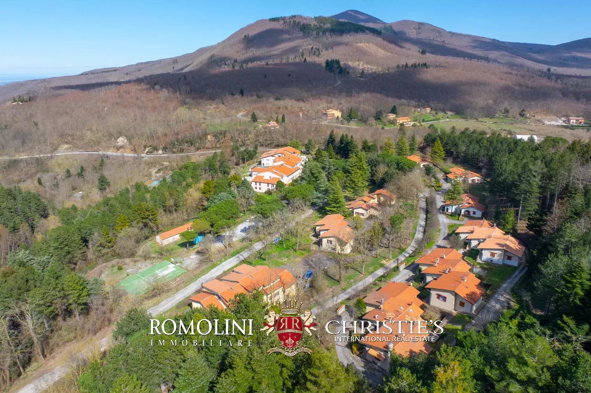 Il resort è circondato da un parco alberato di circa 47.000 m² che gira attorno agli edifici e scende poi lungo il pendio verso la piscina olimpica da ristrutturare. Il retro del resort è circondato da una siepe che assicura privacy e riservatezza agli ospiti. Non lontano dagli edifici c’è anche un campo sintetico da pallacanestro (convertibile per calcetto e/o tennis) con superficie da recuperare e rinnovare.
