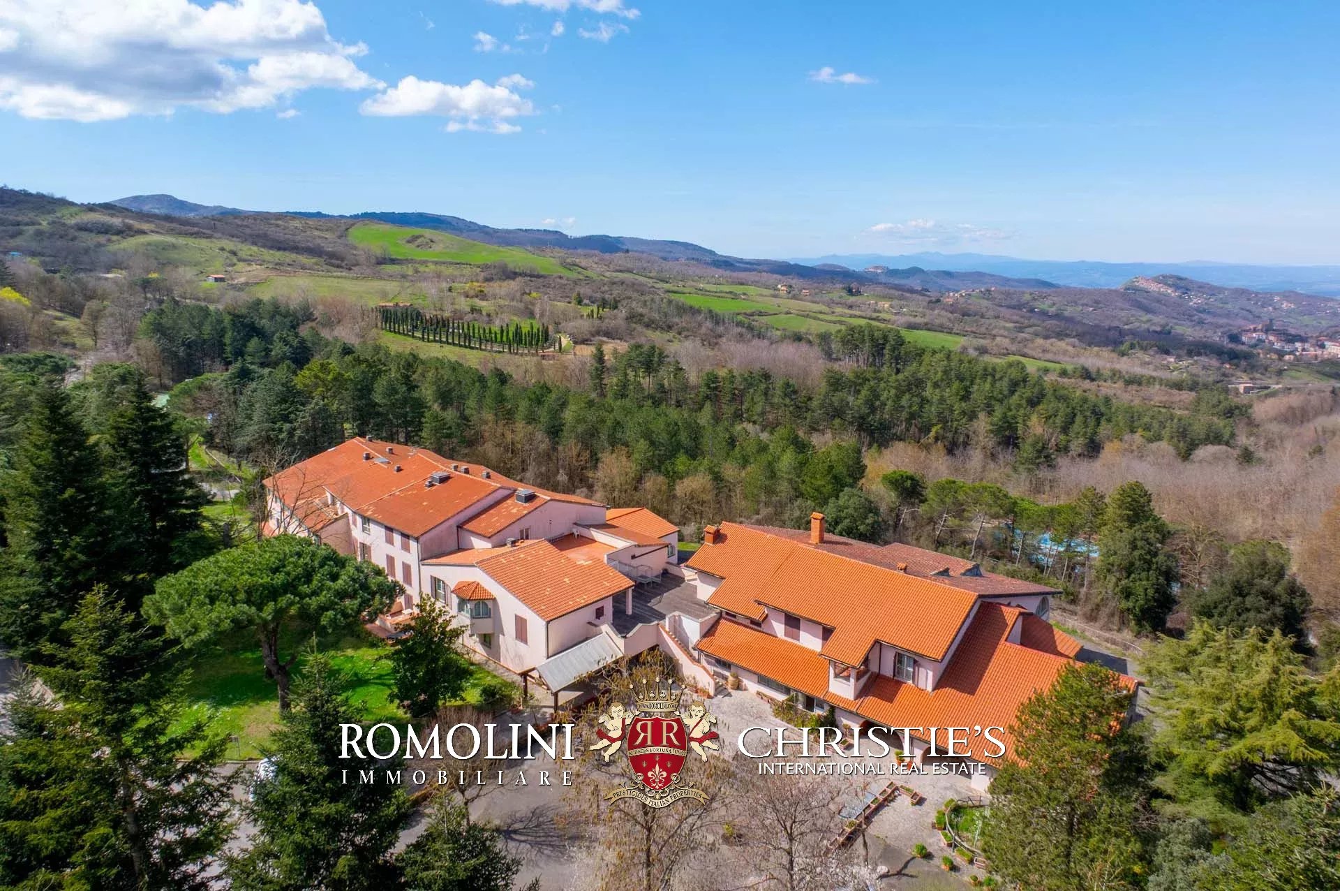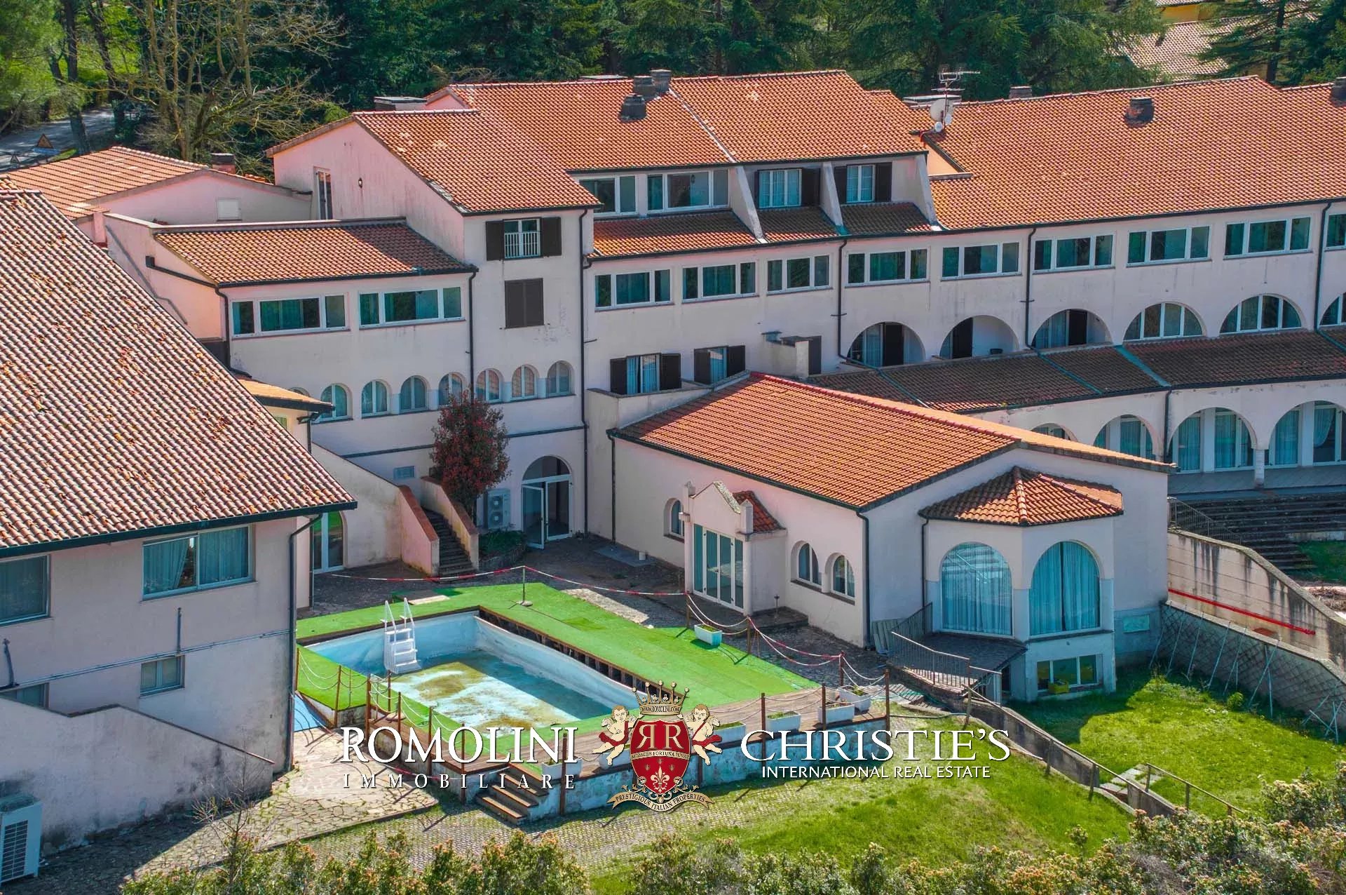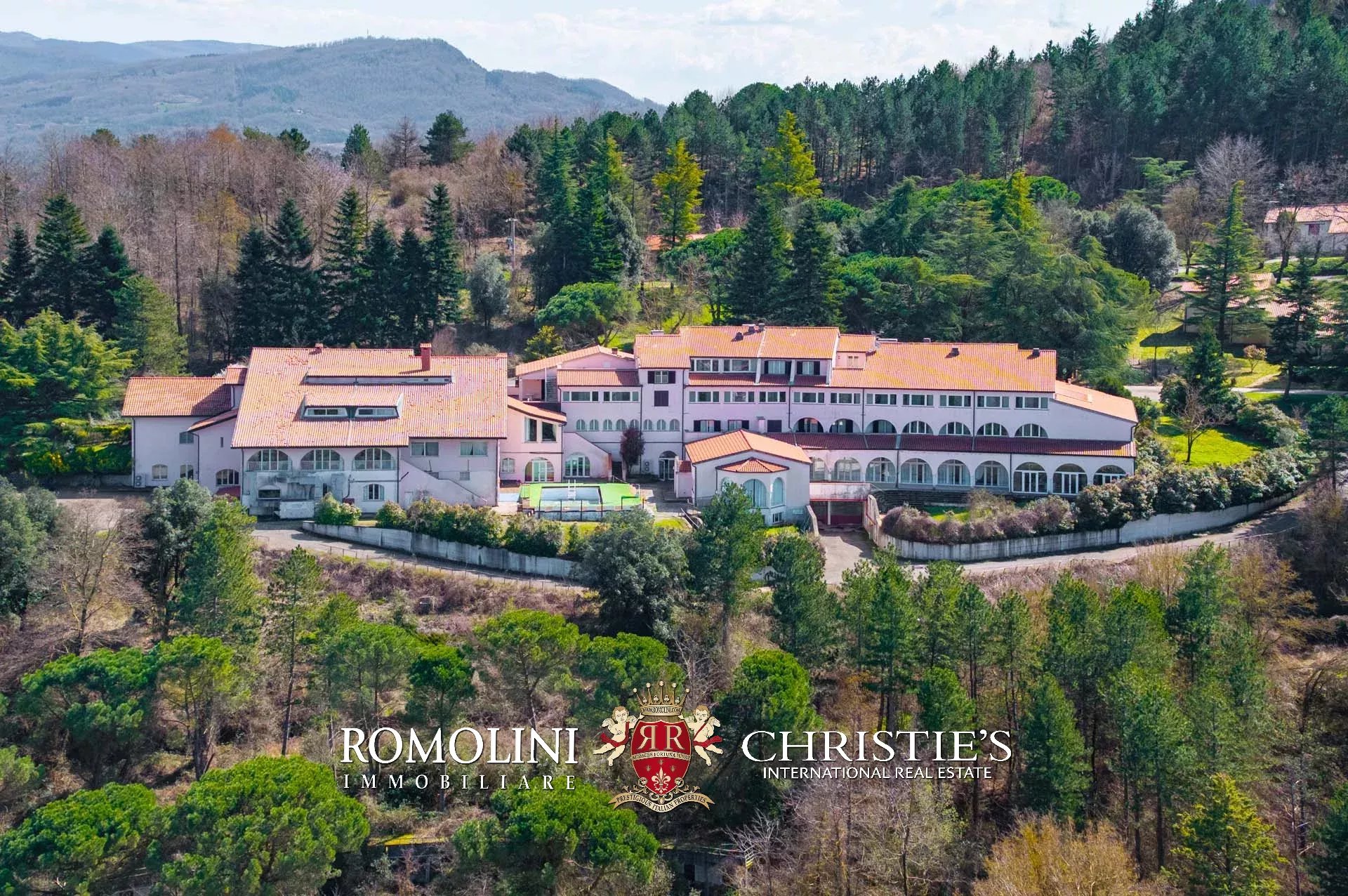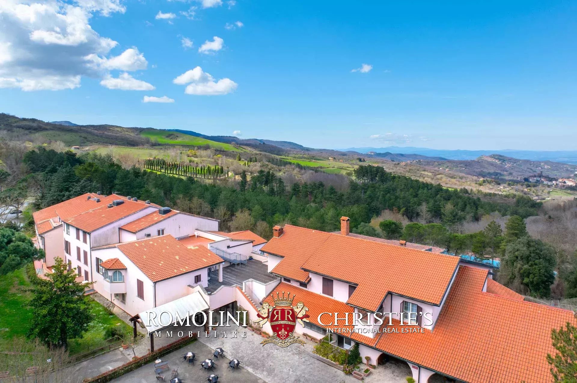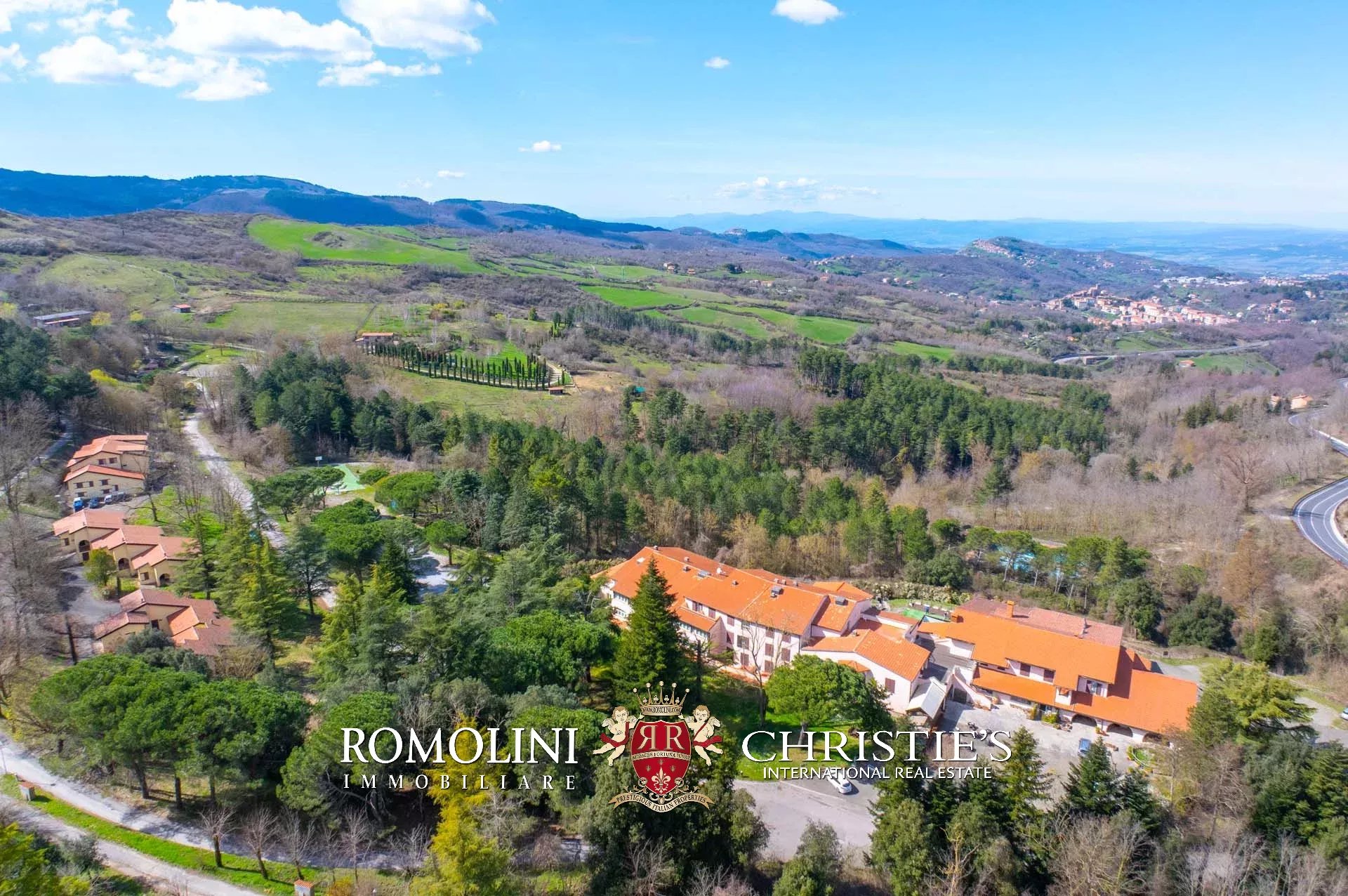 Sulle colline tra Val d’Orcia e Maremma, in posizione molto panoramica, resort con sorgente termale in vendita. La proprietà (oltre 7.500 m²) include 108 camere per gli ospiti, centro benessere, ristorante, piscina olimpica e maneggio per cavalli, ed è circondata da oltre 40.000 m² di parco alberato con aree relax. Tutto attorno, altri 18,4 ha di terreno sono coperti prevalentemente di alberi e assicurano zone ombreggiate in cui rilassarsi in estate.