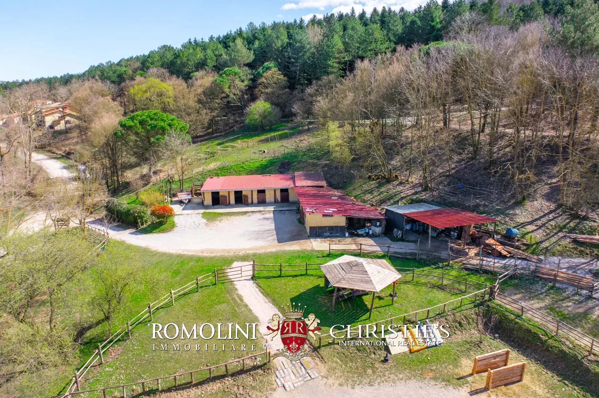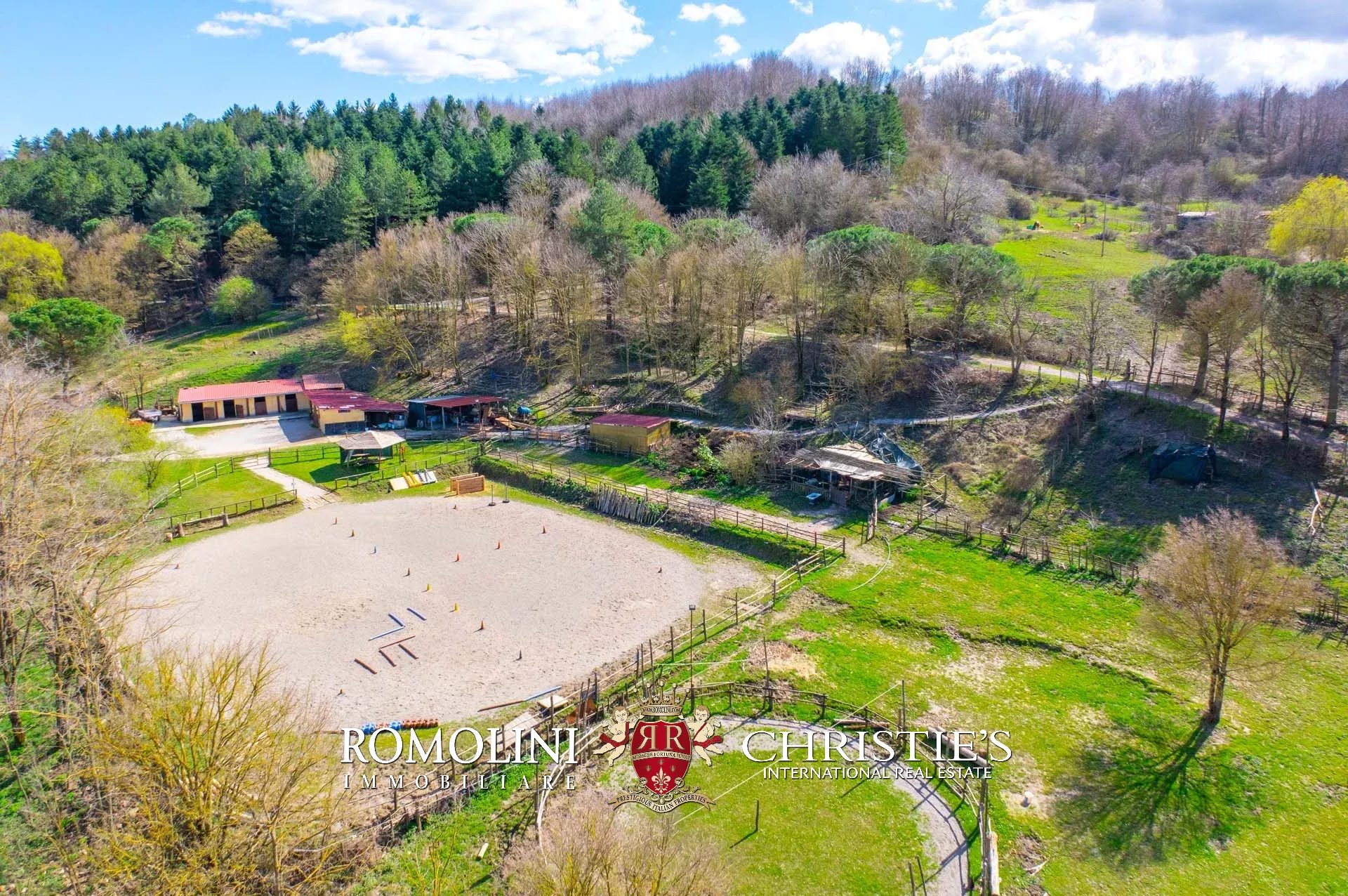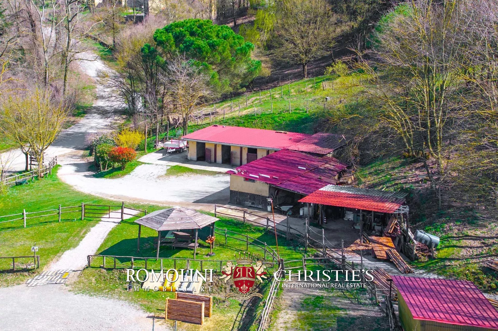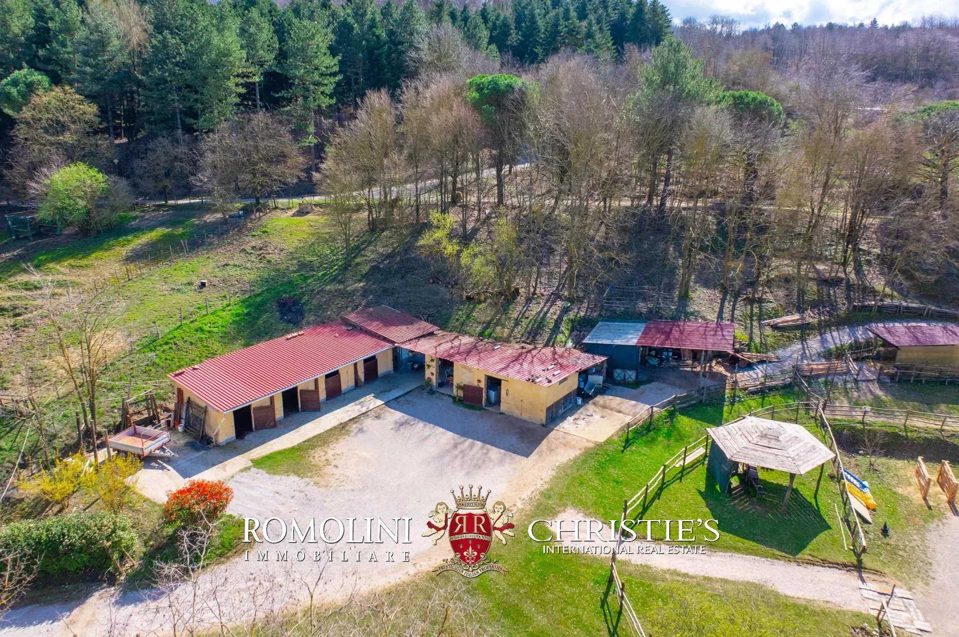 Allontanandosi dagli edifici la proprietà continua per circa 18,4 ettari con prati, terreni seminativi e aree boschive. Parte del seminativo, posto in zona pianeggiante, è stato usato per la realizzazione delle strutture del maneggio (stalle e paddock).