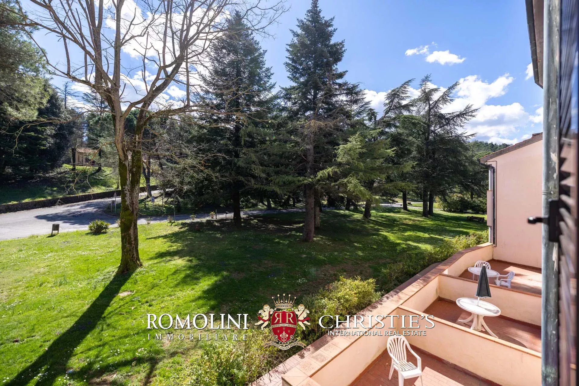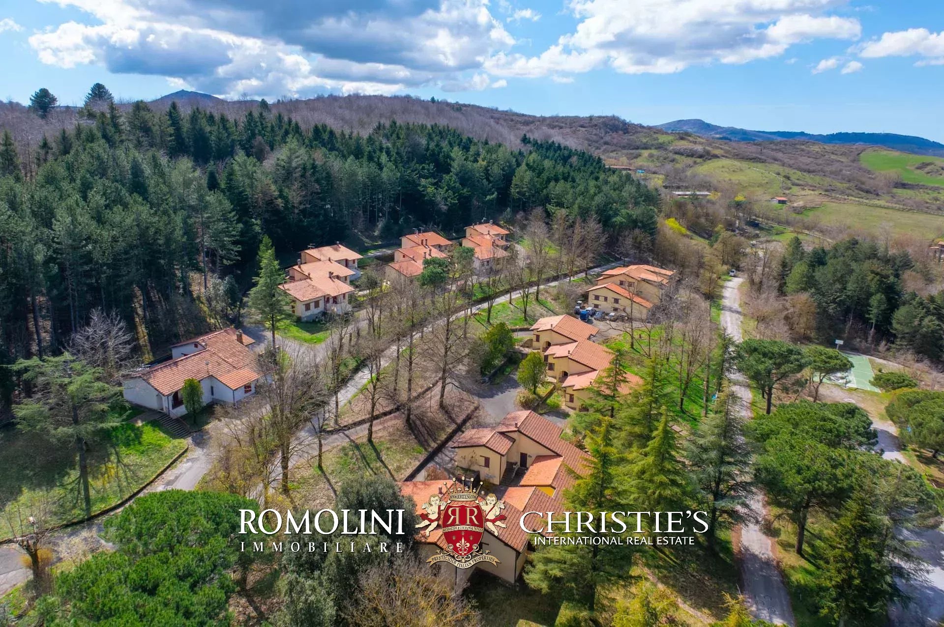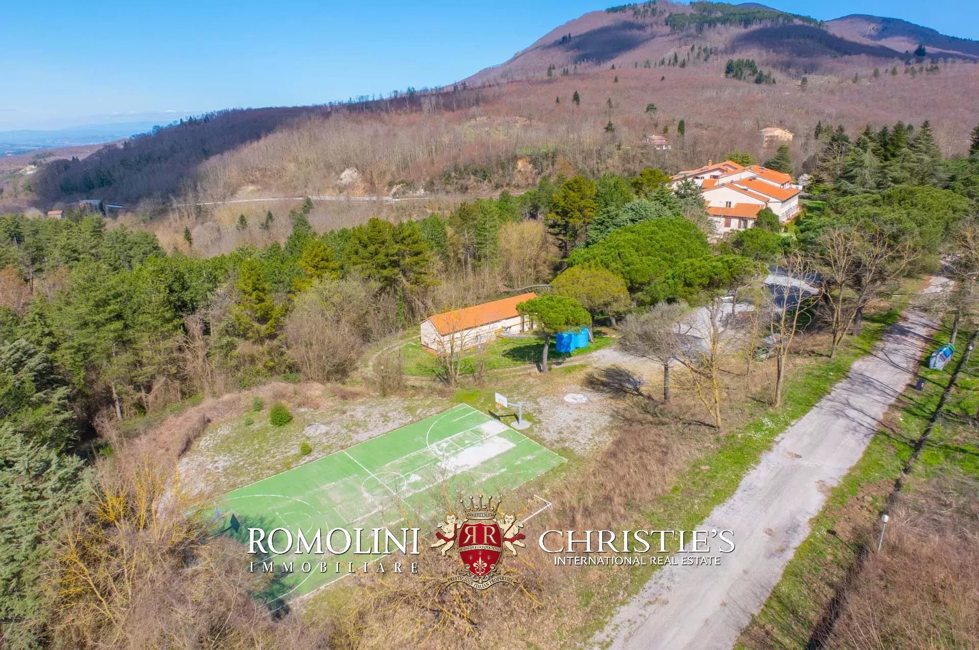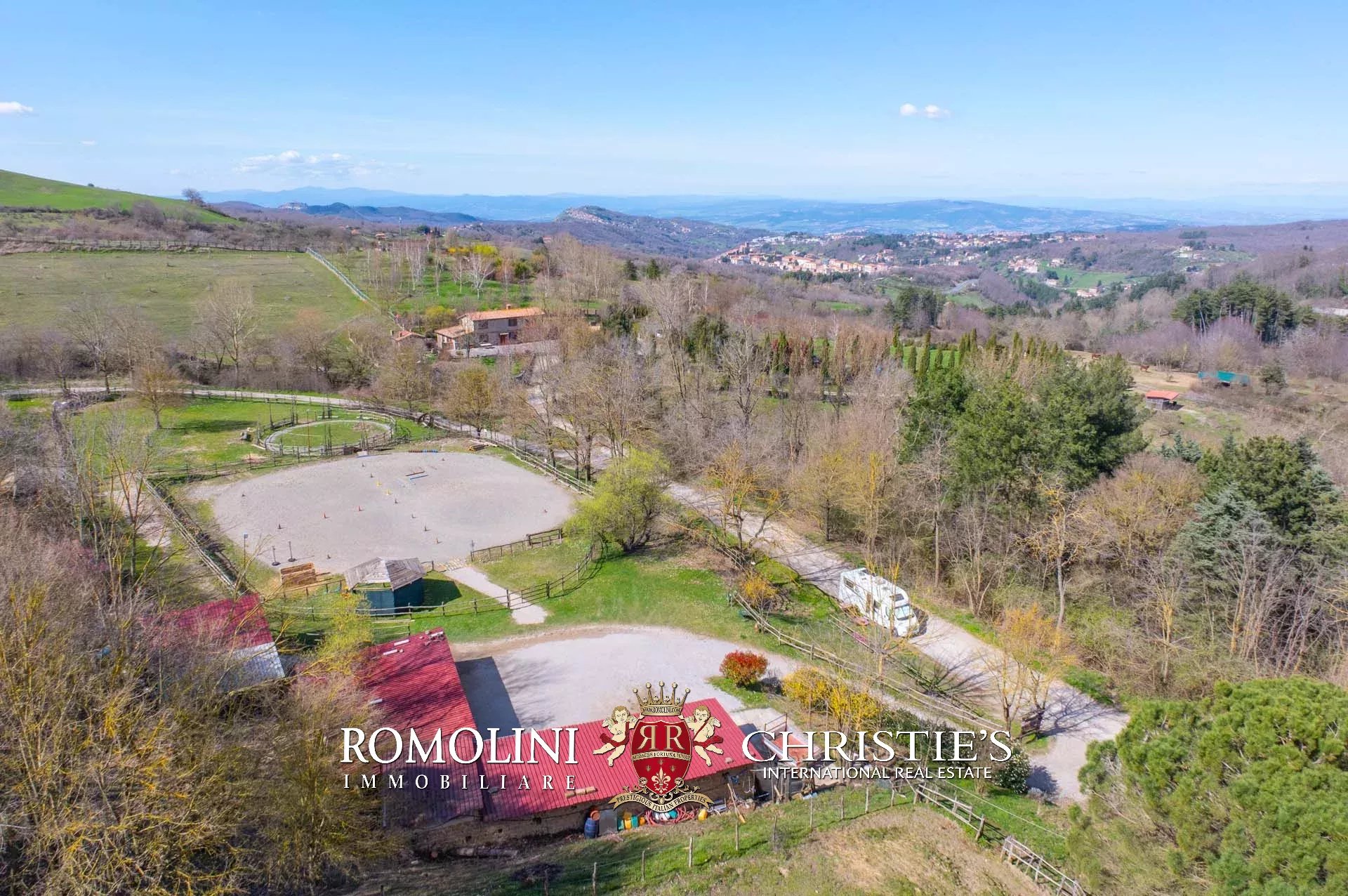 Allontanandosi dagli edifici la proprietà continua per circa 18,4 ettari con prati, terreni seminativi e aree boschive. Parte del seminativo, posto in zona pianeggiante, è stato usato per la realizzazione delle strutture del maneggio (stalle e paddock).