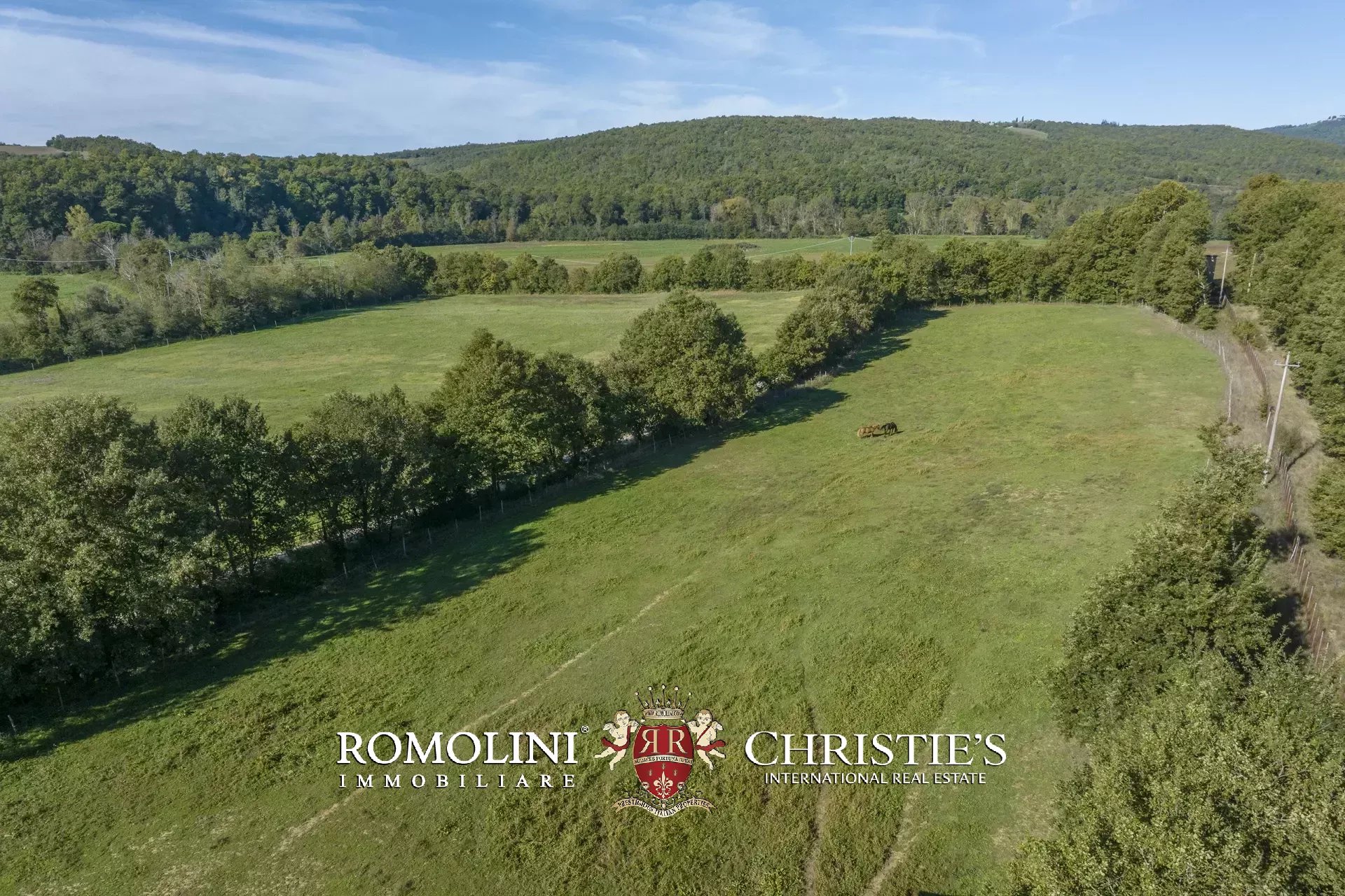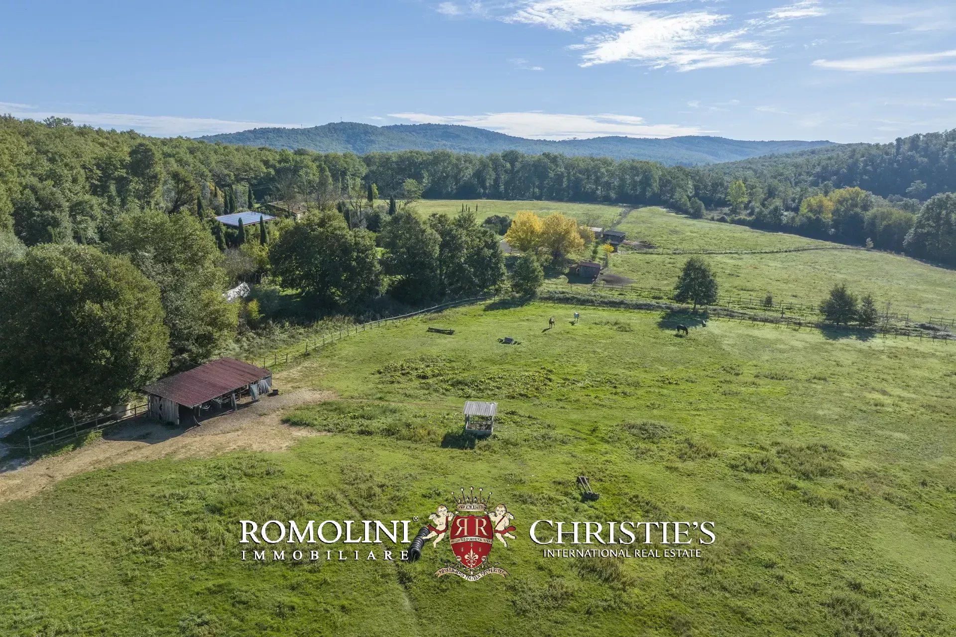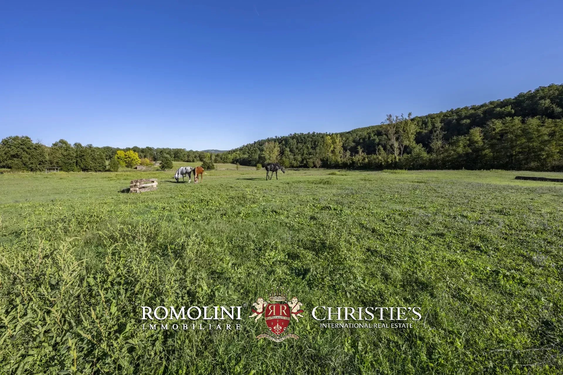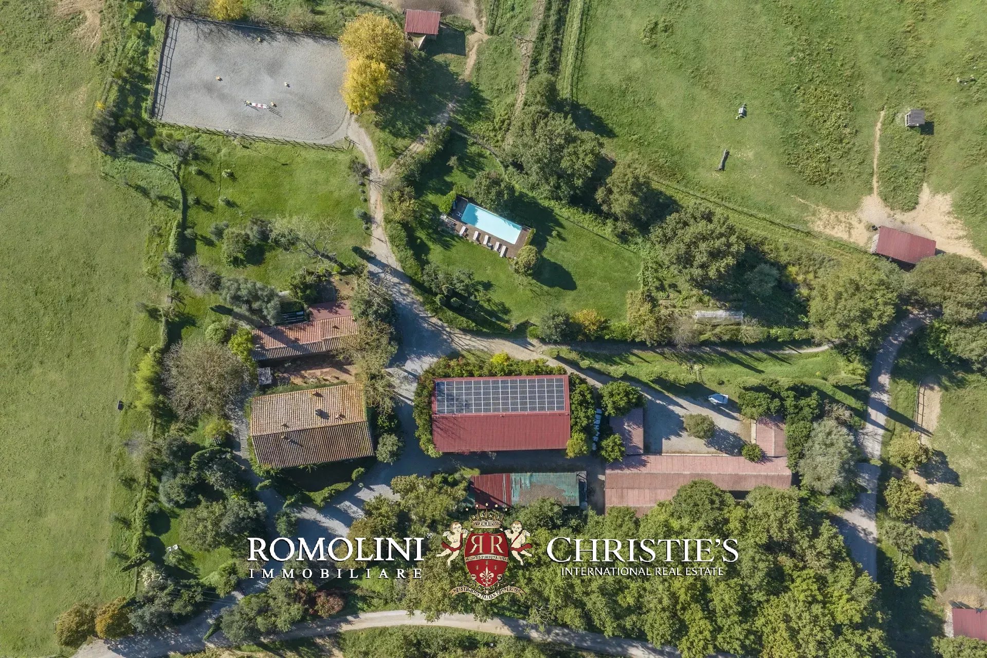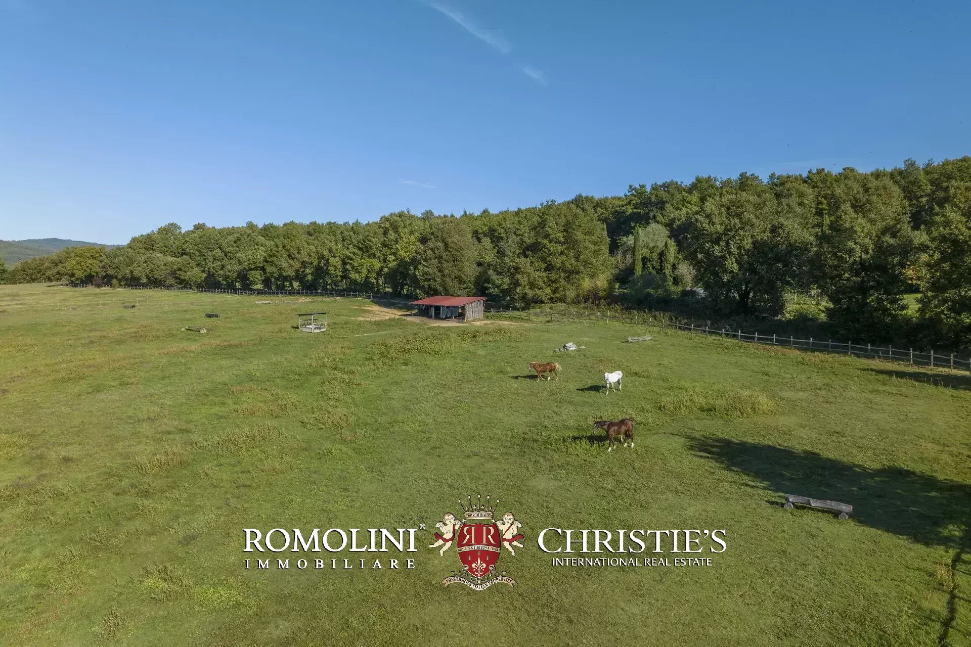 La proprietà è costituita da un unico corpo aziendale di 16,2 ettari composto per la quasi totalità da pascoli attrezzati recintati per cavalli o paddock (circa 15 ha). Gli edifici residenziali e il centro equestre sono raggruppati in una posizione riparata a nord dai boschi collinari e completamente aperta a sud, dove i pascoli digradano lentamente verso il torrente che attraversa la valle.