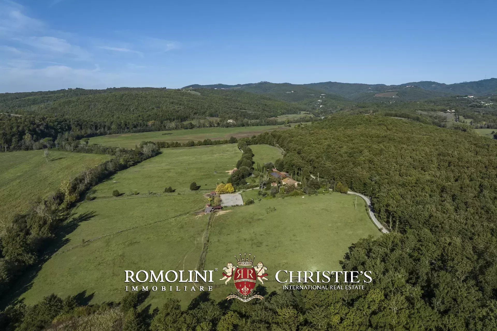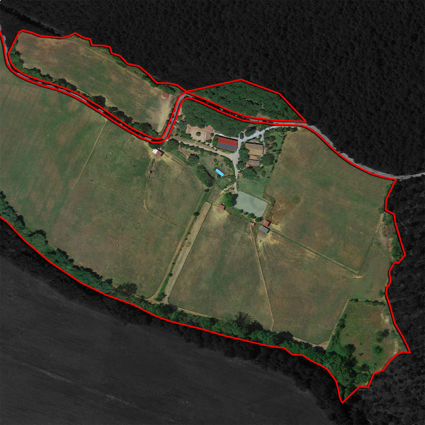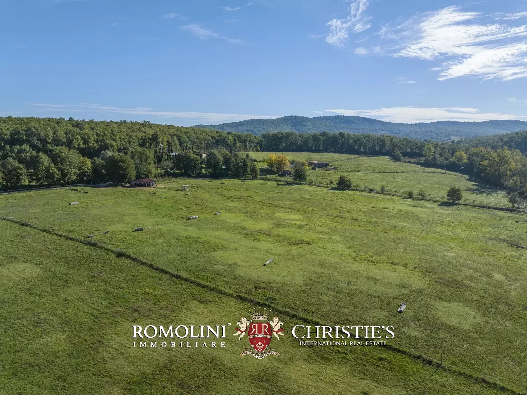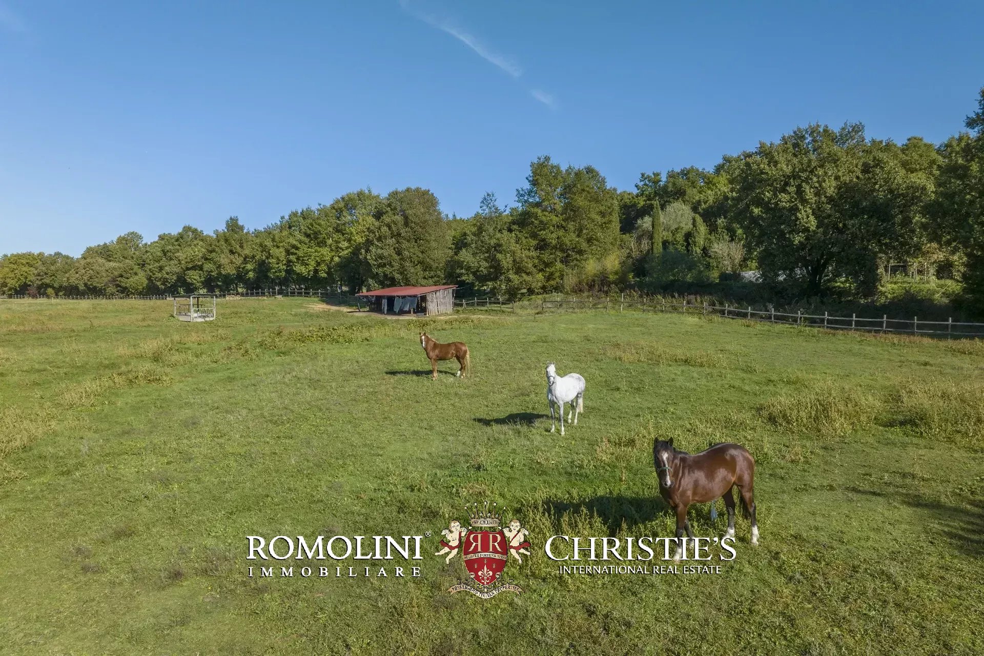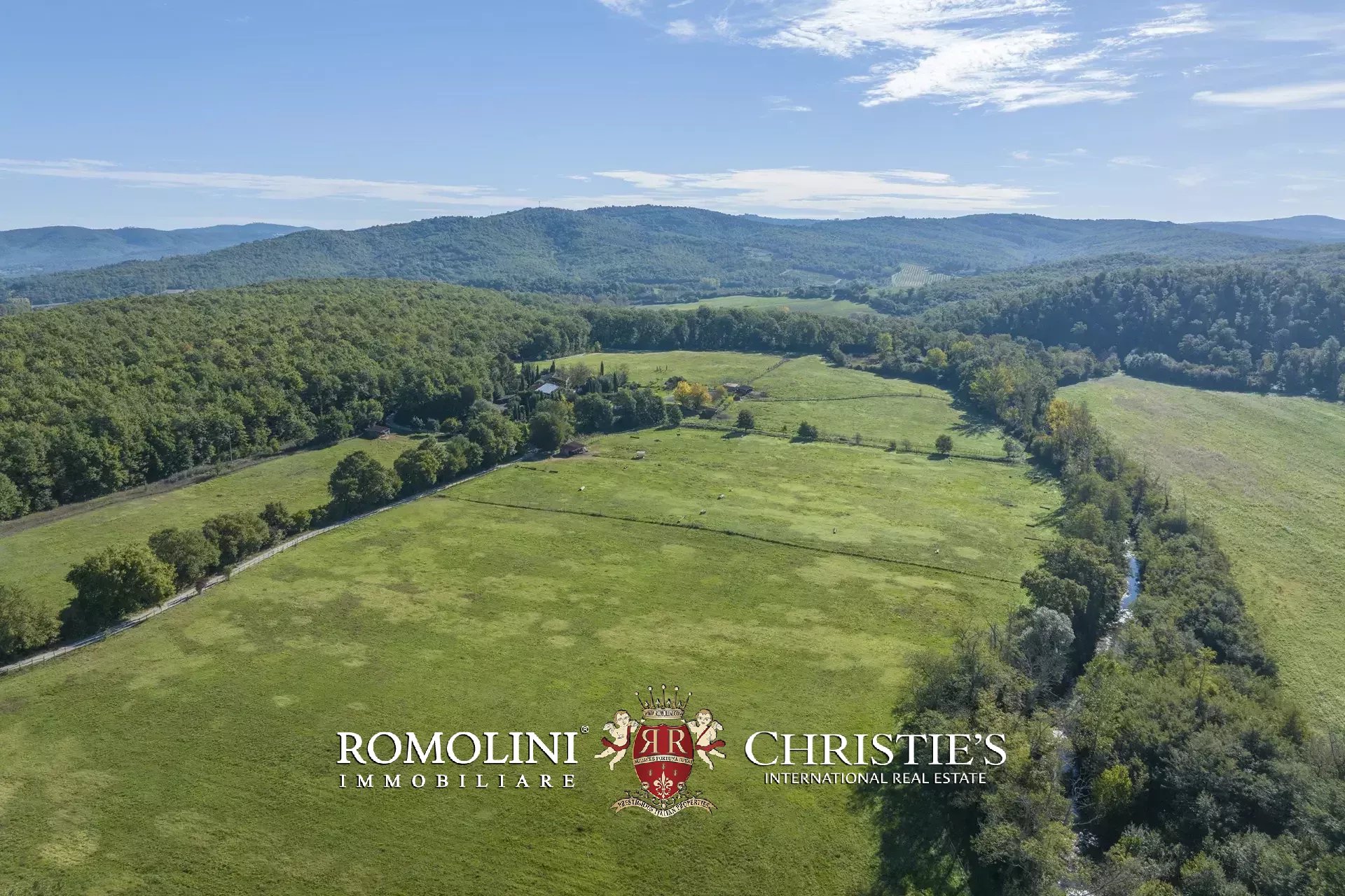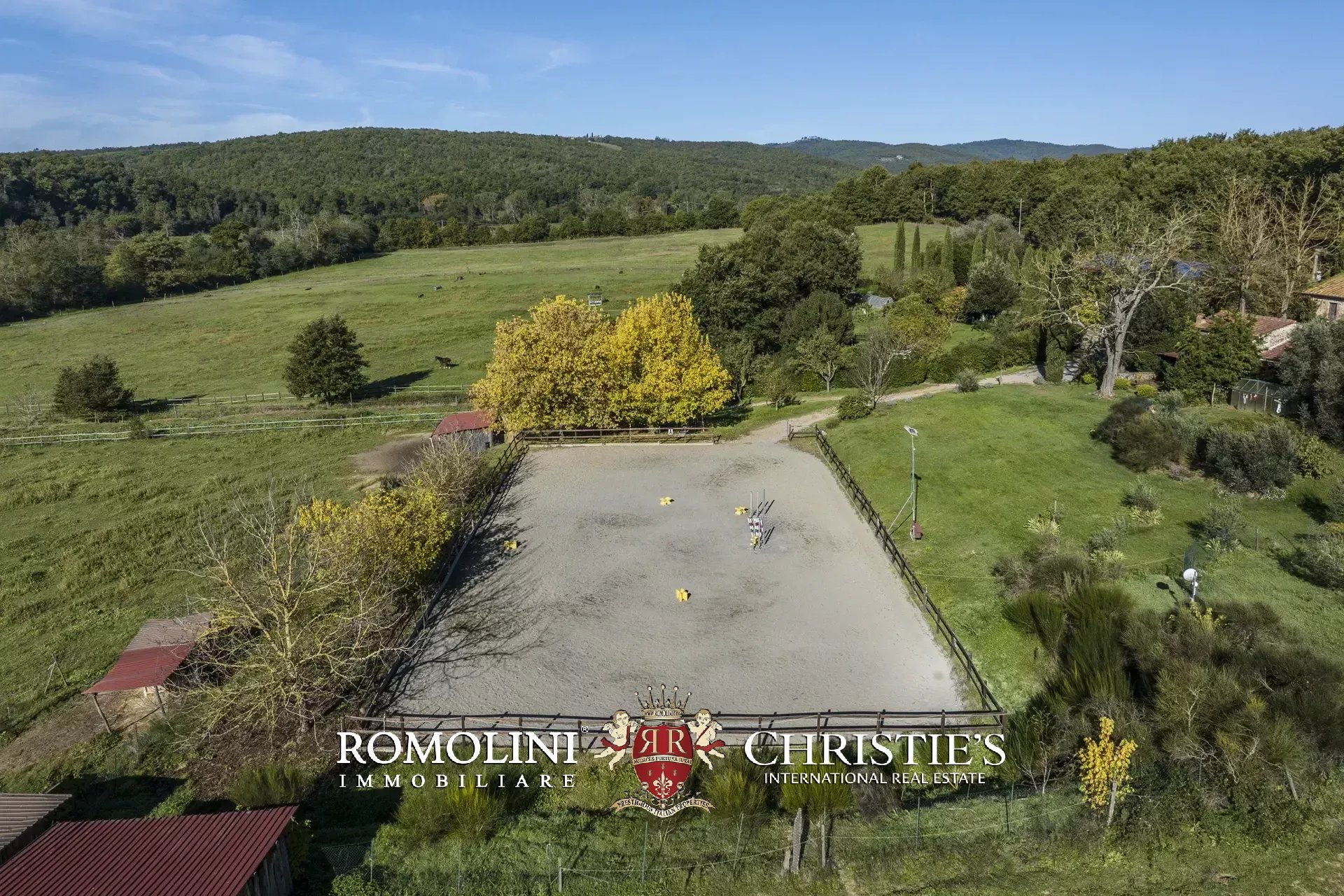 La proprietà è costituita da un unico corpo aziendale di 16,2 ettari composto per la quasi totalità da pascoli attrezzati recintati per cavalli o paddock (circa 15 ha). Gli edifici residenziali e il centro equestre sono raggruppati in una posizione riparata a nord dai boschi collinari e completamente aperta a sud, dove i pascoli digradano lentamente verso il torrente che attraversa la valle.