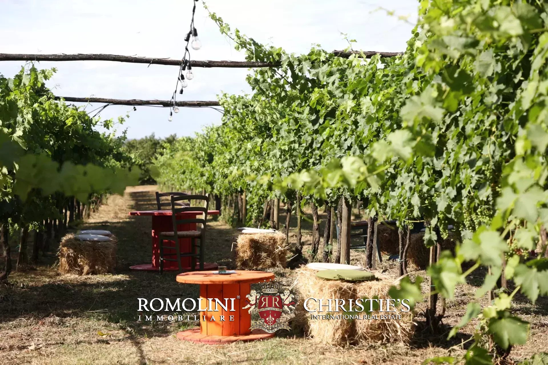 L’azienda si estende su circa 13,0 ettari complessivi, di cui 9,2 ha vitati, condotti in regime biologico, e gode di un contesto naturale integro e suggestivo. I vigneti beneficiano di condizioni pedoclimatiche particolarmente favorevoli, che consentono produzioni di qualità costante e una buona diversificazione varietale. Il parco viticolo include sia vitigni italiani quali Sangiovese (12,1%), Malvasia (10,1%), Montepulciano (6,8%) e Trebbiano (5,6%), sia varietà internazionali quali Merlot (25,6%), Chardonnay (15,2%), Sauvignon Blanc (12,7%), Pinot Bianco (6,1%) e Cabernet Sauvignon (5,8%), offrendo una gamma produttiva ampia e flessibile.