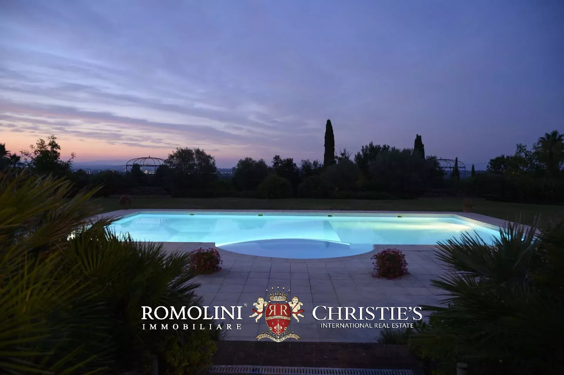 La villa è corredata da un parco di 22.000 m² punteggiato di piante ornamentali ed elementi decorativi. A breve distanza dagli edifici si trova la piscina 18 × 8 m con solarium in pietra bianca. Il parco è anche la cornice perfetta per eventi e cerimonie, grazie a superfici prevalentemente pianeggianti e con vista sulla campagna circostante.