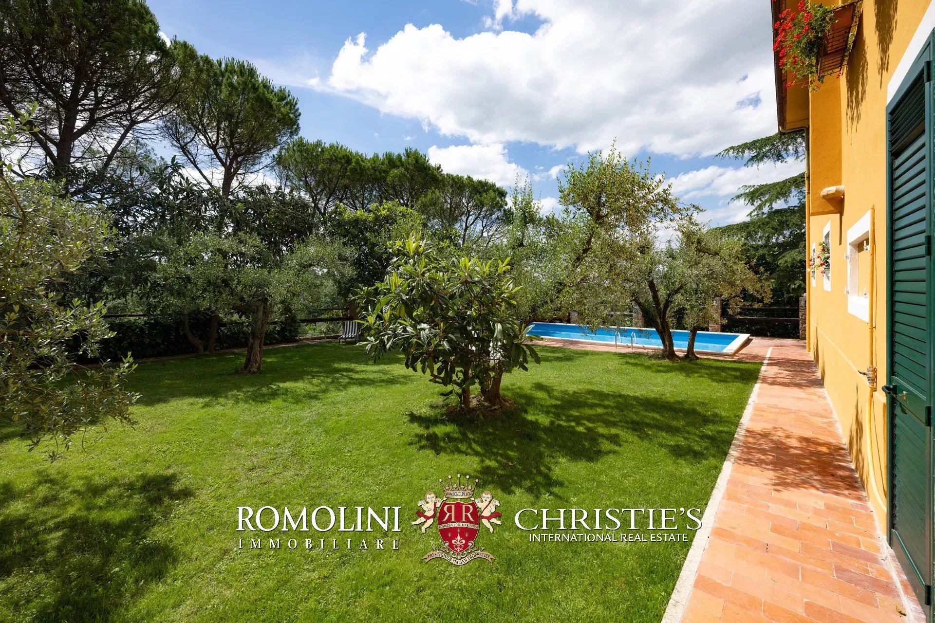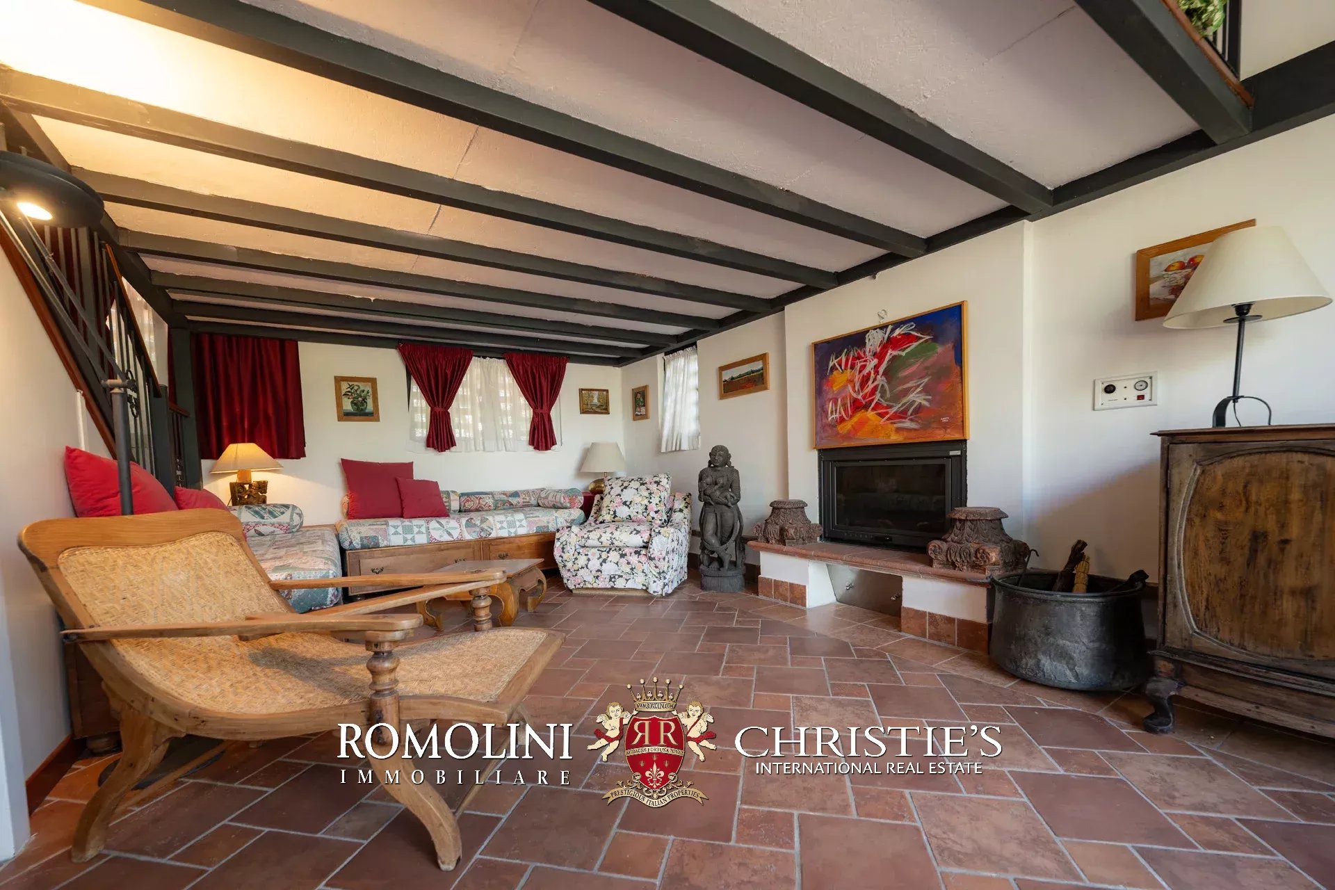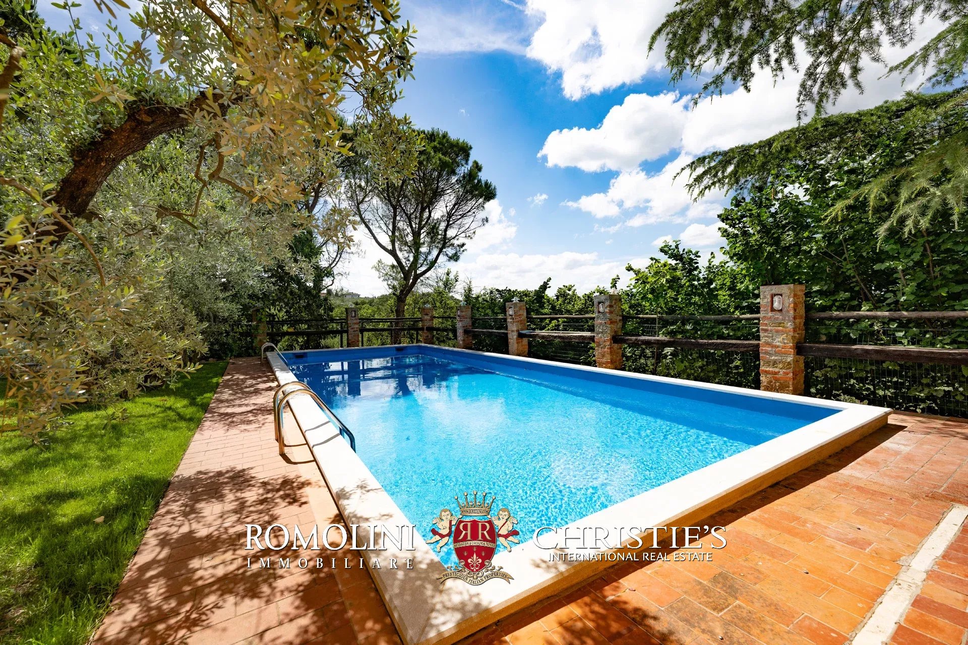 Posta al centro del borgo, la villa è circondata dal giardino (2.200 m²) dove trova posto la piscina 13 × 5 m da cui si ha una splendida vista panoramica. Direttamente dal giardino dove è presente la piscina si accede a un servizio esterno con doccia e locale sauna. Da un loggiato adiacente è stato ricavato un ambiente dedicato al fitness.