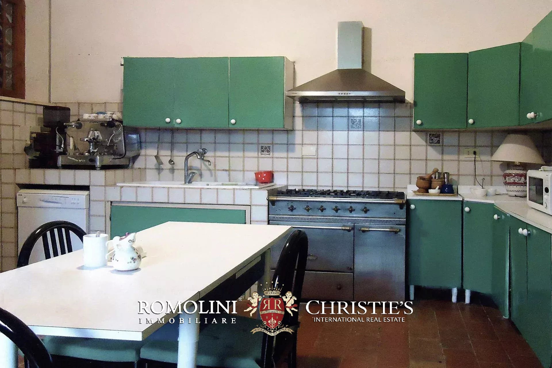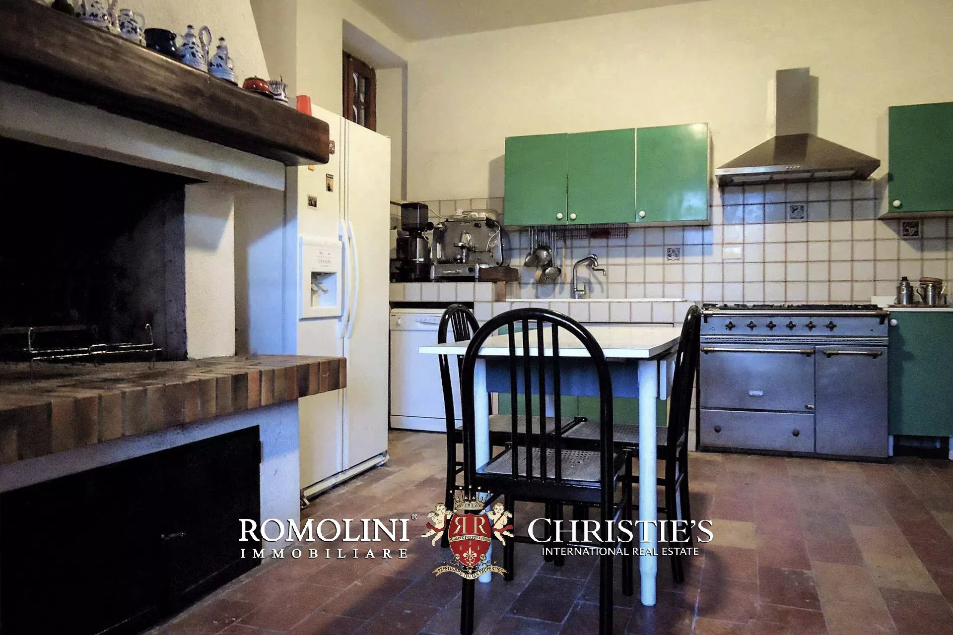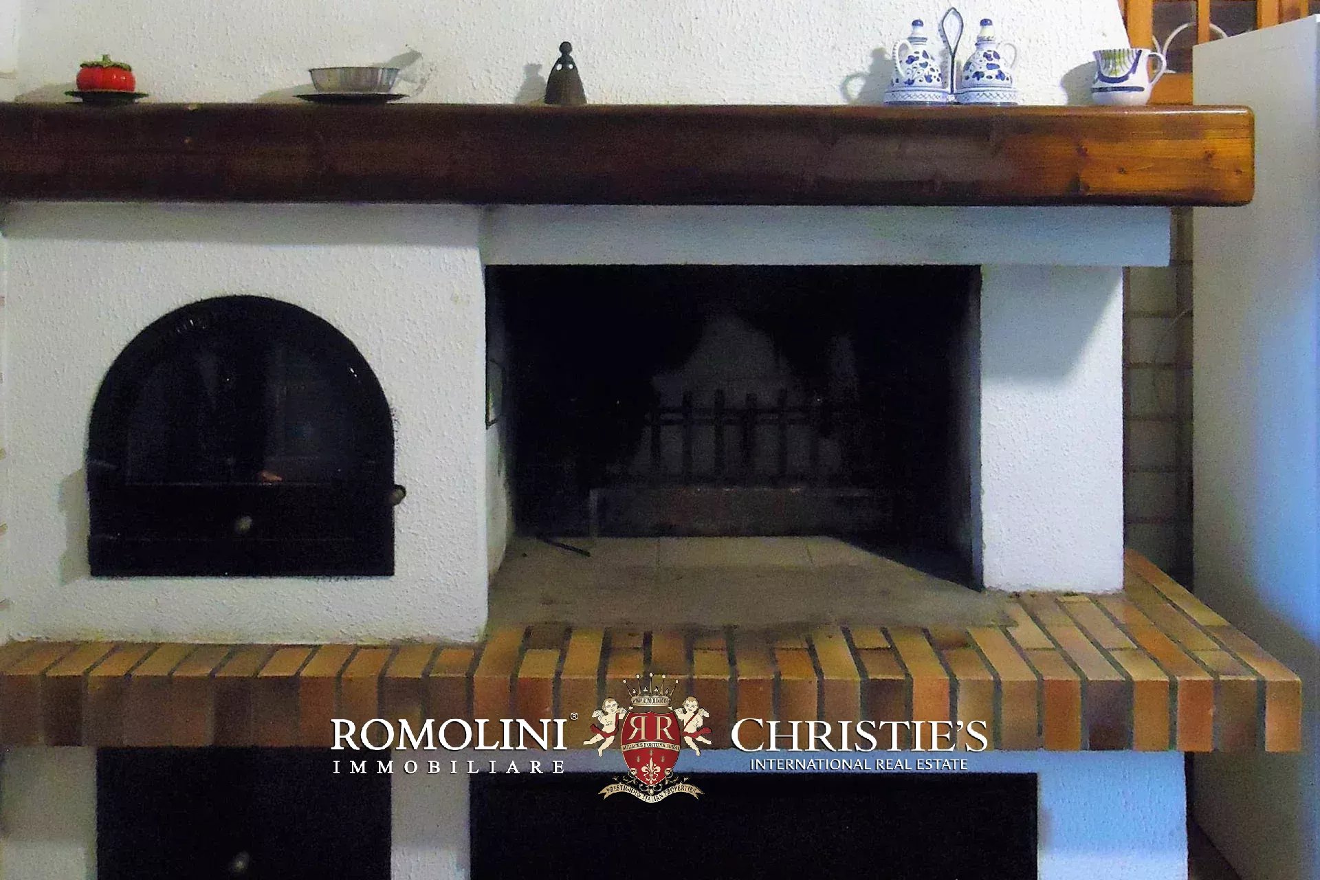 - Piano terra. L’ingresso conduce in una stanza a forma di L con un arco in muratura che porta a un doppio salone con un imponente camino. I pavimenti in cotto antico, le finestre in metallo e le porte-finestra conferiscono un aspetto raffinato alle stanze. L’ampia sala da pranzo presenta un soffitto a travi lignee e pavimenti in cotto antico e le ampie vetrate conferiscono grande luminosità al locale. Dalla sala da pranzo di accede alla spaziosa cucina con pavimenti in cotto antico, camino, forno per pizza e ampie superfici di lavoro. Il piano è completato da un bagno con doccia e da una camera singola (convertibile in studio in base alle preferenze). Troviamo infine una stanza ripostiglio con armadio per la biancheria.