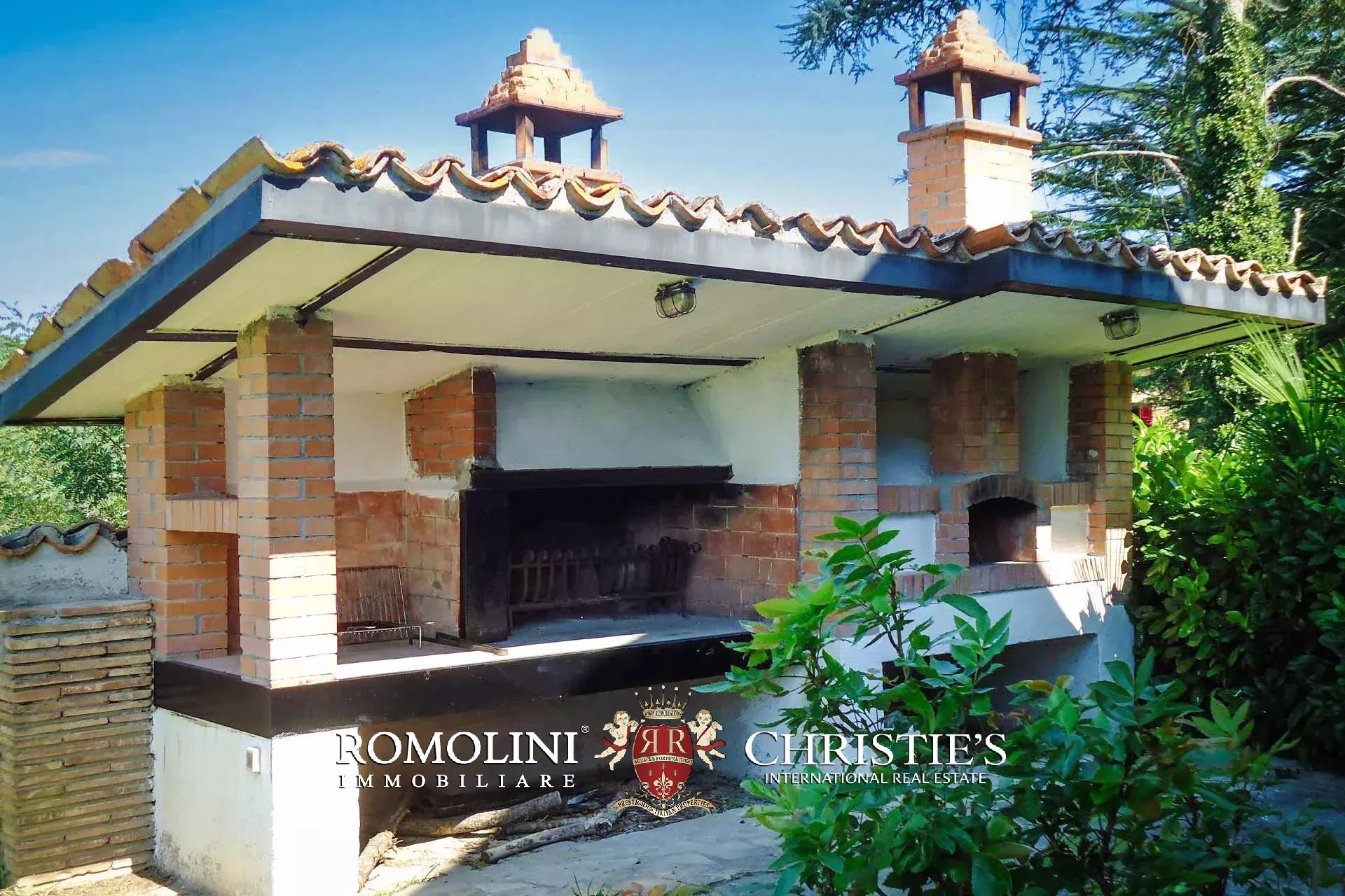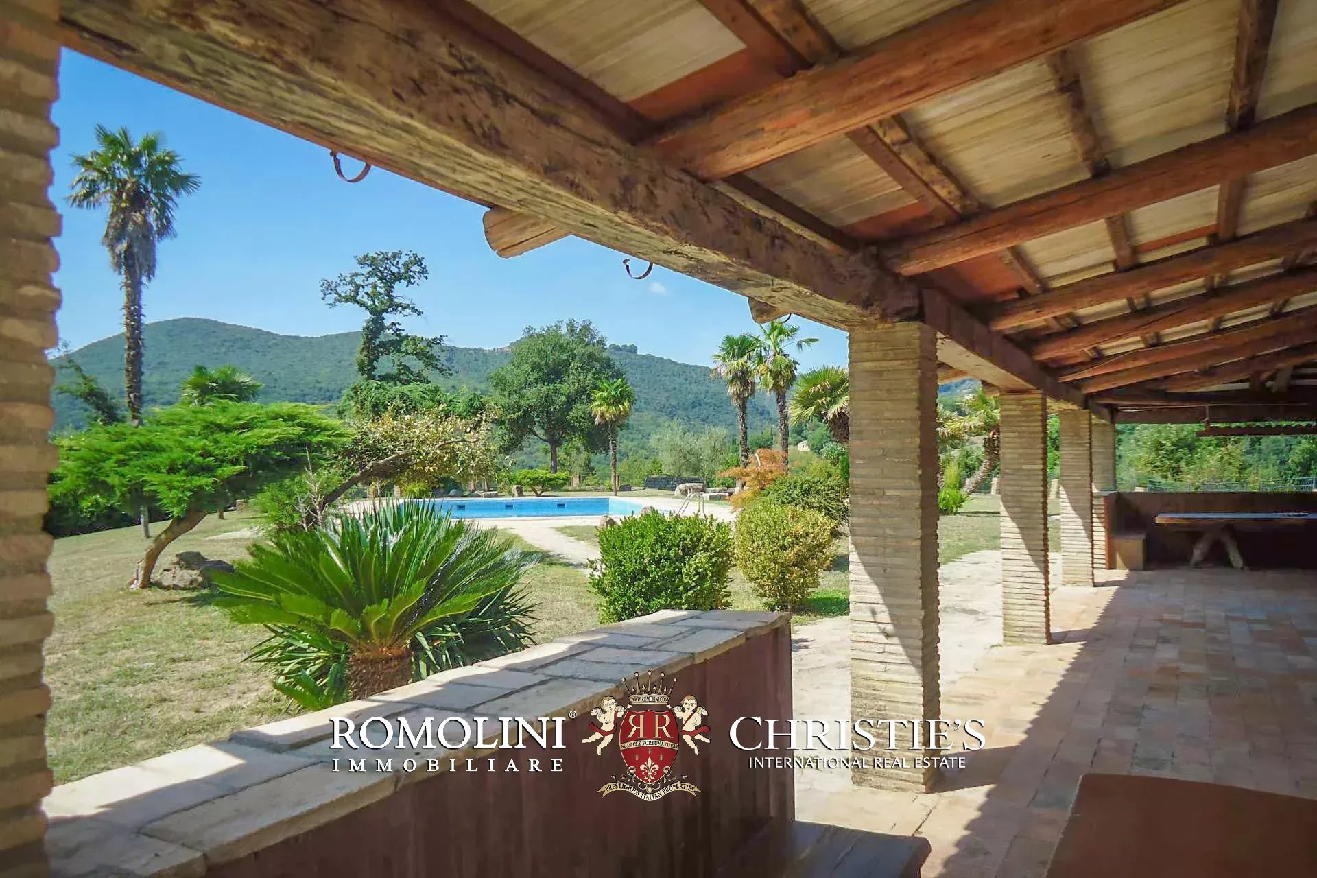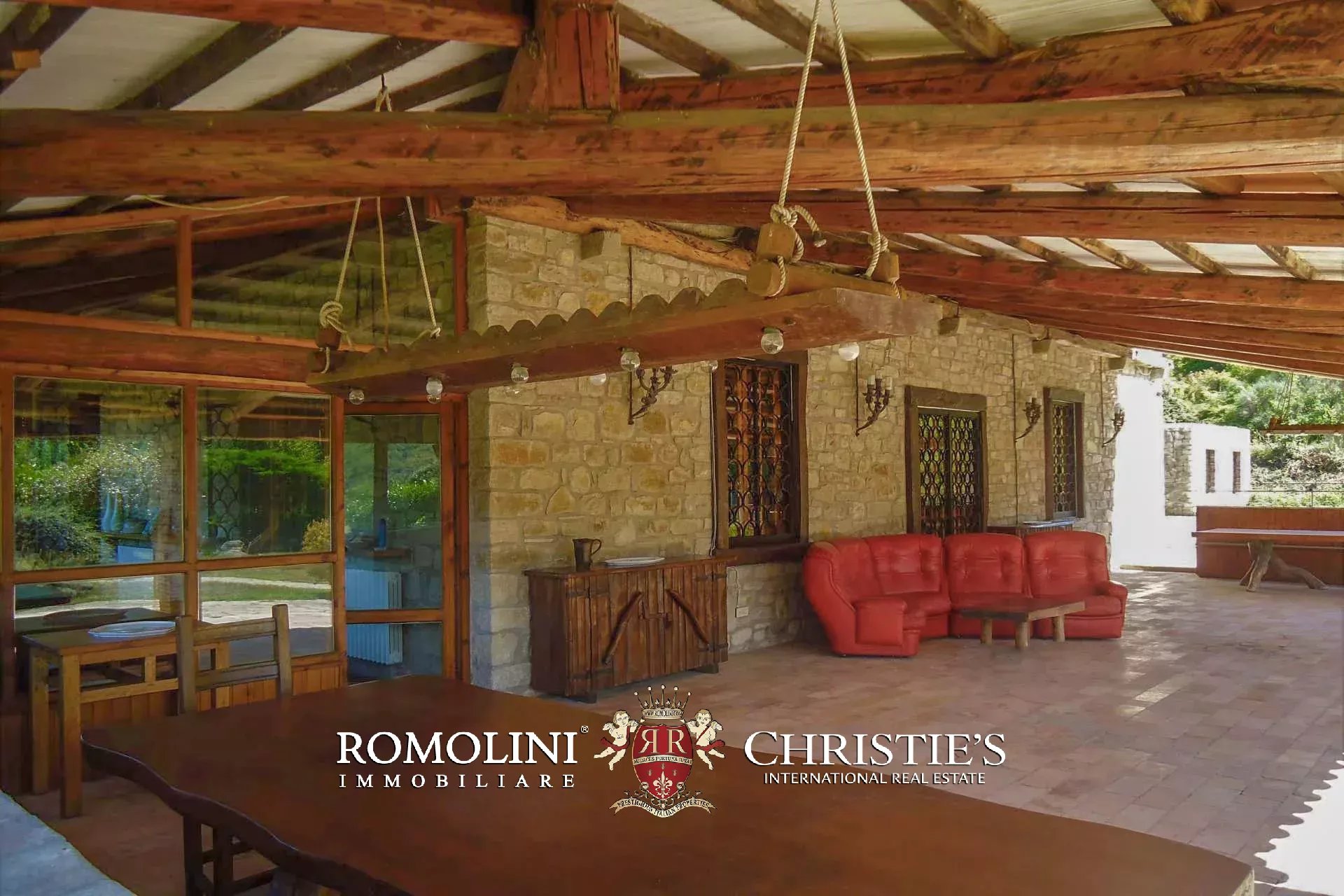 Un magnifico portico panoramico di 150 mq fornisce un ampio spazio che può accogliere molte persone e offre una vista diretta sulla valle e sul giardino nella sua totalità. Accanto alla cucina si trova un’ampia area coperta con babecue e forno per pizza.