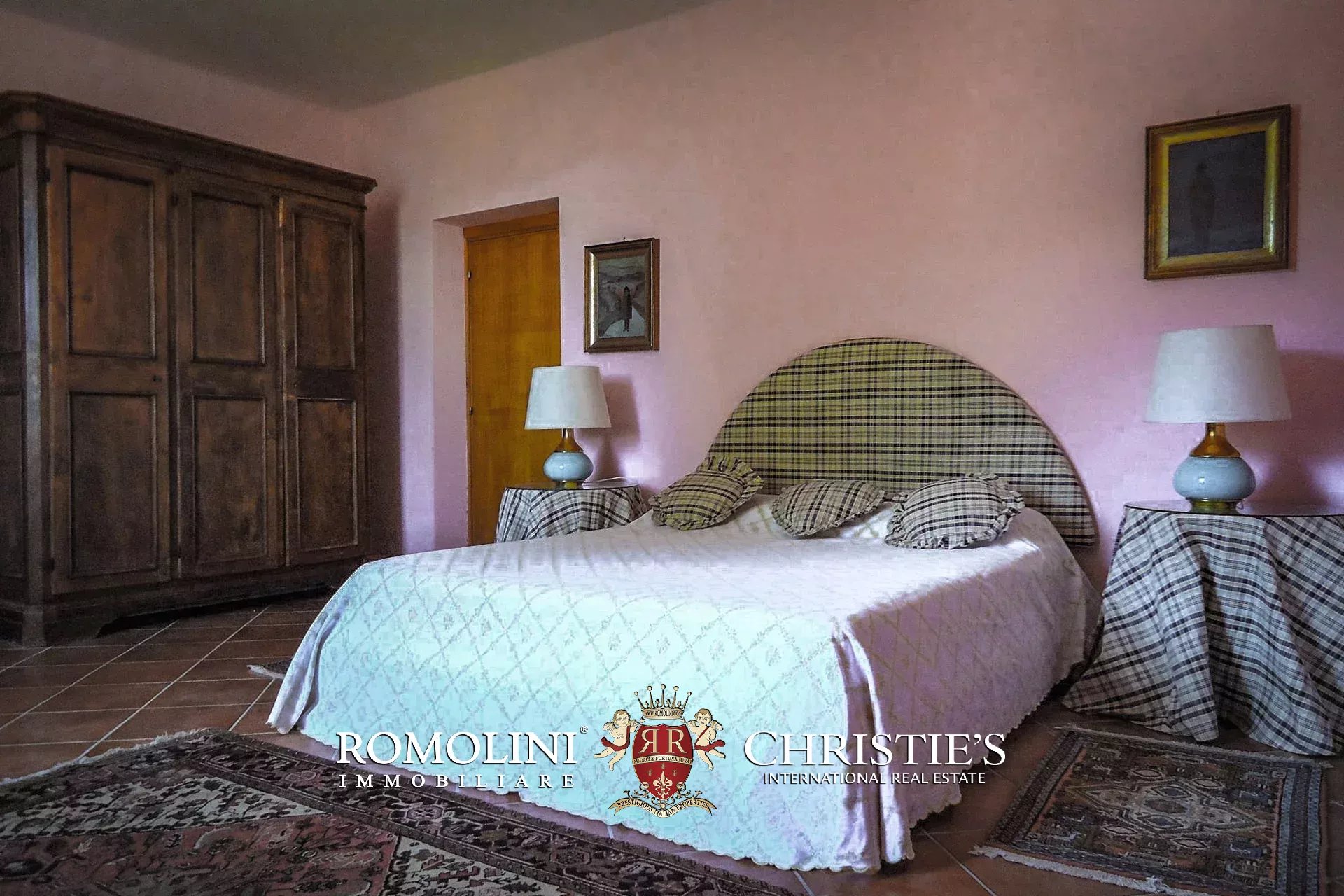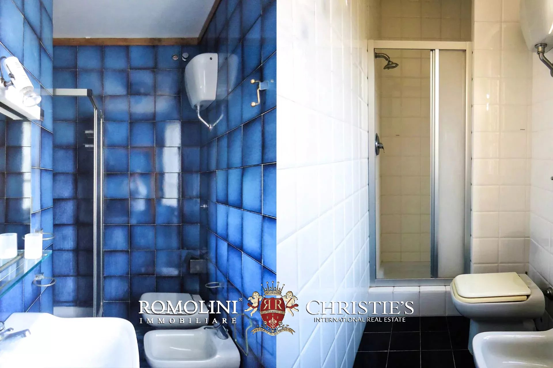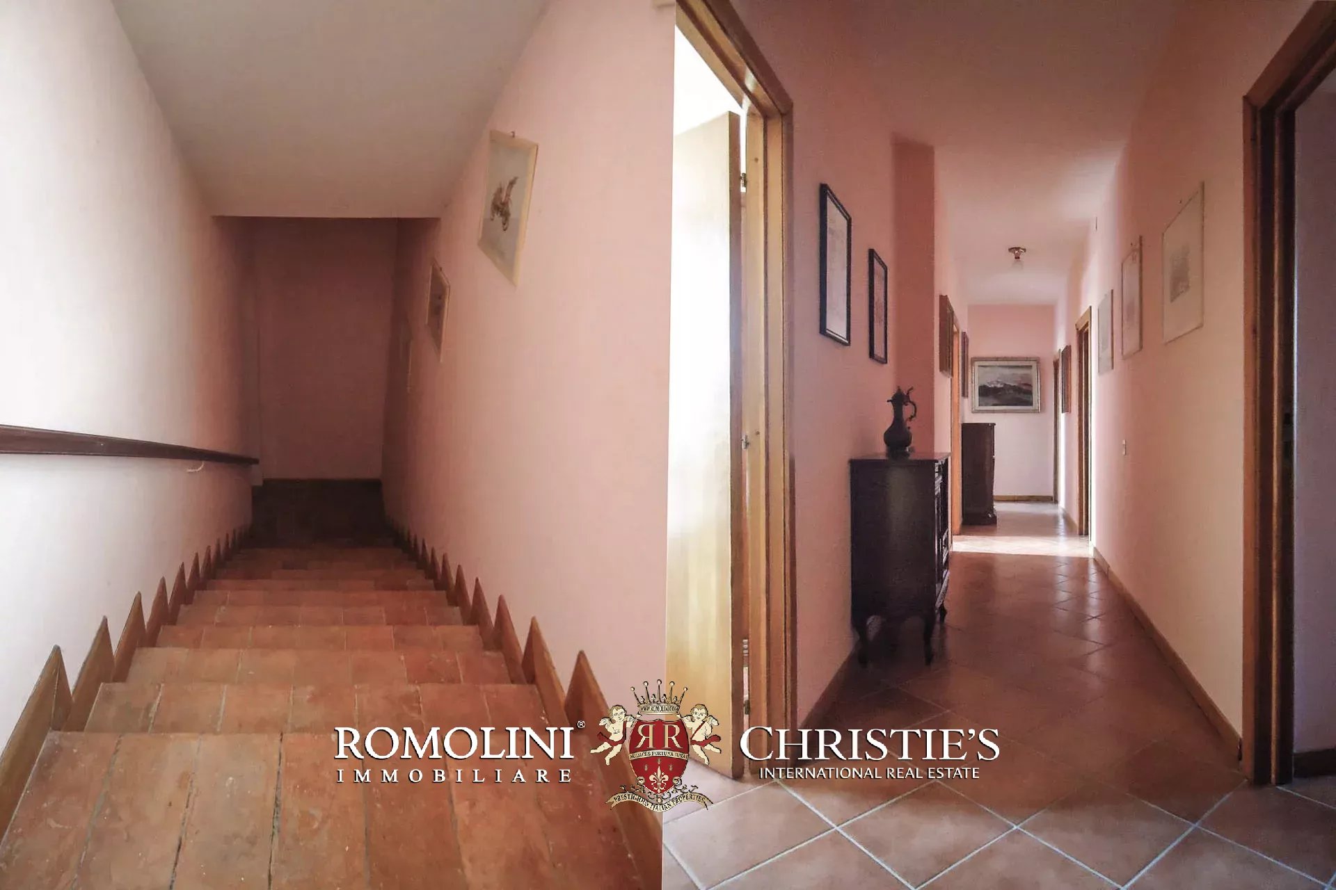 - Primo piano. Salendo una scala in cotto antico si arriva a un lungo corridoio che conduce a cinque ampie e luminose camere, una con caminetto e quattro con bagno en-suite (2 bagni con doccia + 1 bagno con vasca-doccia + 1 bagno con vasca, doccia e doppio lavabo). Un bagno indipendente serve la quinta camera. Il pavimento dell’interno piano è piastrellato in cotto moderno.