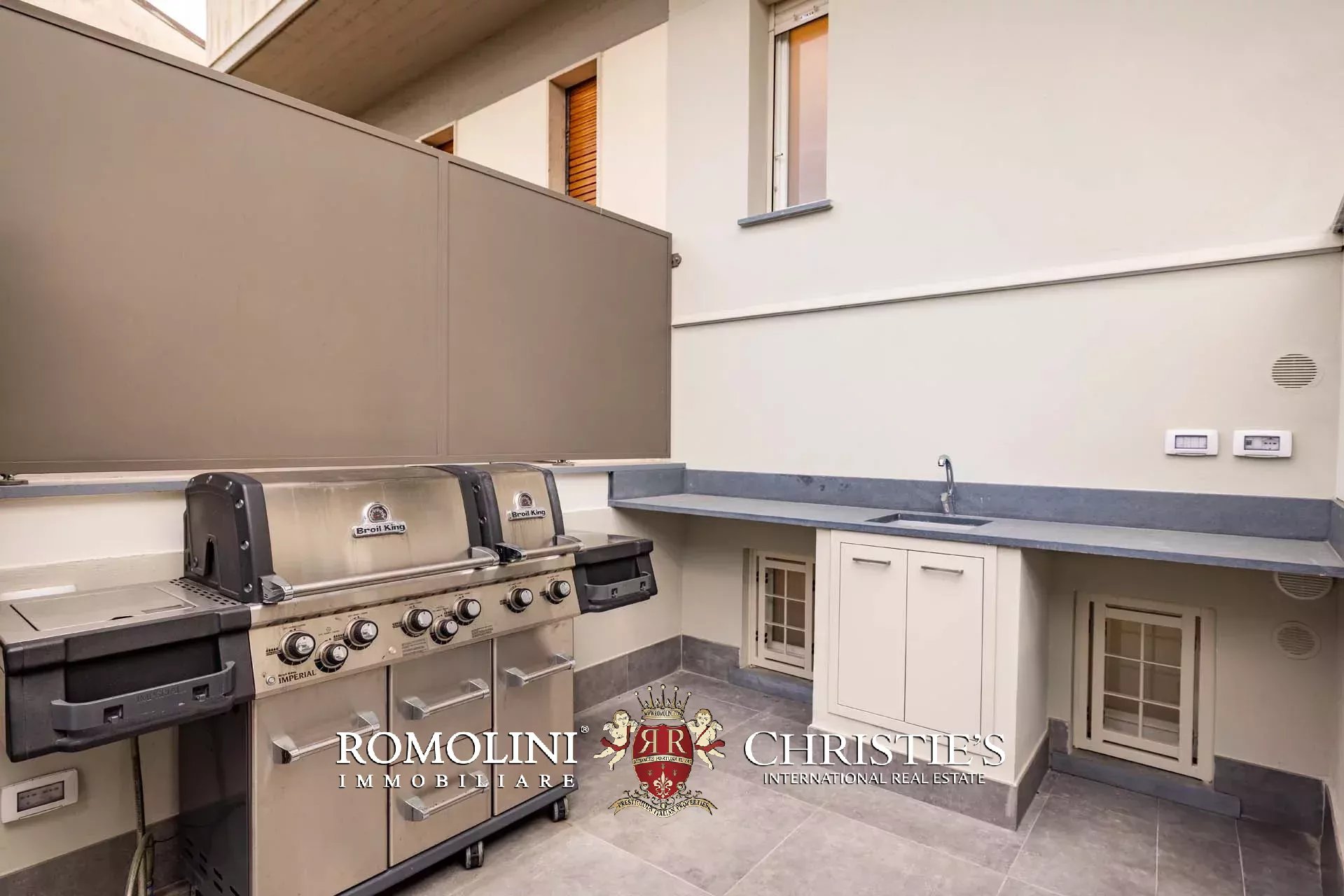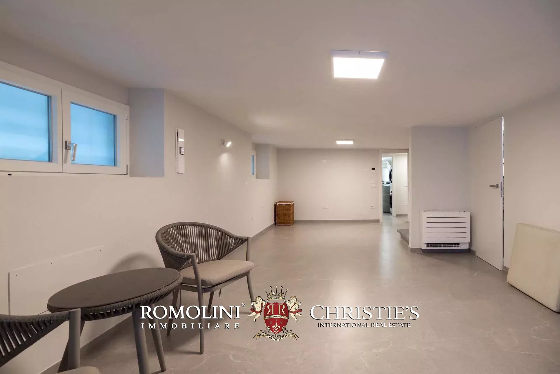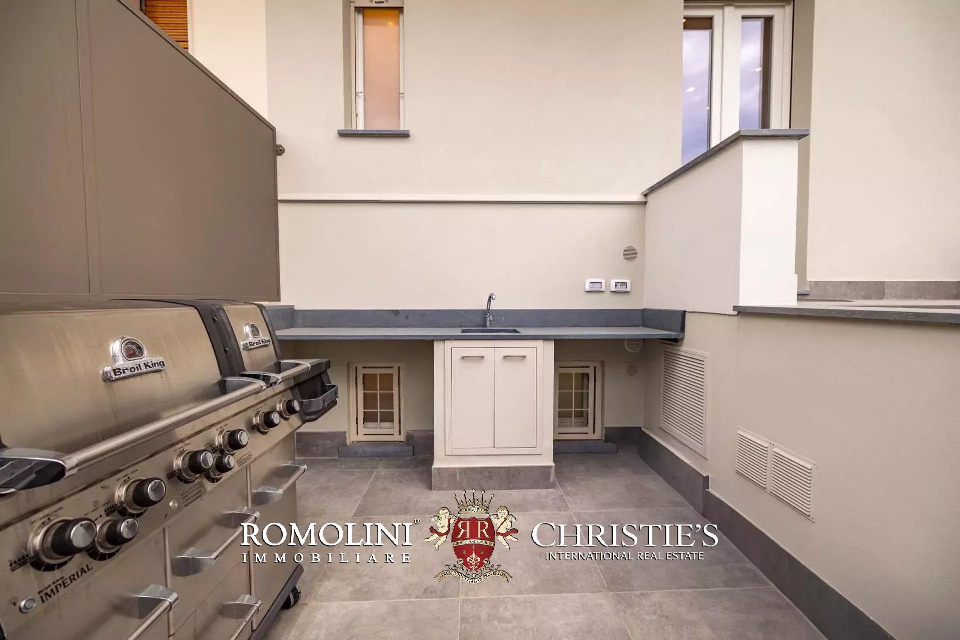 All’esterno, il giardino di 330 m² ospita una piscina idromassaggio, cucina esterna, zona pranzo, barbecue e una cabina doccia in stile Forte dei Marmi. Alla casa si accede direttamente dalla strada e oltre il cancello c’è spazio sufficiente per due auto, oltre alla predisposizione per una colonnina di ricarica per veicoli elettrici.