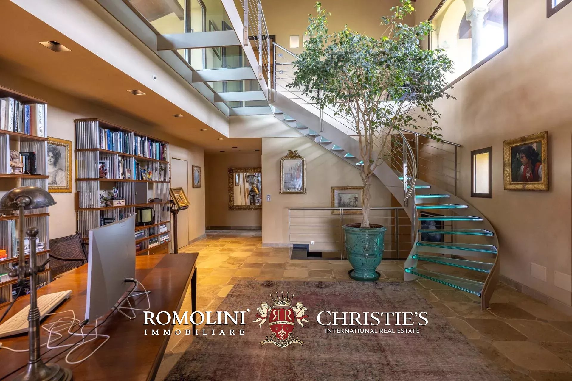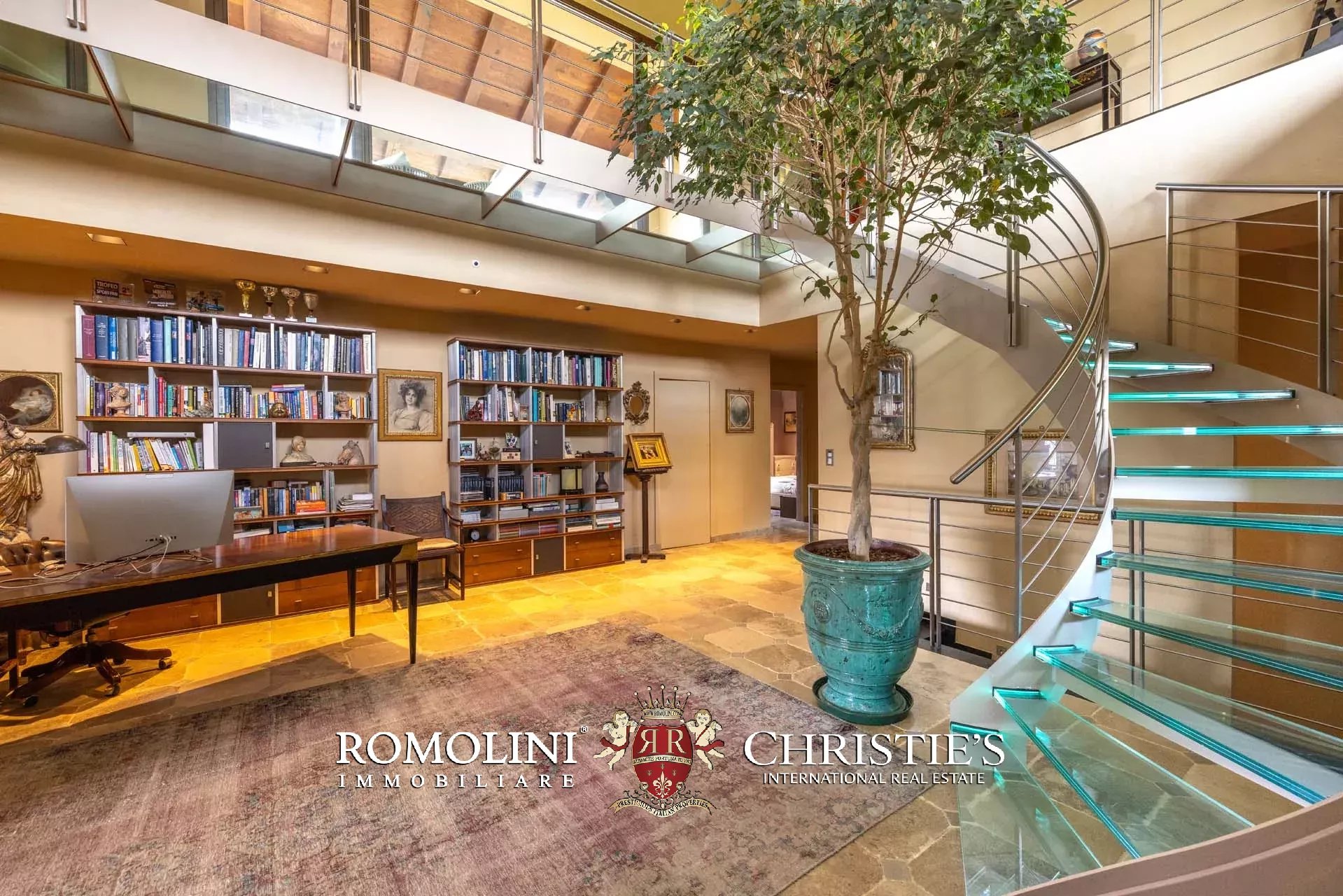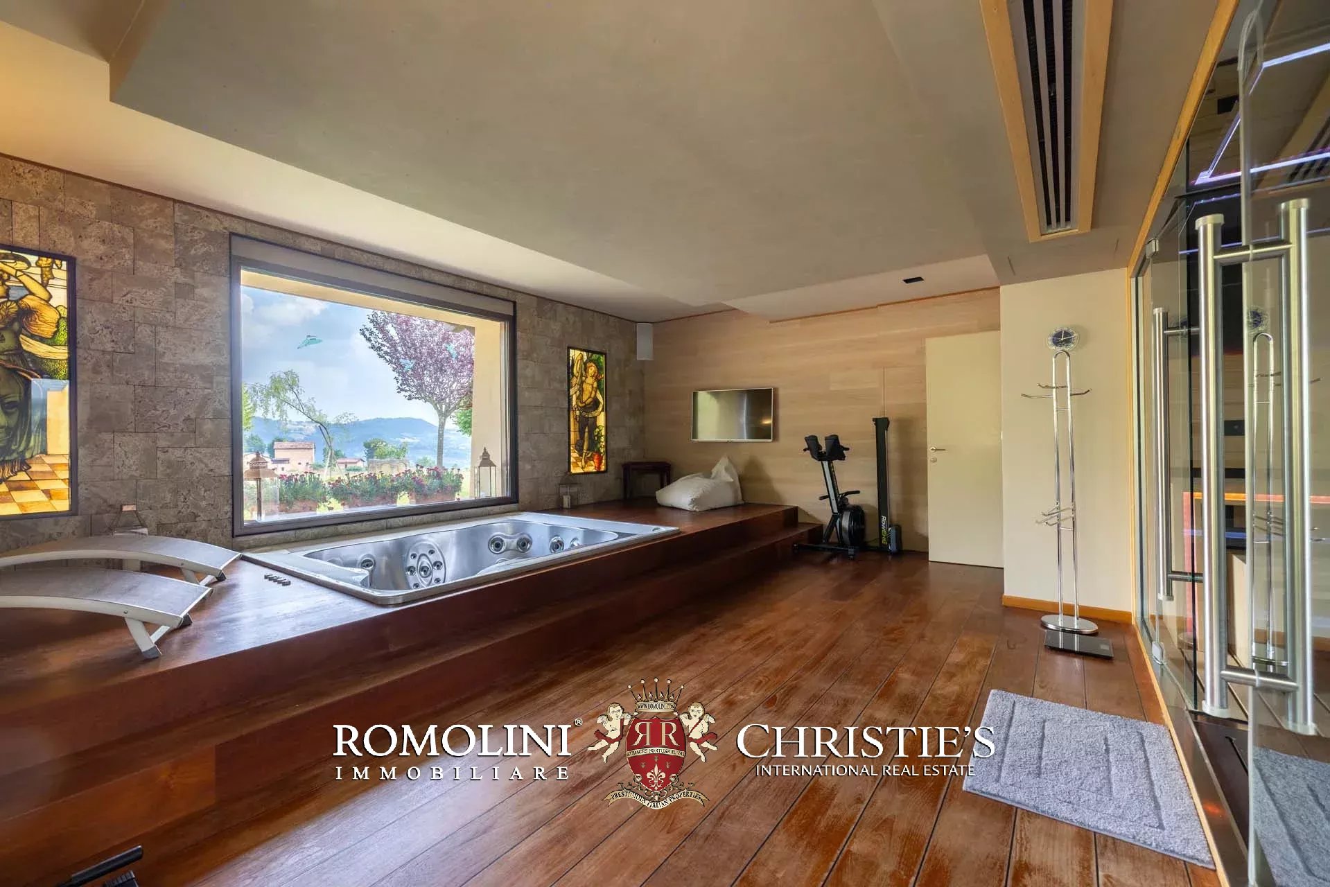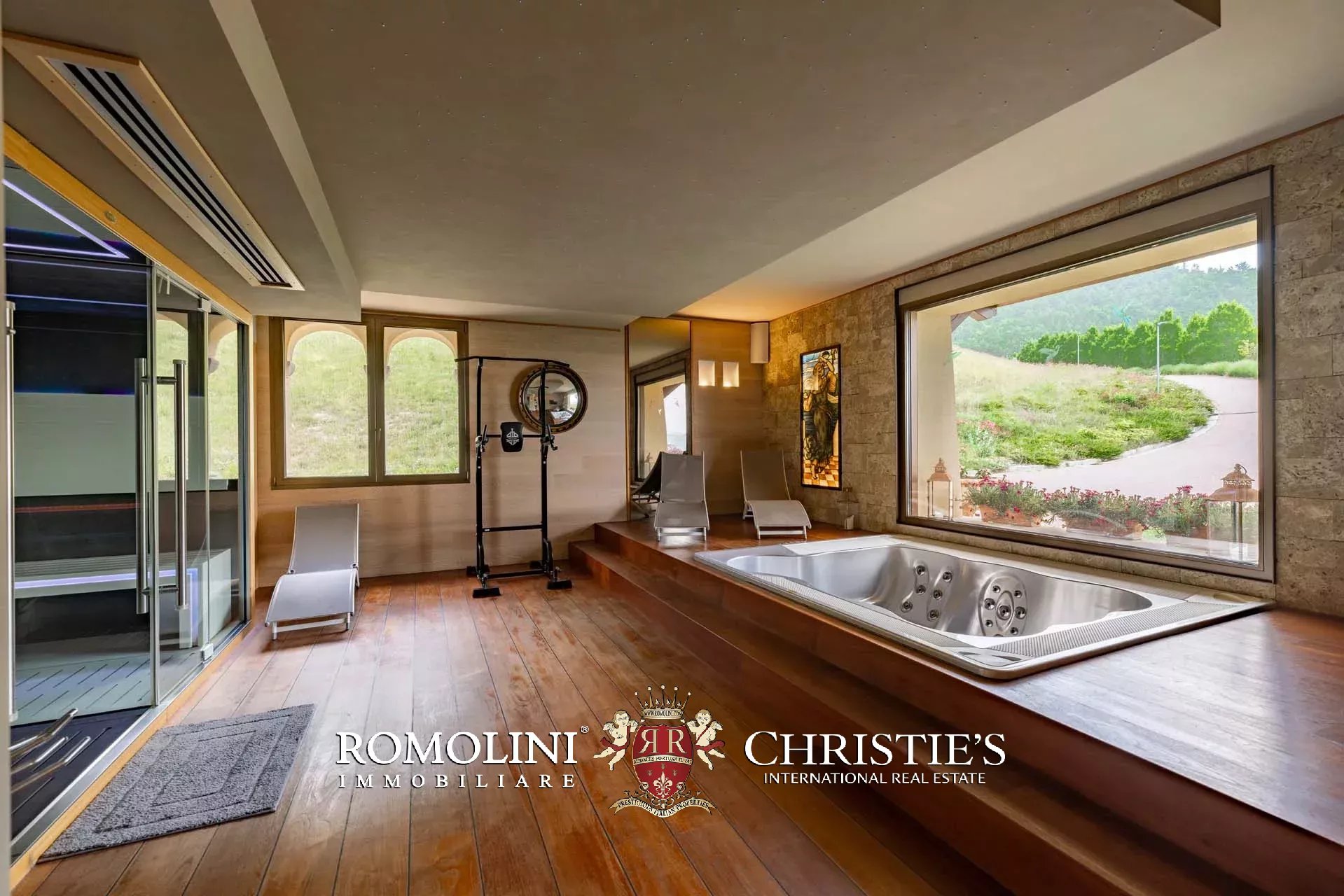 - Piano terra: ingresso, ampio soggiorno con zona pranzo e loggia esterna, cucina a vista con elettrodomestici Gaggenau e dispensa, bagno di servizio, camera con bagno privato e zona fitness con idromassaggio, sauna, bagno turco e doccia emozionale;