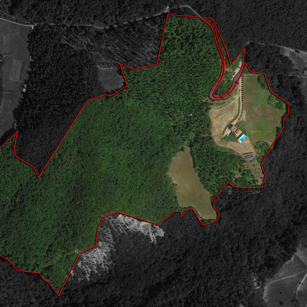 Il terreno agricolo è coperto quasi interamente da boschi (22,2 ha) con alcune porzioni di seminativo (4,3 ha) caratterizzate da buona esposizione e potenzialmente adatte per l’impianto di nuove colture, vigne e/o ulivi. I boschi e i campi che circondano la proprietà assicurano riservatezza e silenzio, oltre a fornire un ambiente ottimo per uscite a piedi o a cavallo.