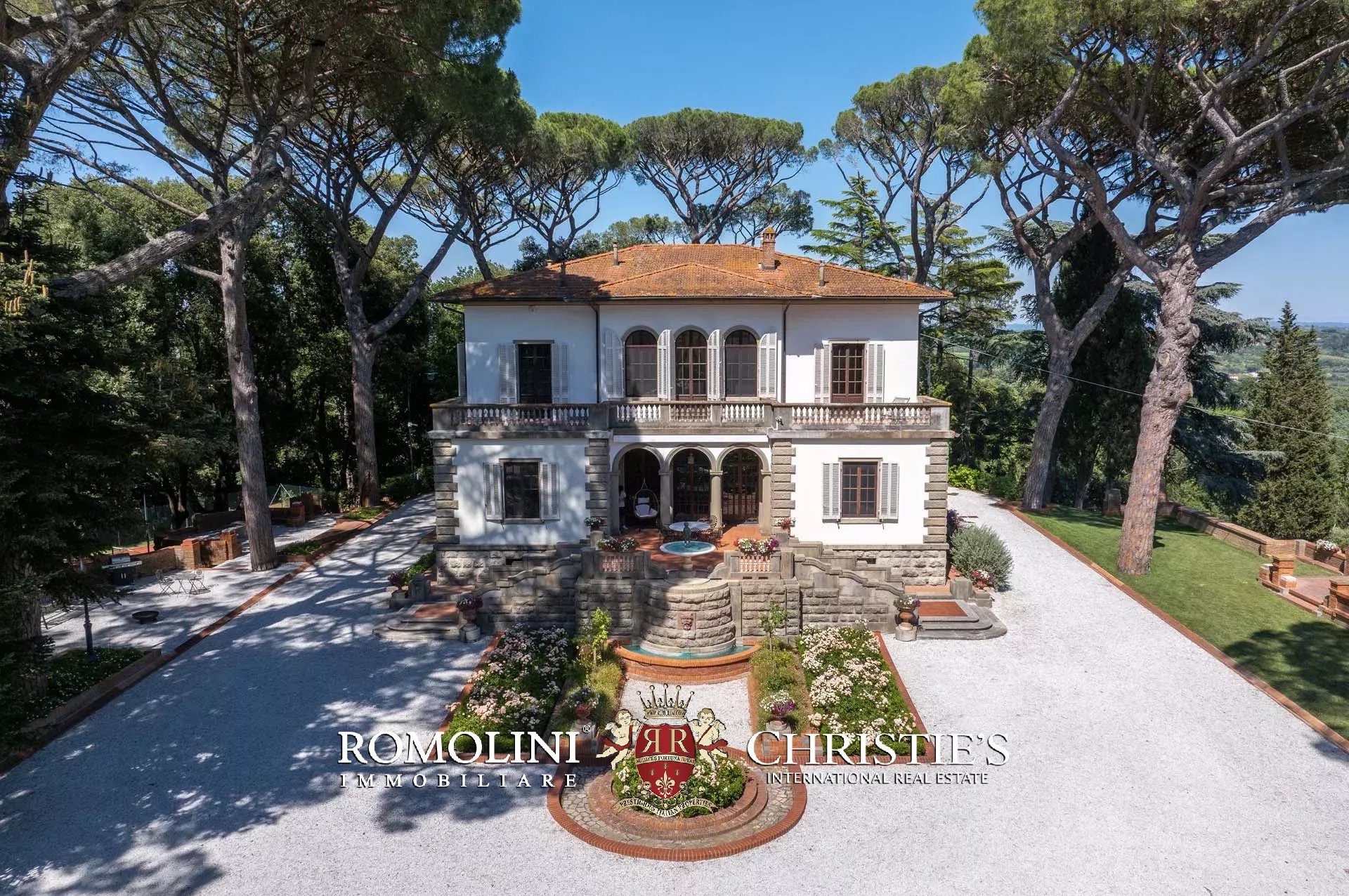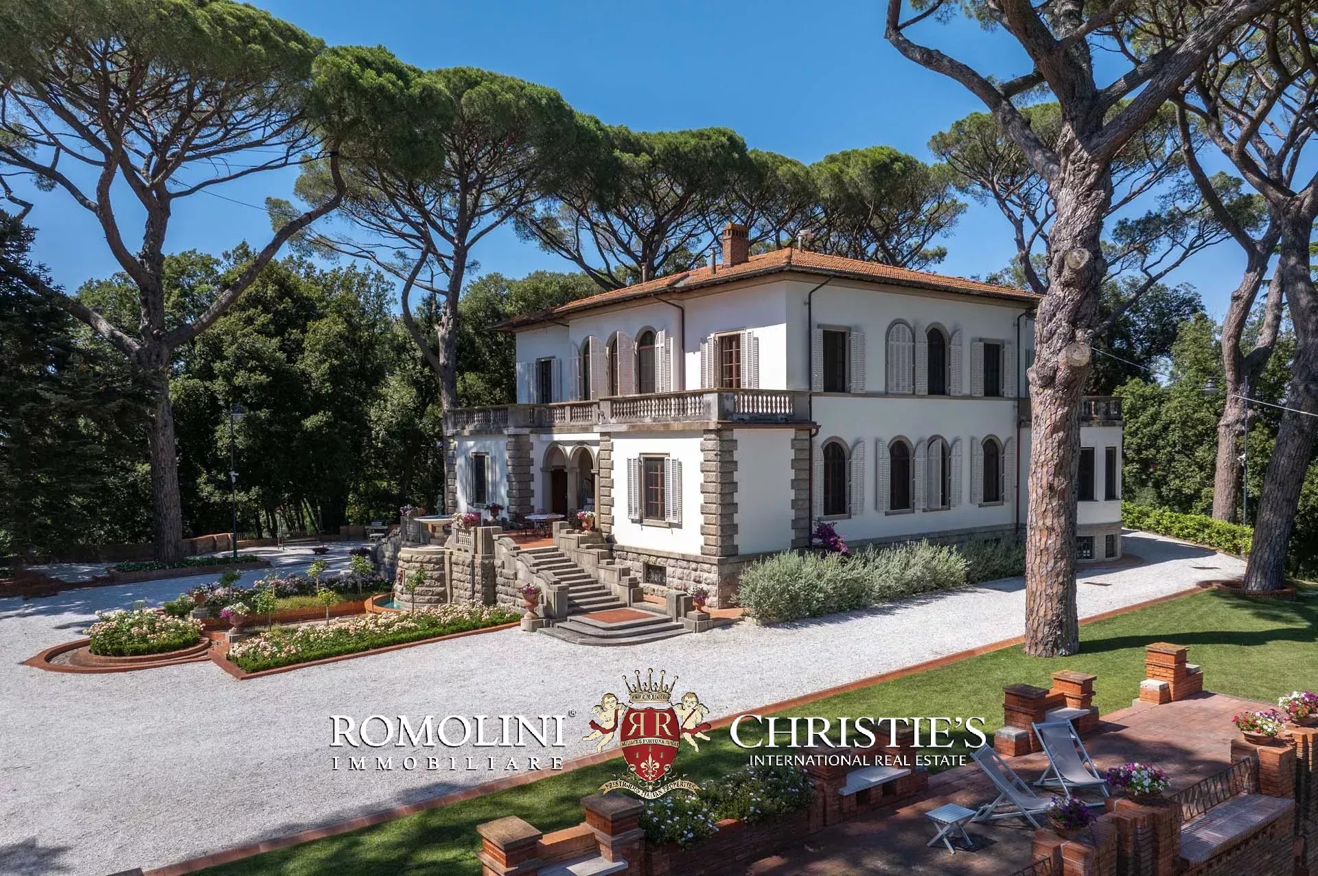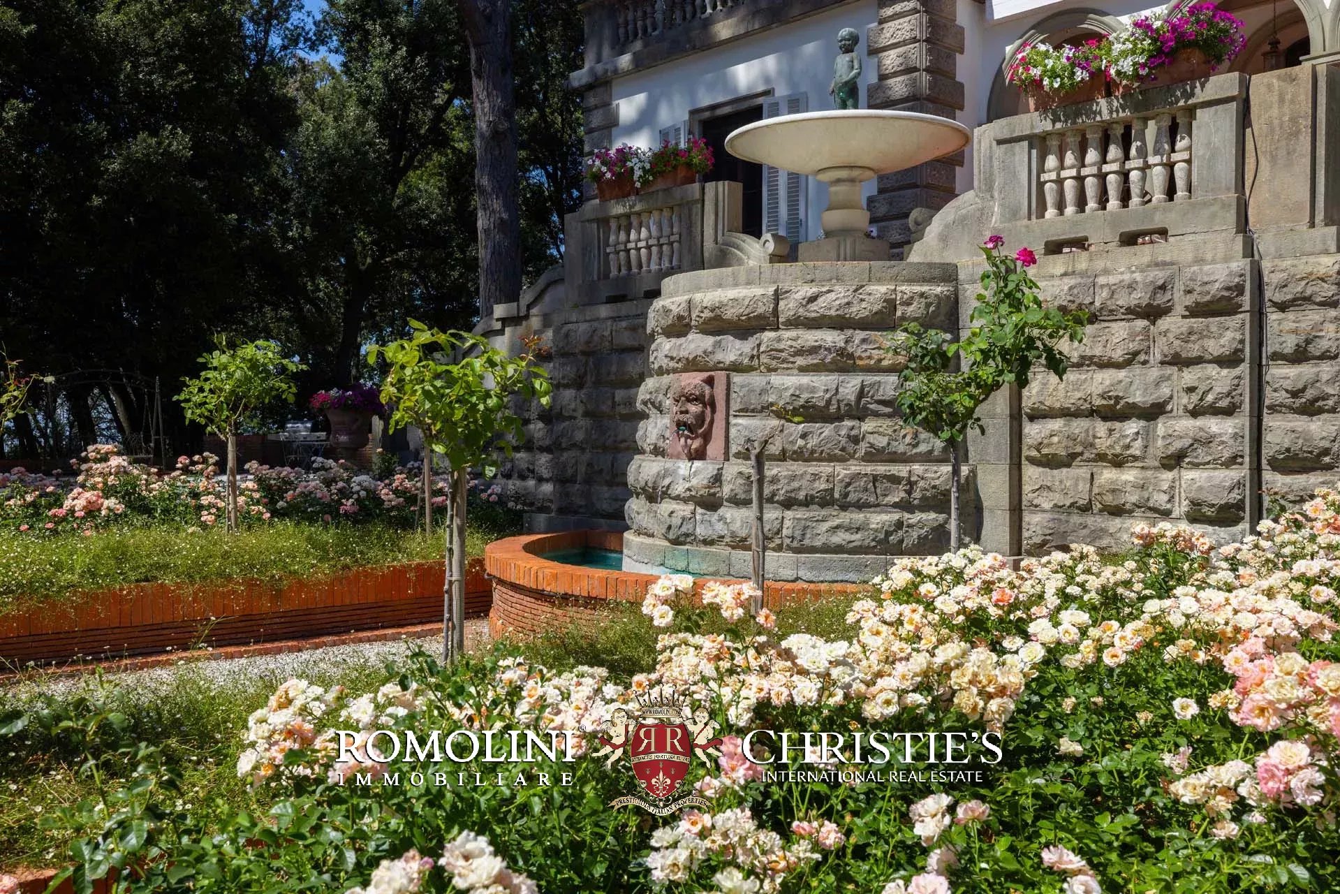 La villa è circondata da un rigoglioso giardino di 21.000 m² punteggiato di piante ad alto fusto, inclusi degli incredibili pini che hanno oltre duecento anni, e aiuole che conferiscono colore alla proprietà in estate e primavera. Il giardino è disposto su varie terrazze collegate da scale in cotto e mattoni ed è attraversato da un viale alberato in ghiaia che sale dal cancello elettrico direttamente dalla viabilità comunale.