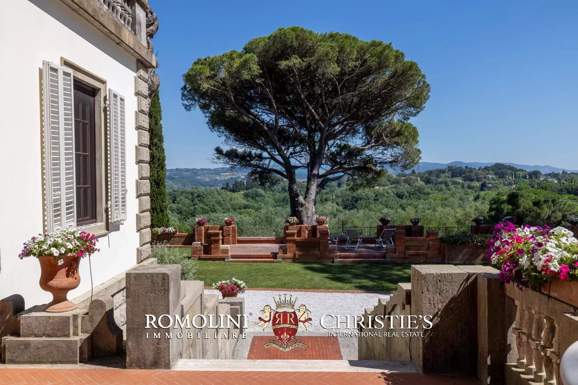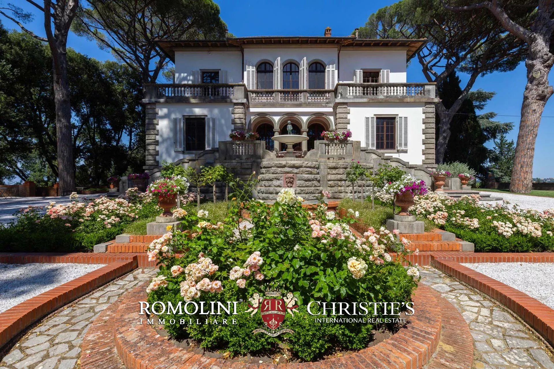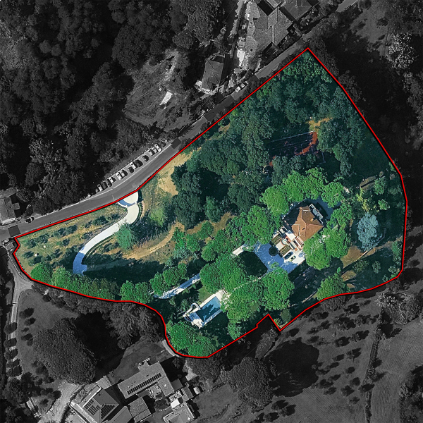 La villa è circondata da un rigoglioso giardino di 21.000 m² punteggiato di piante ad alto fusto, inclusi degli incredibili pini che hanno oltre duecento anni, e aiuole che conferiscono colore alla proprietà in estate e primavera. Il giardino è disposto su varie terrazze collegate da scale in cotto e mattoni ed è attraversato da un viale alberato in ghiaia che sale dal cancello elettrico direttamente dalla viabilità comunale.