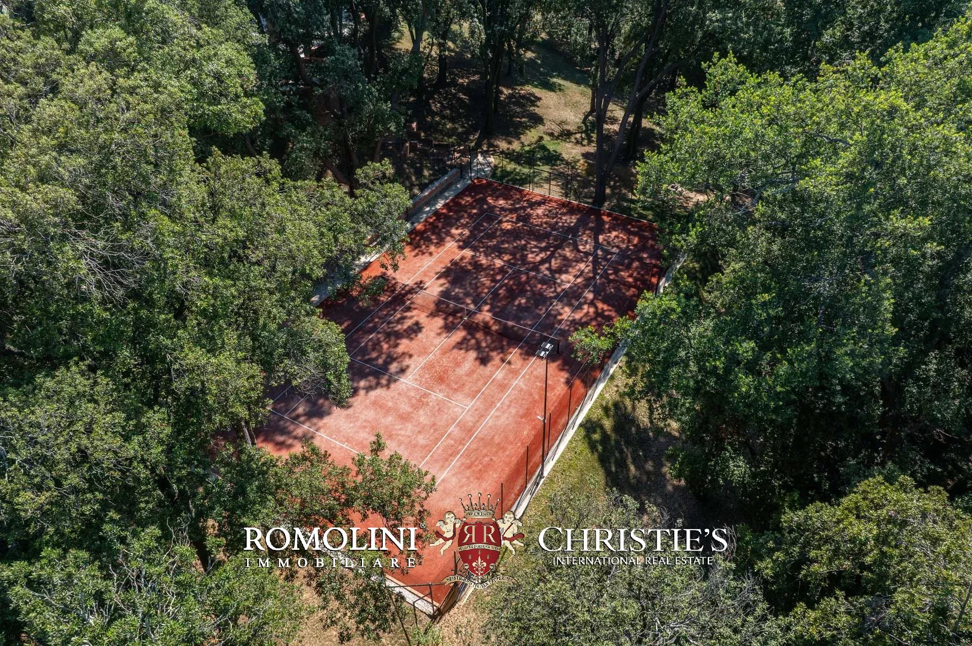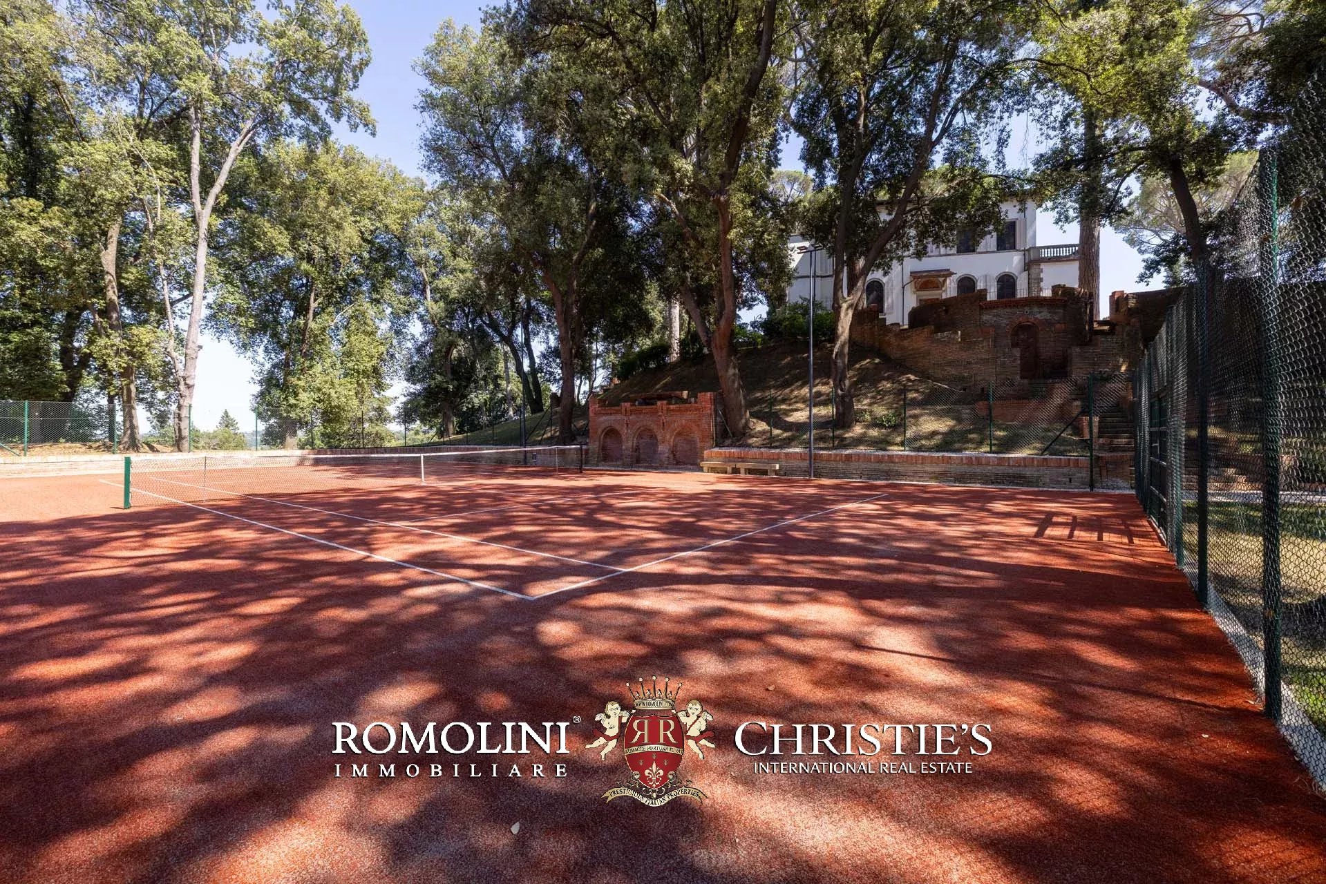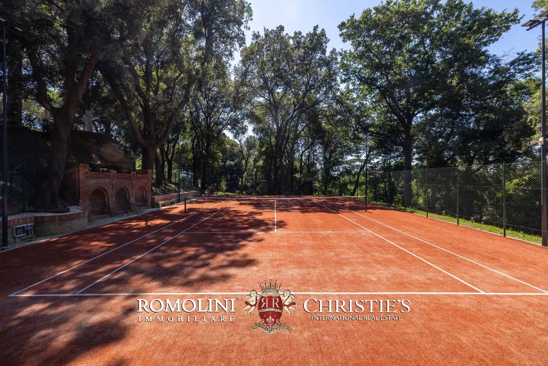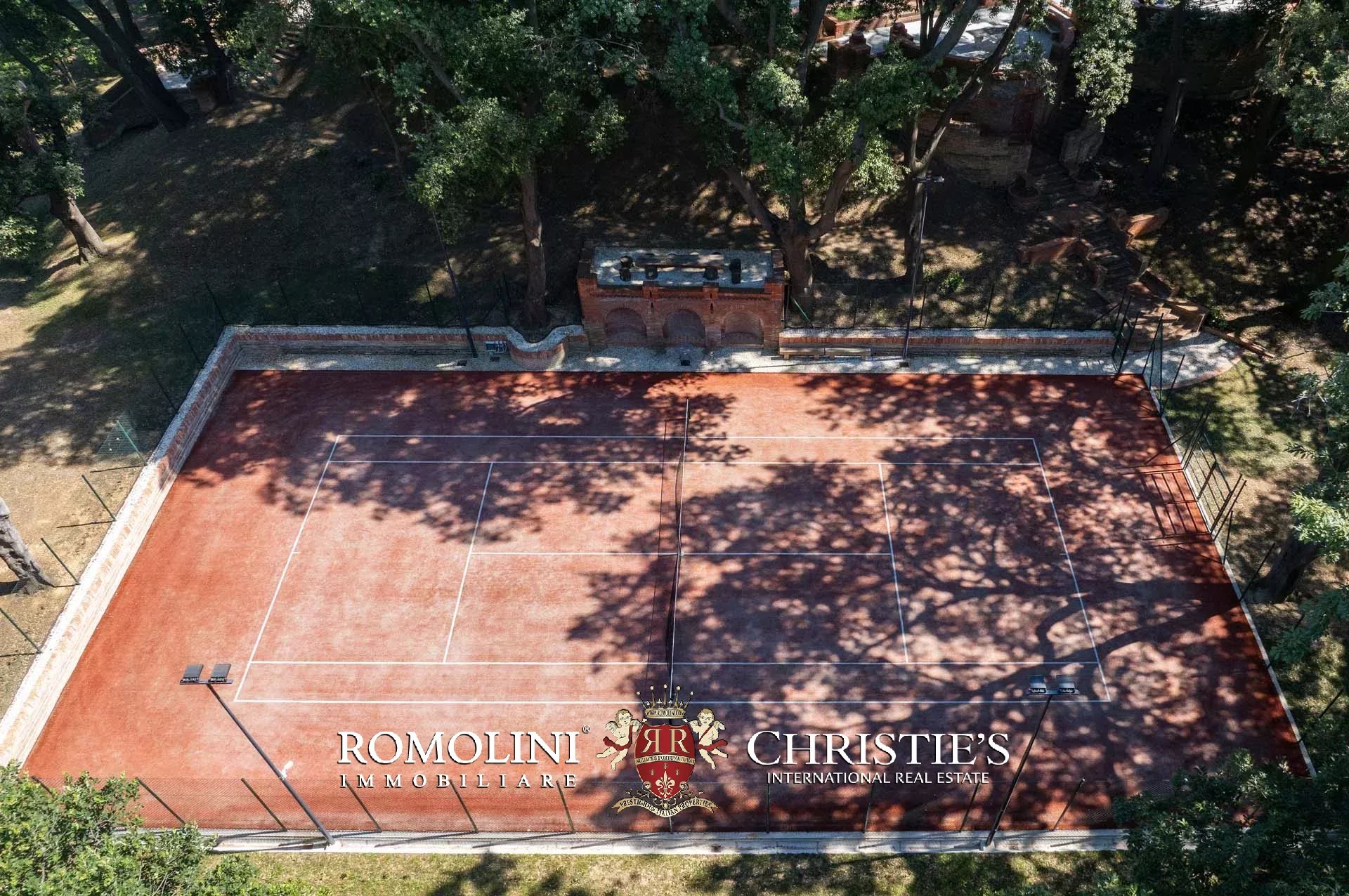 A fianco della villa, riparato dagli alberi e dotato di impianto d’illuminazione notturna, si trova anche un campo da tennis in sintetico.