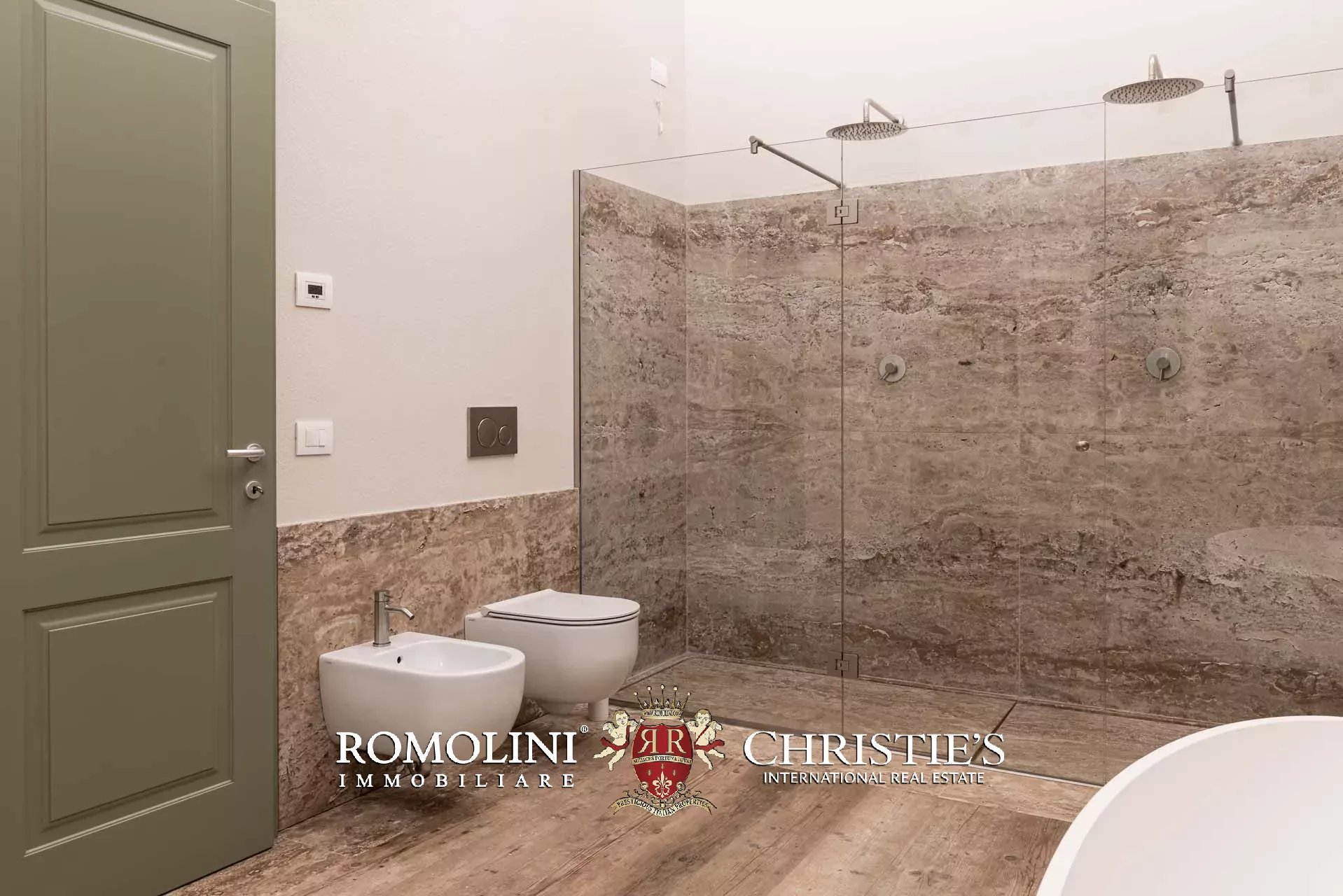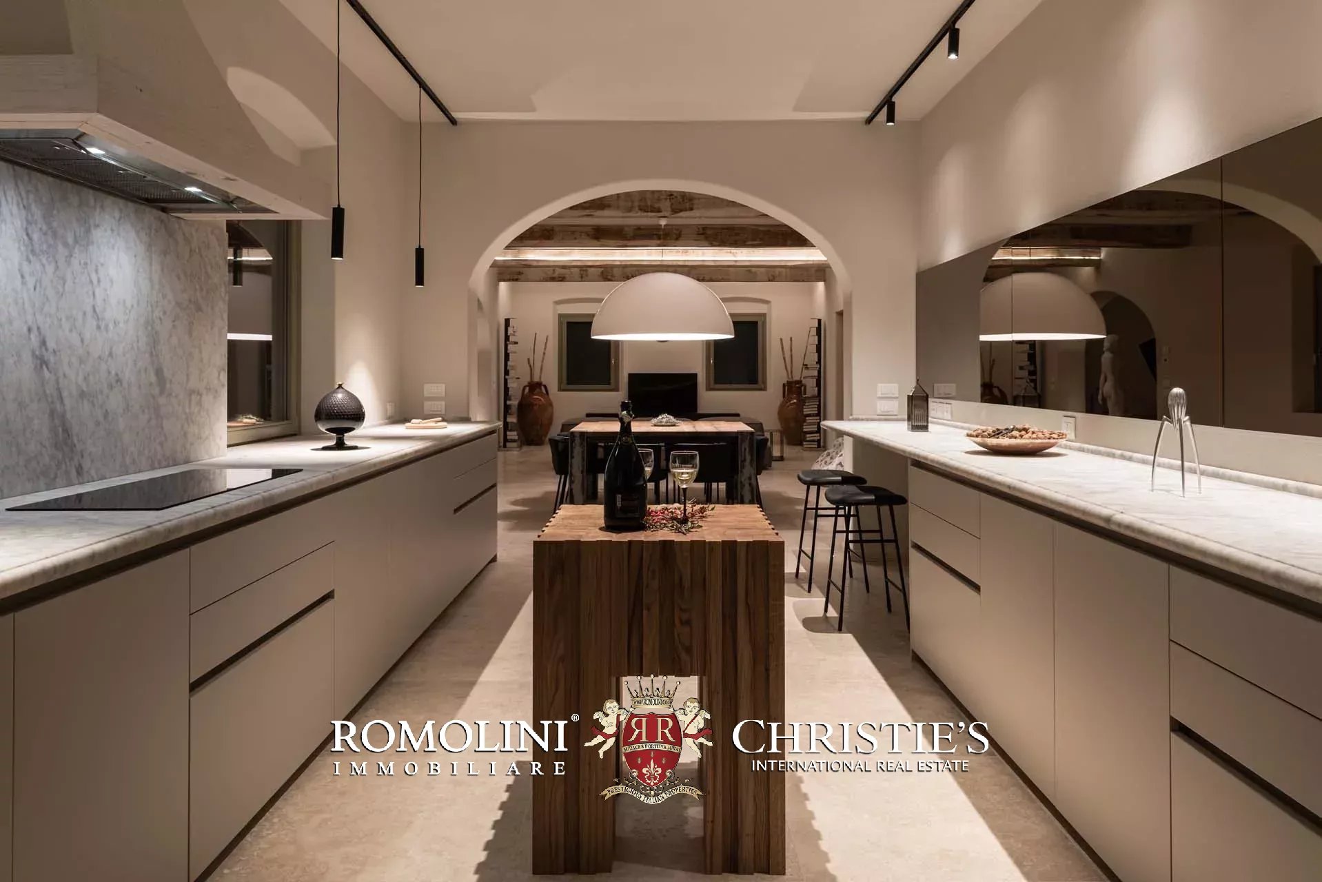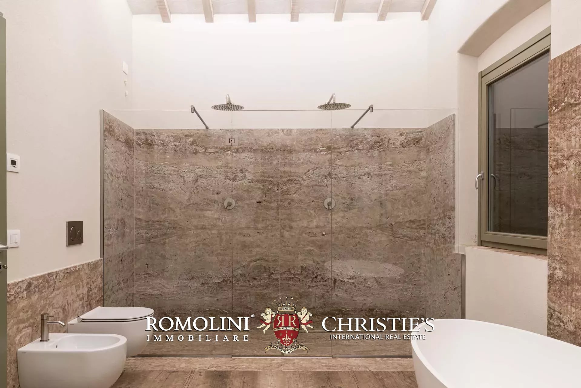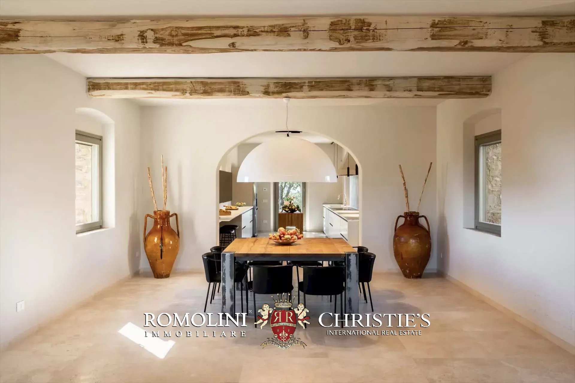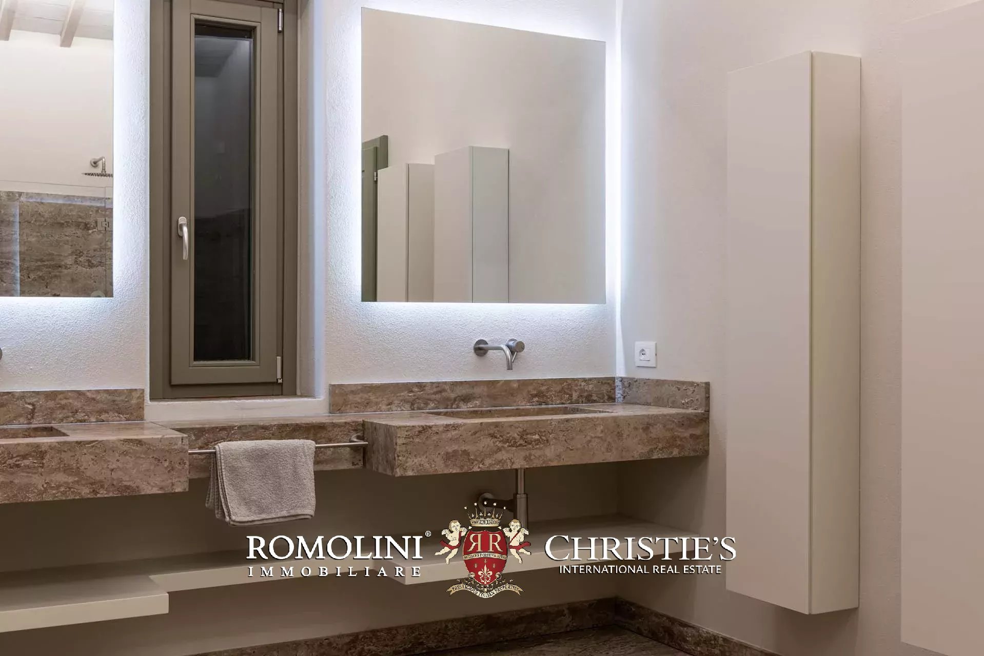 La casa principale è stata progettata con estrema cura per i dettagli, coniugando interni moderni e luminosi con il carattere senza tempo dell’architettura tradizionale in pietra. Finiture di altissimo livello caratterizzano ogni ambiente: pavimenti in travertino al piano terra, parquet in rovere al primo piano, bagni in marmo di Carrara e arredi su misura contribuiscono a creare un’atmosfera elegante.
