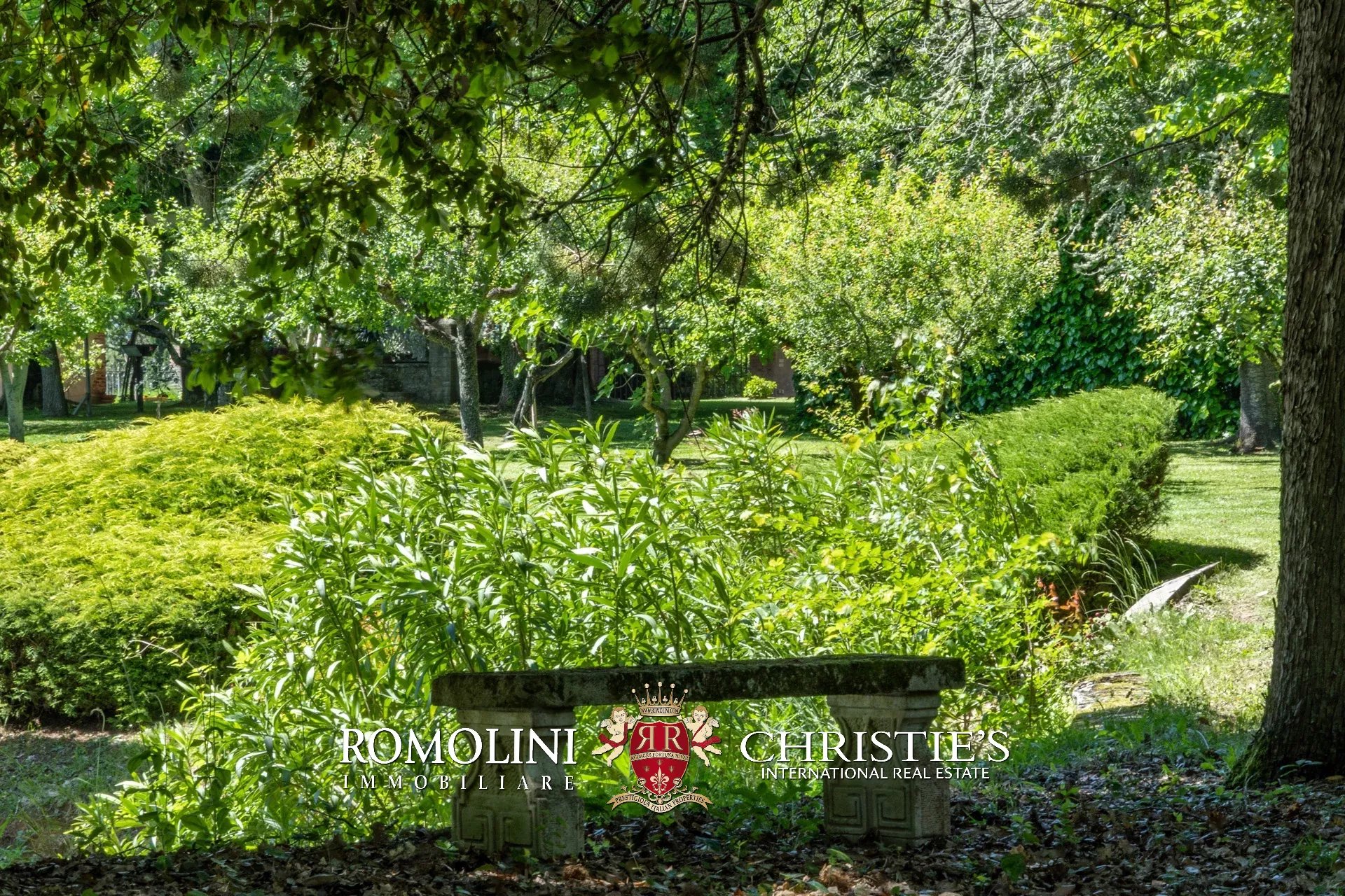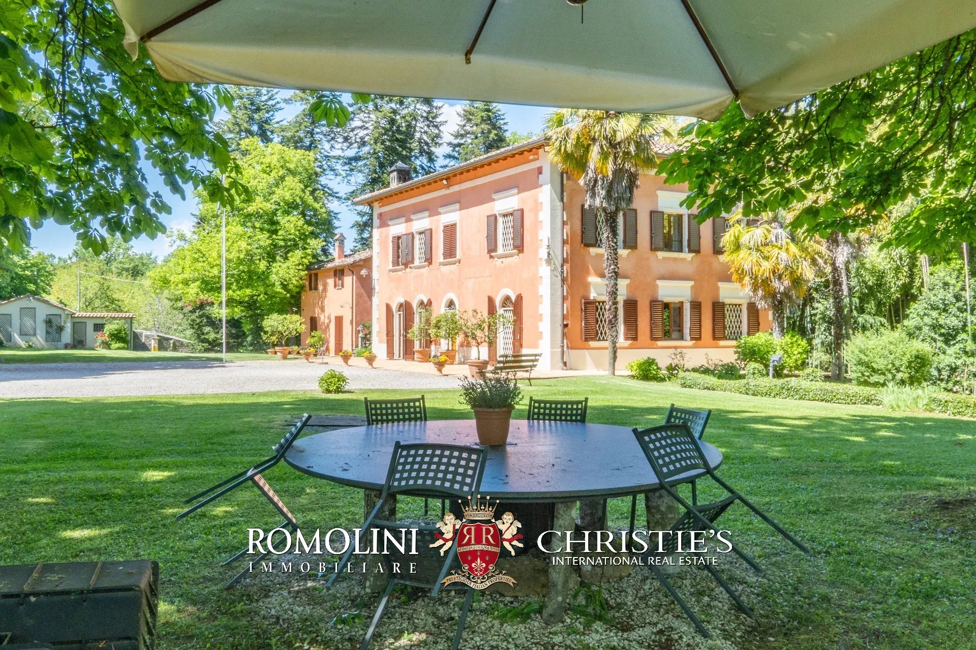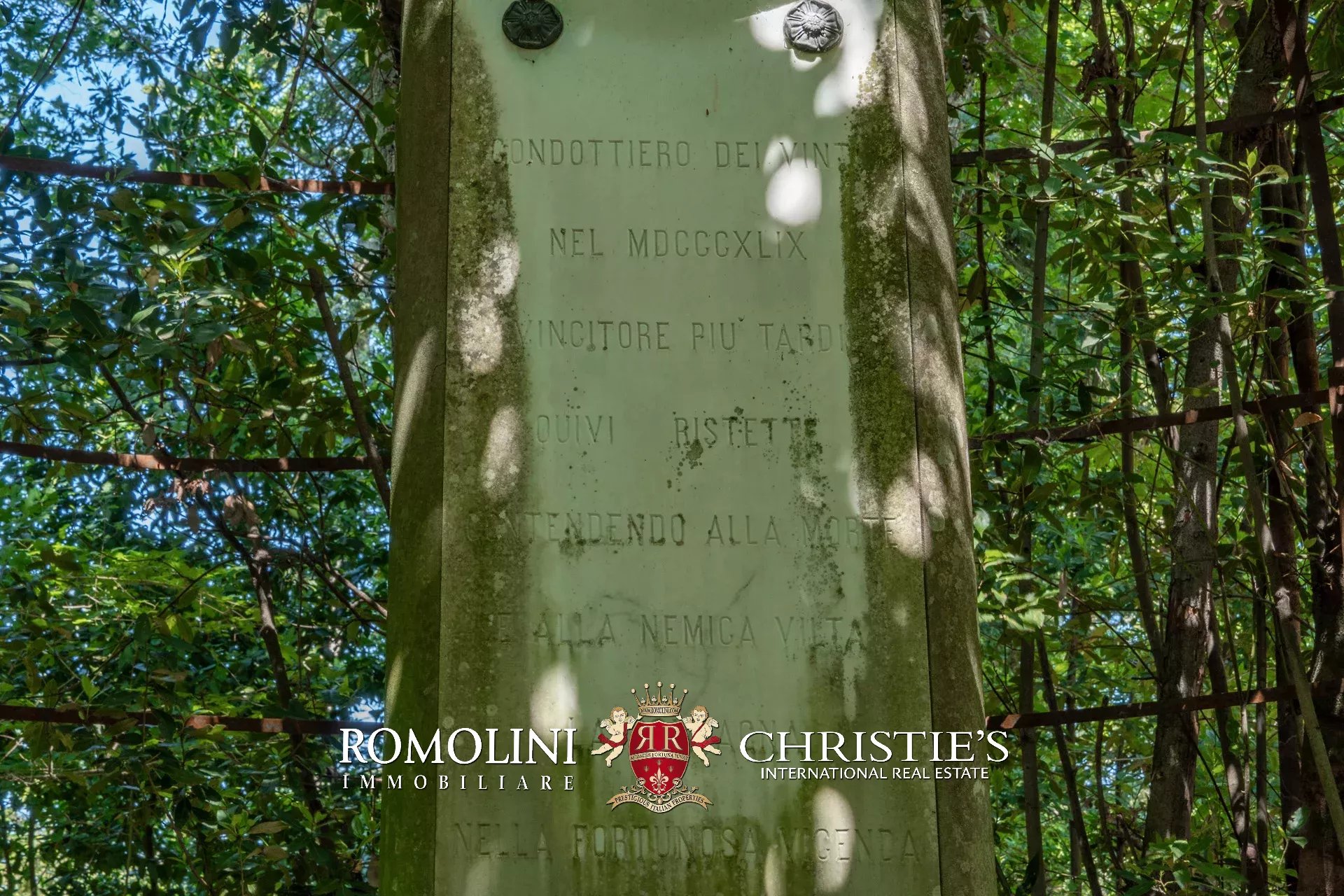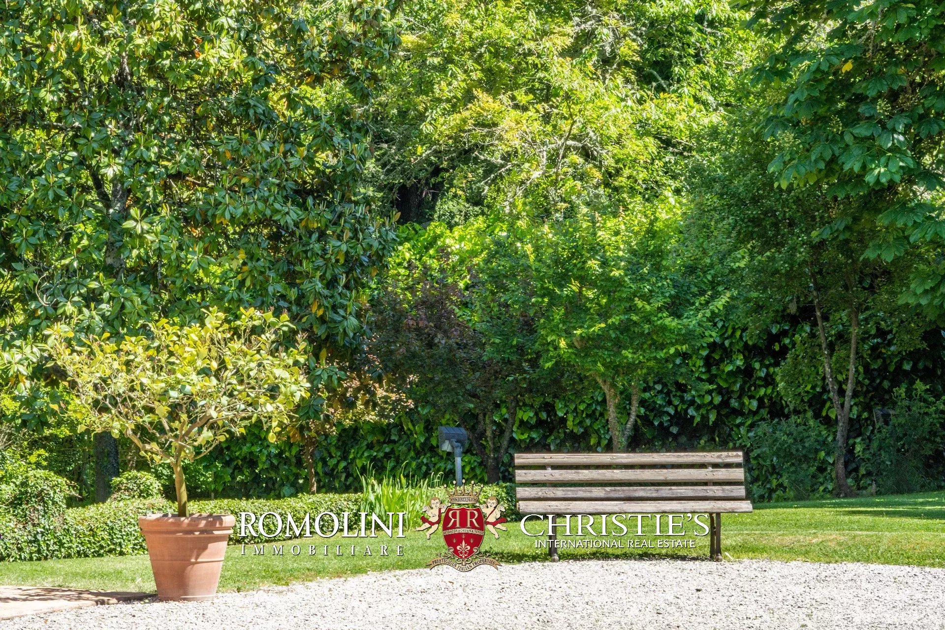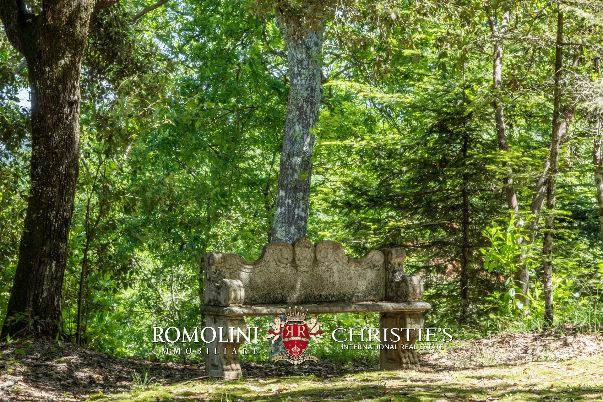 La villa si trova al centro di un appezzamento di terreno di circa 18,0 ettari, posti in posizione collinare e coperti quasi interamente da boschi (16,9 ha) che assicurano privacy e riservatezza. Il giardino (8.500 m²) è in ottime condizioni e circonda gli edifici assicurando ampi spazi aperti con piante ombreggianti per rilassarsi in estate. Una statua commemora il passaggio in zona del condottiero Garibaldi nel 1849.