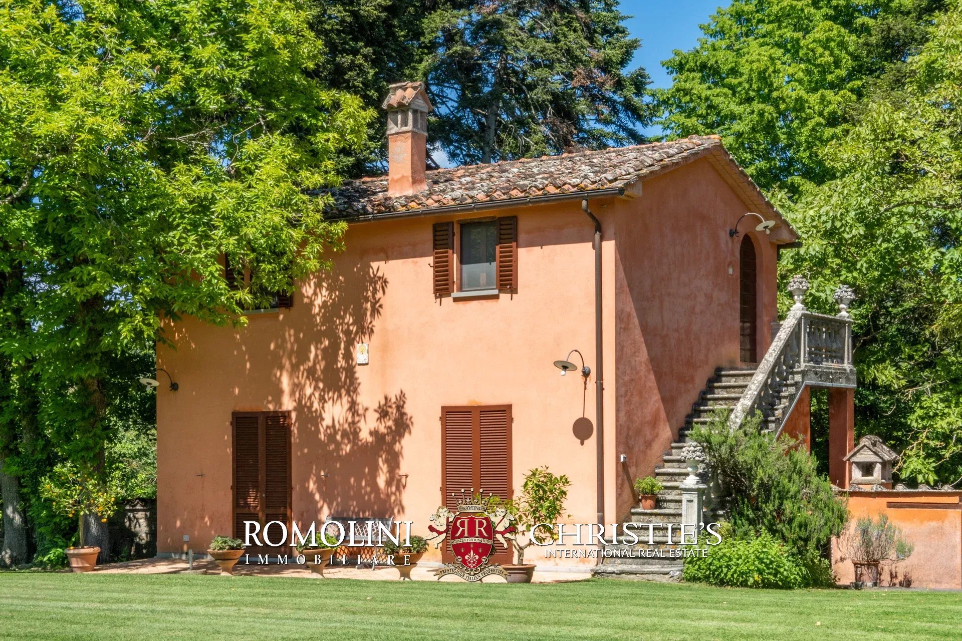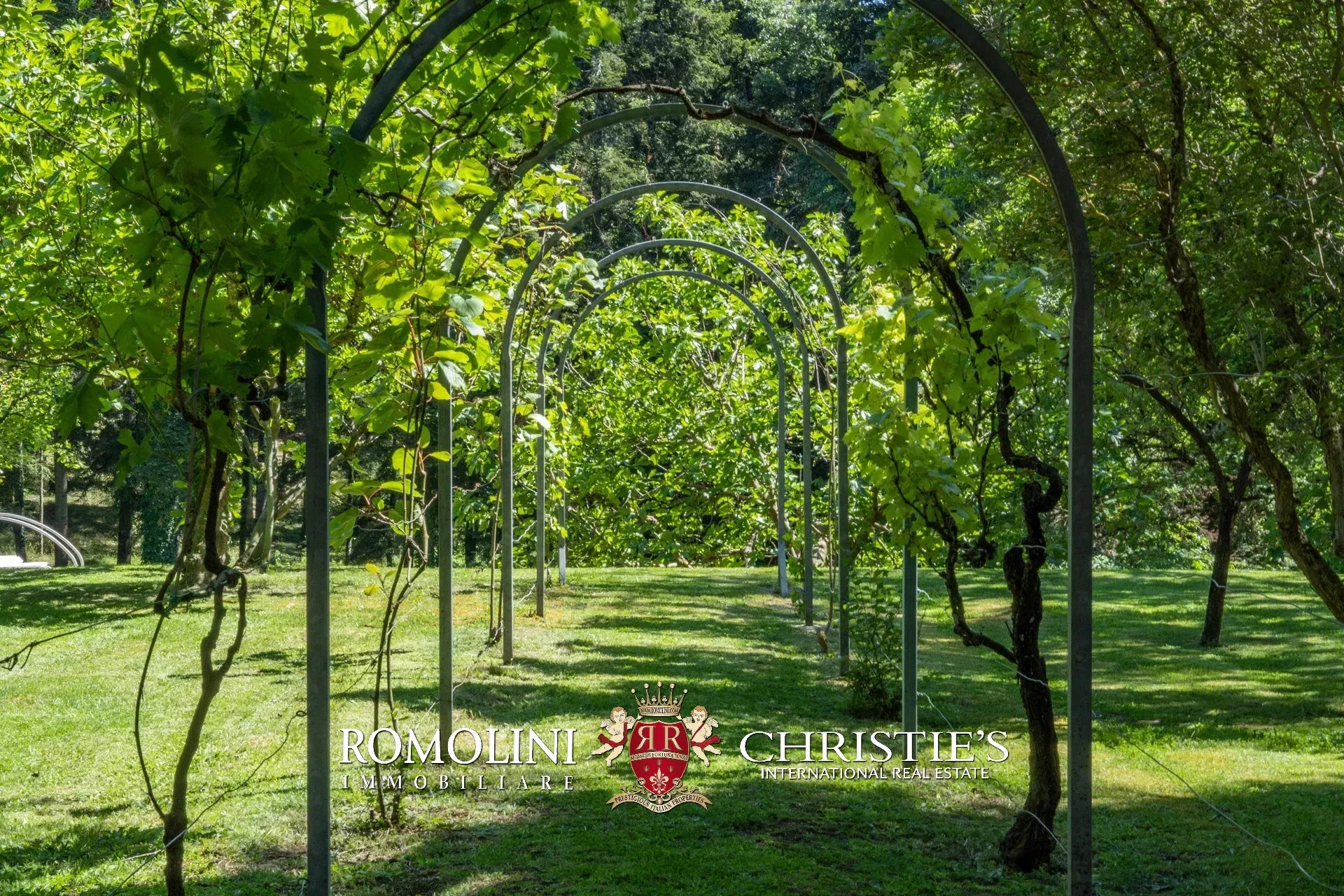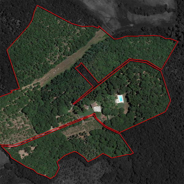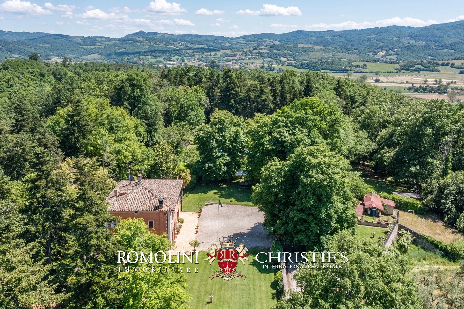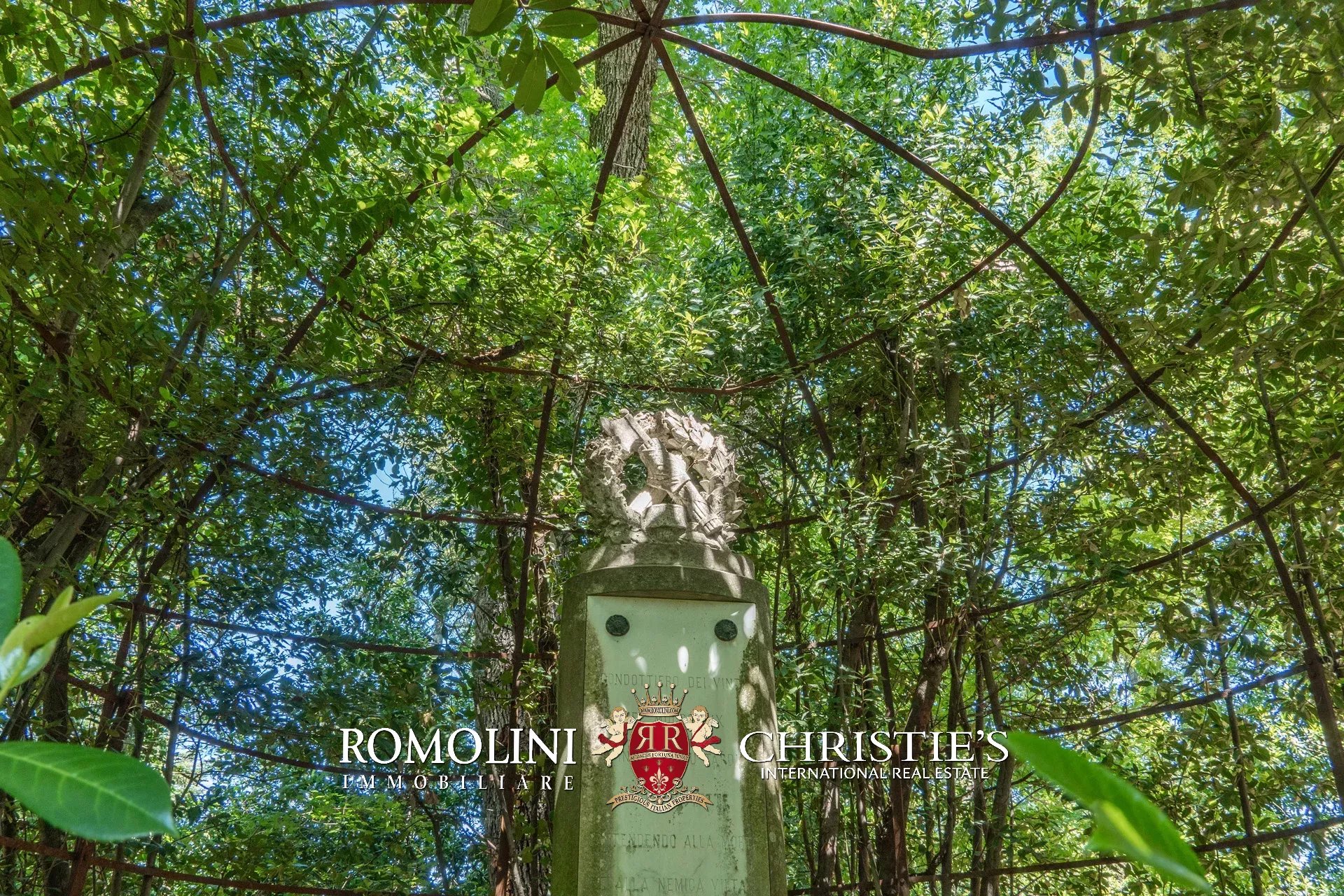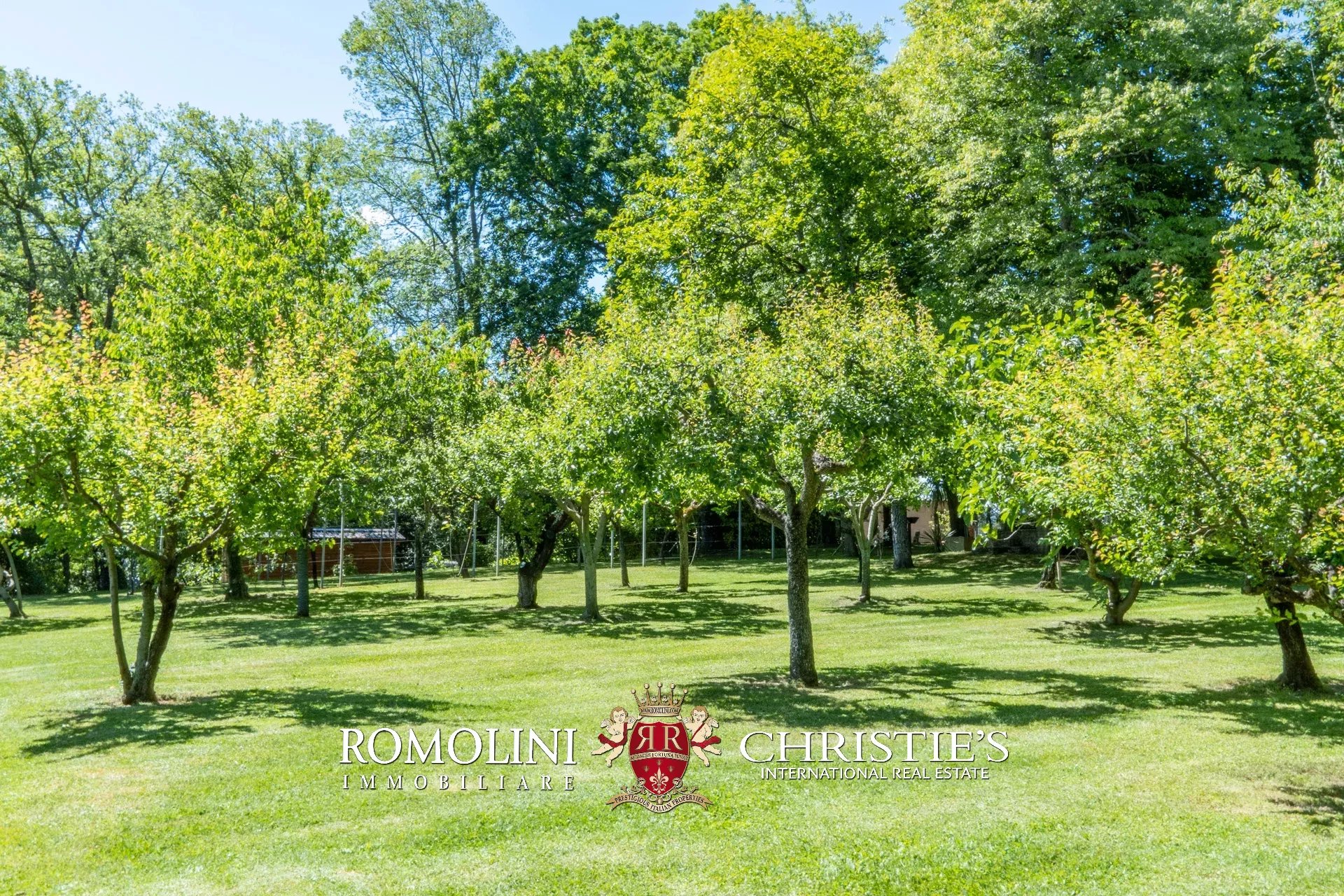 La villa si trova al centro di un appezzamento di terreno di circa 18,0 ettari, posti in posizione collinare e coperti quasi interamente da boschi (16,9 ha) che assicurano privacy e riservatezza. Il giardino (8.500 m²) è in ottime condizioni e circonda gli edifici assicurando ampi spazi aperti con piante ombreggianti per rilassarsi in estate. Una statua commemora il passaggio in zona del condottiero Garibaldi nel 1849.
