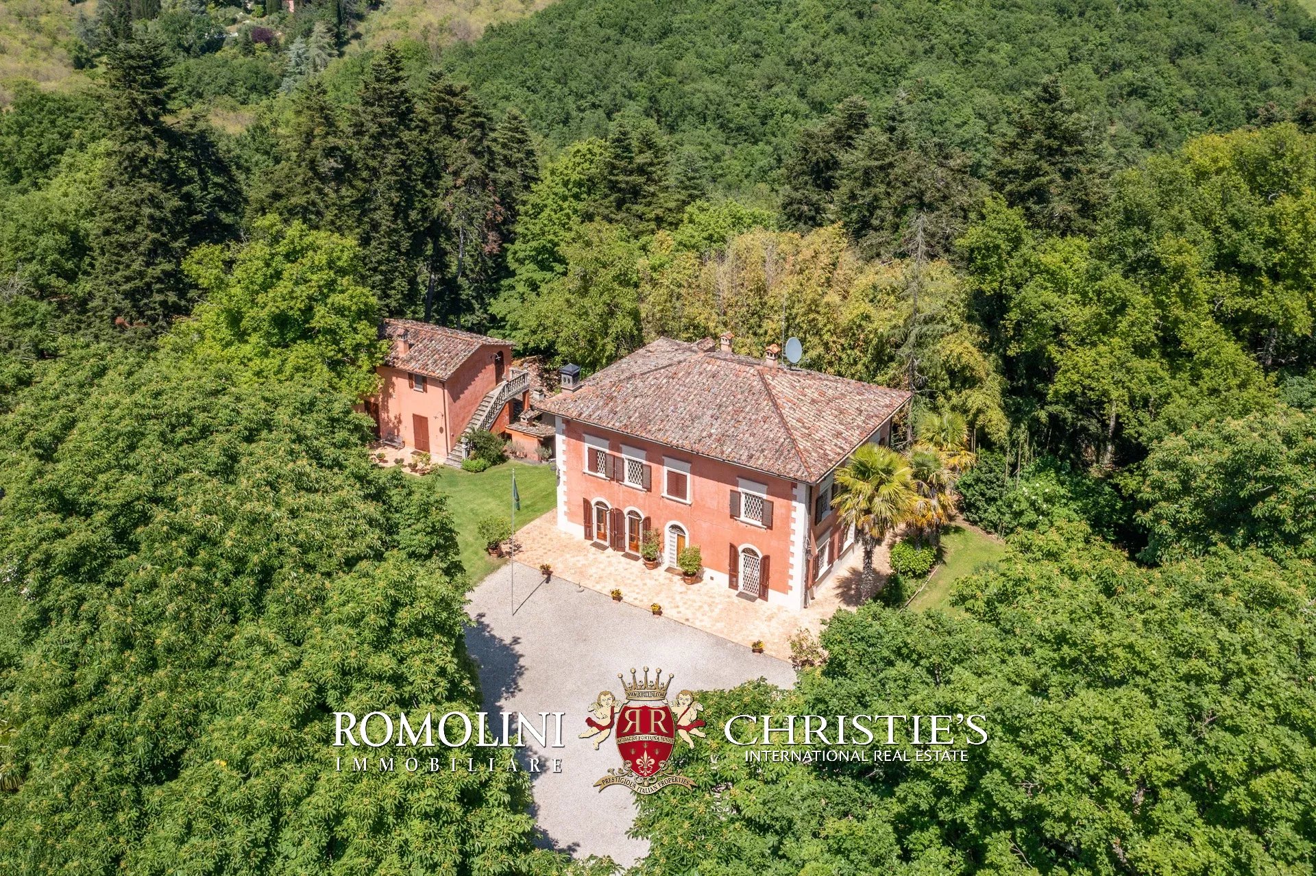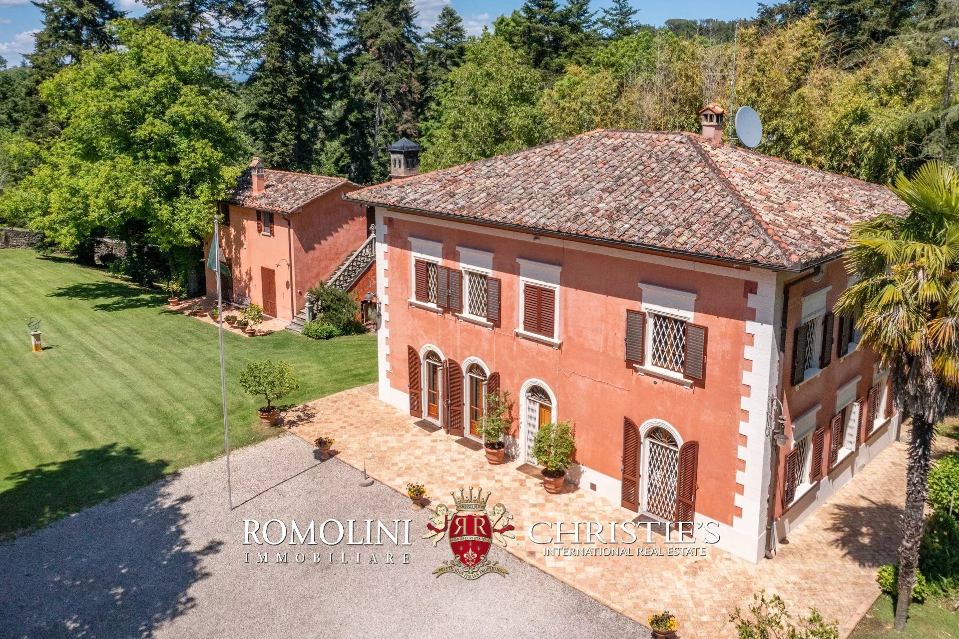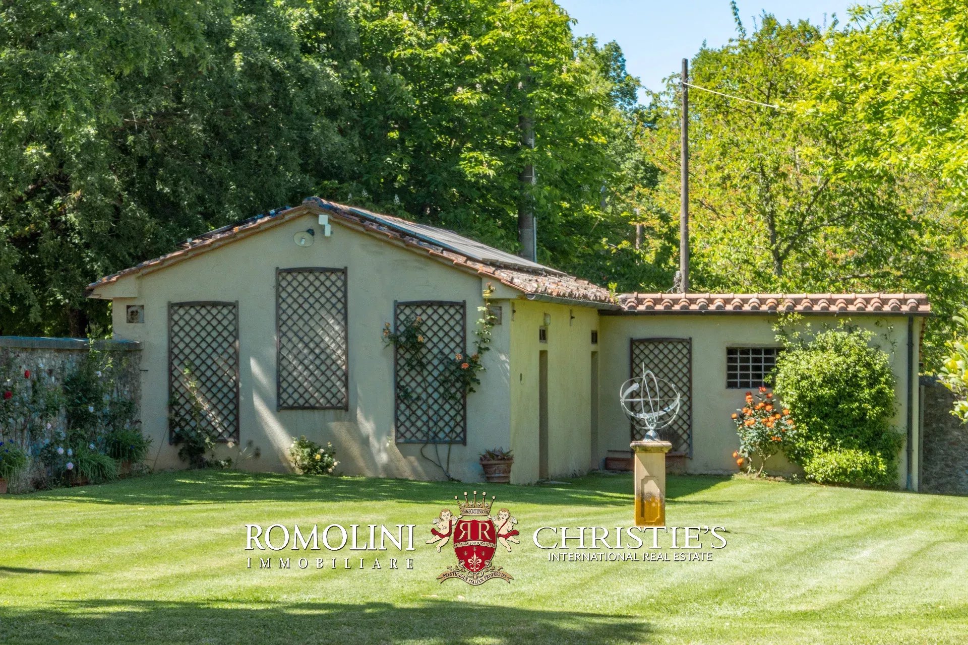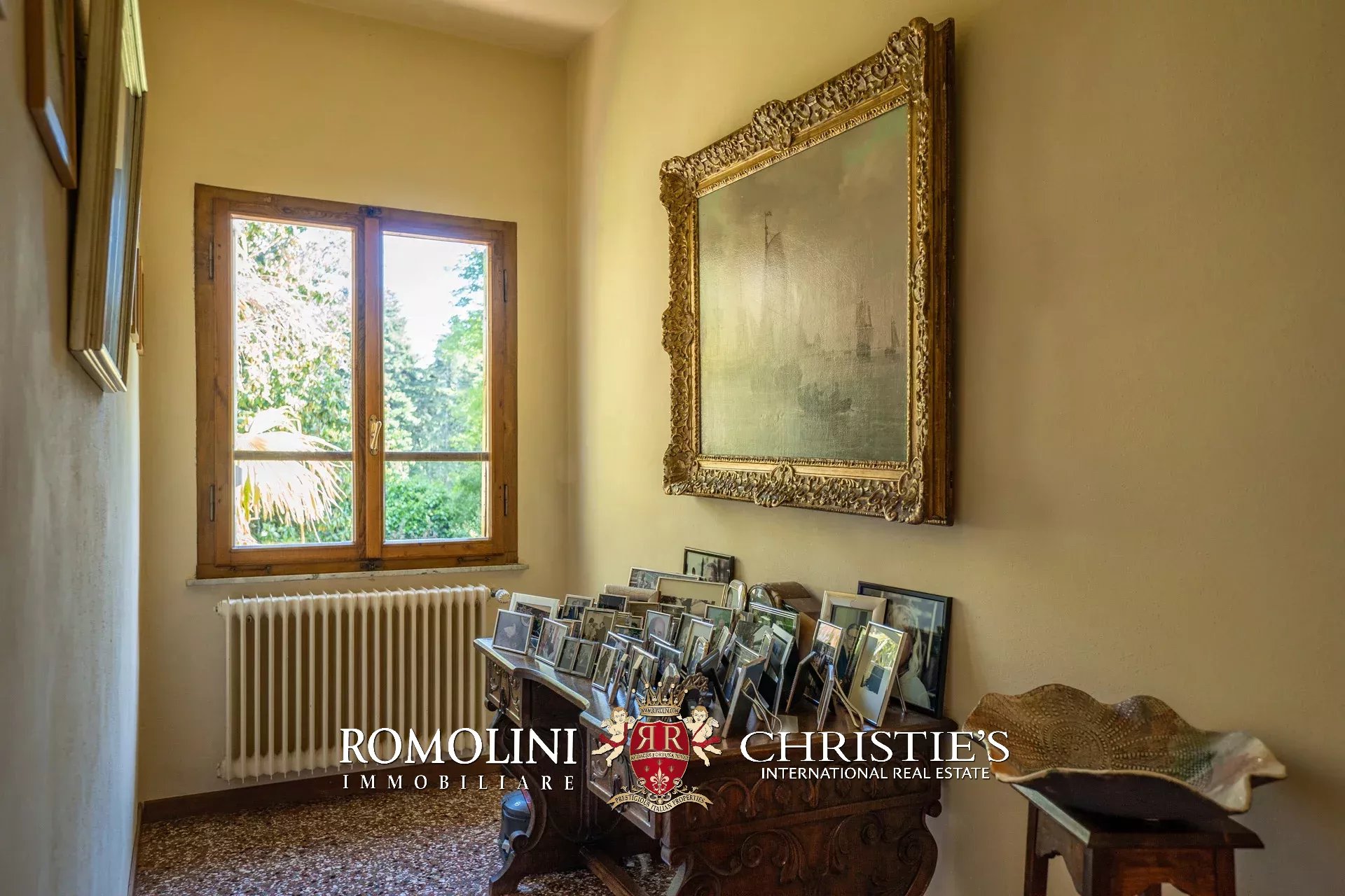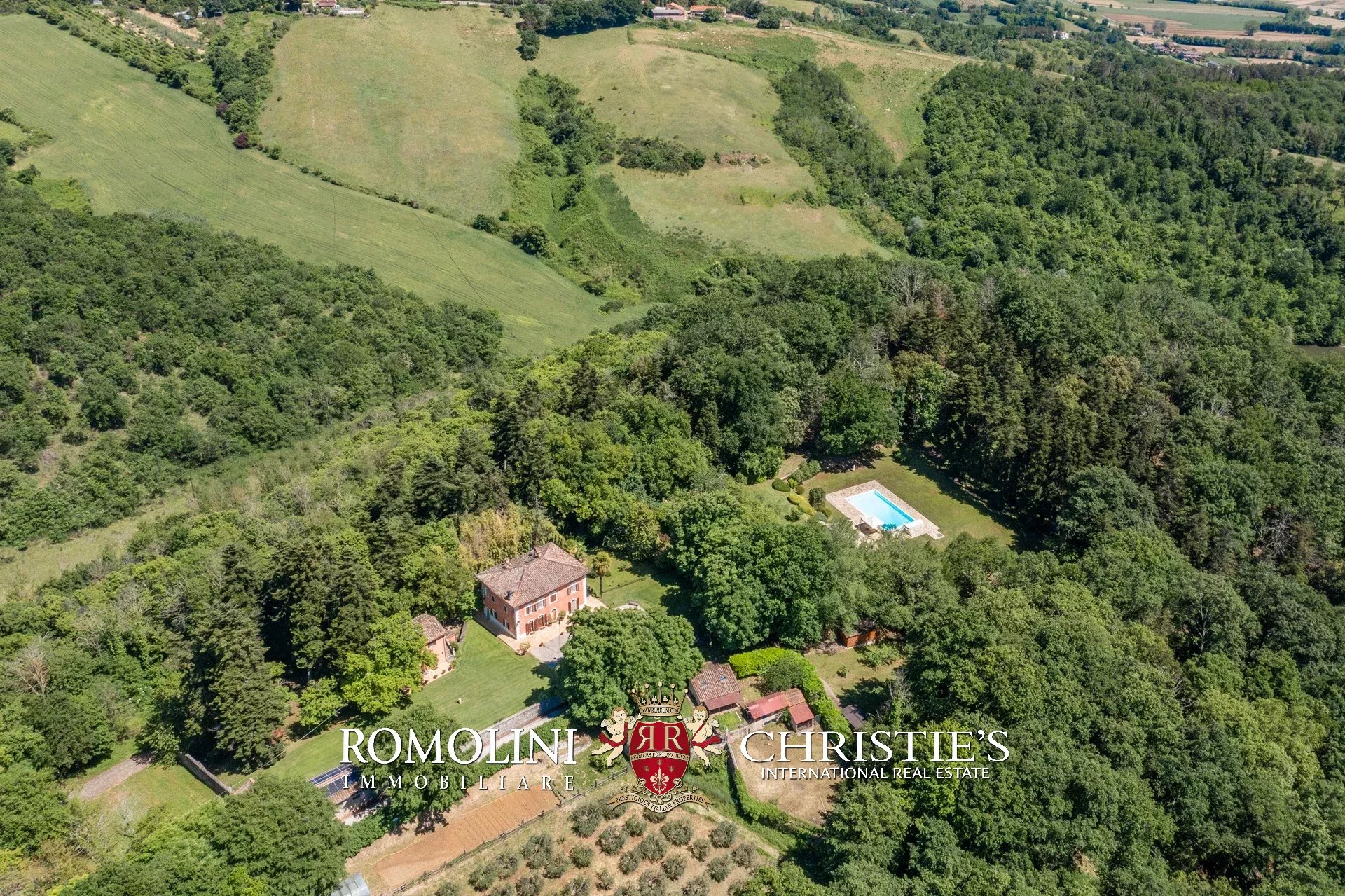 La villa si trova al centro di un appezzamento di terreno di circa 18,0 ettari, posti in posizione collinare e coperti quasi interamente da boschi (16,9 ha) che assicurano privacy e riservatezza. Il giardino (8.500 m²) è in ottime condizioni e circonda gli edifici assicurando ampi spazi aperti con piante ombreggianti per rilassarsi in estate. Una statua commemora il passaggio in zona del condottiero Garibaldi nel 1849.