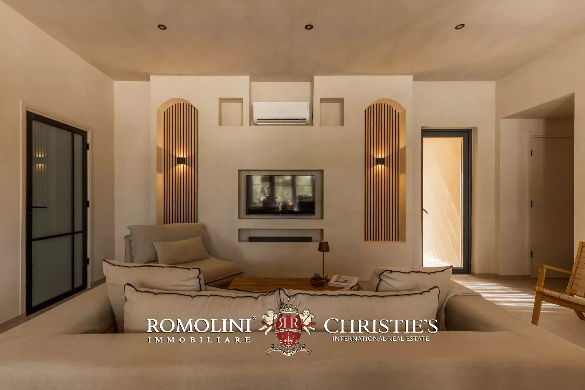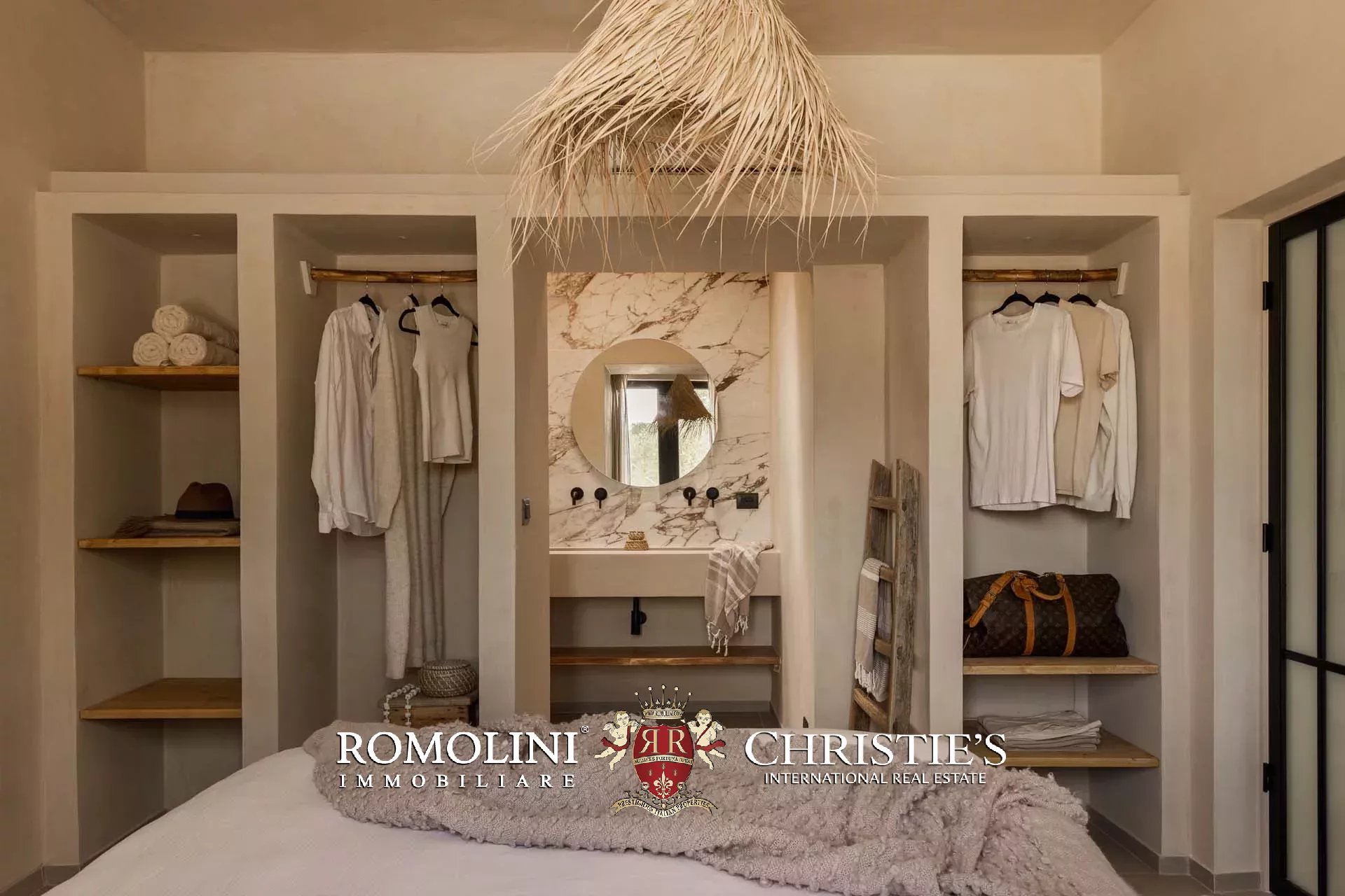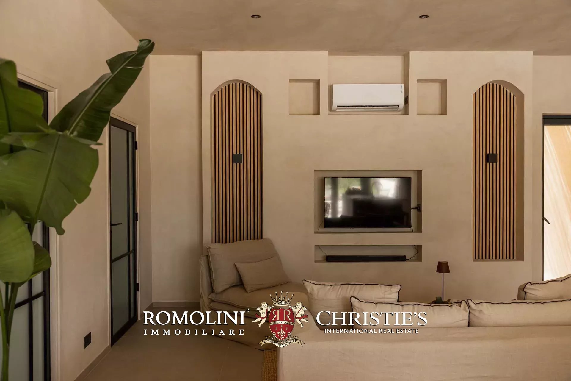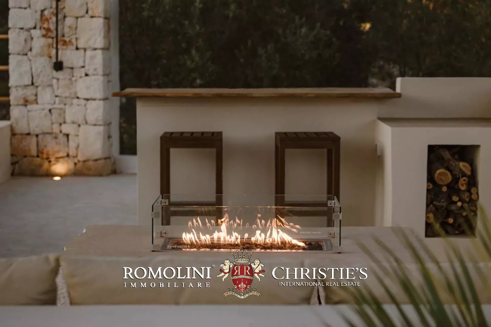 L’area esterna di 10.386 m² è un vero e proprio oasi di relax, con una spettacolare piscina a sfioro 10 × 4 m circondata da una zona solarium attrezzata. Una grande veranda coperta ospita comodi salottini per godere della tranquillità del luogo, mentre la cucina esterna permette di vivere a pieno l’estate in compagnia. Completa il tutto una vasca idromassaggio jacuzzi con vista sul paesaggio circostante. L’intero terreno è recintato da muretti a secco tipici della zona e il verde è dotato di impianto d’irrigazione con cisterna di raccolta per le acque meteoriche.