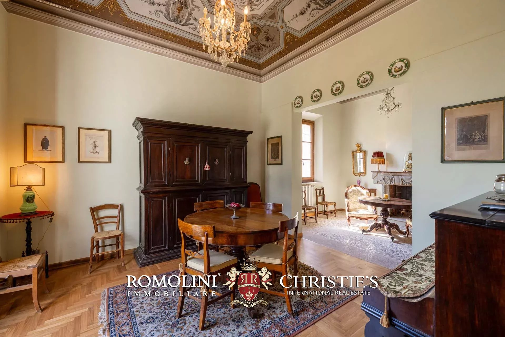 La villa padronale (340 m², 4 camere e 2 bagni), disposta su due livelli, si distingue per ambienti ampi, luminosi e armoniosamente distribuiti. L’ingresso si apre su un maestoso androne che conduce alle zone di rappresentanza: una raffinata sala da pranzo con camino, una cucina principale affiancata da un pratico cucinotto e ulteriori saloni ideali per accogliere ospiti in un contesto di grande eleganza. Al piano terra si trova inoltre una camera con bagno.