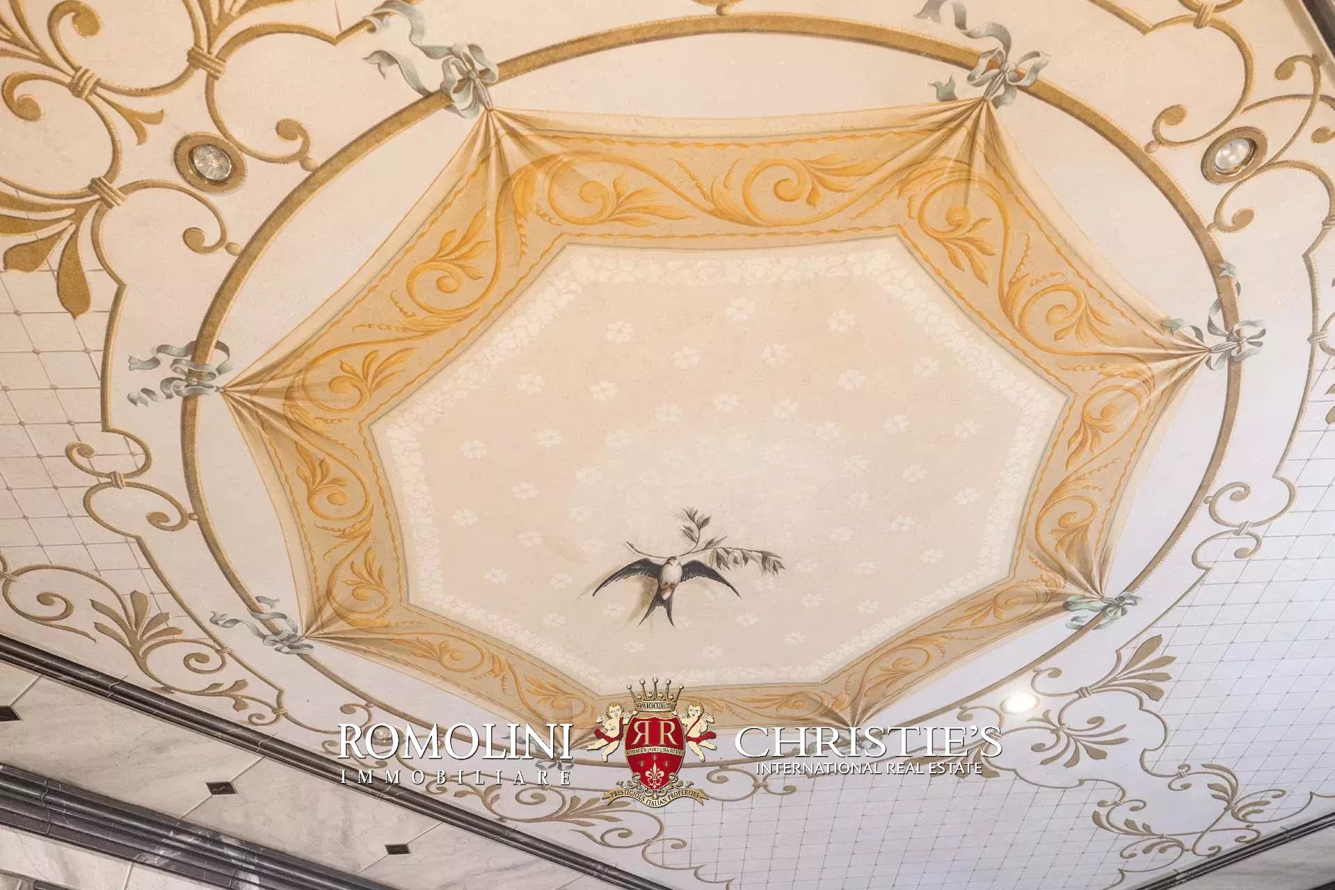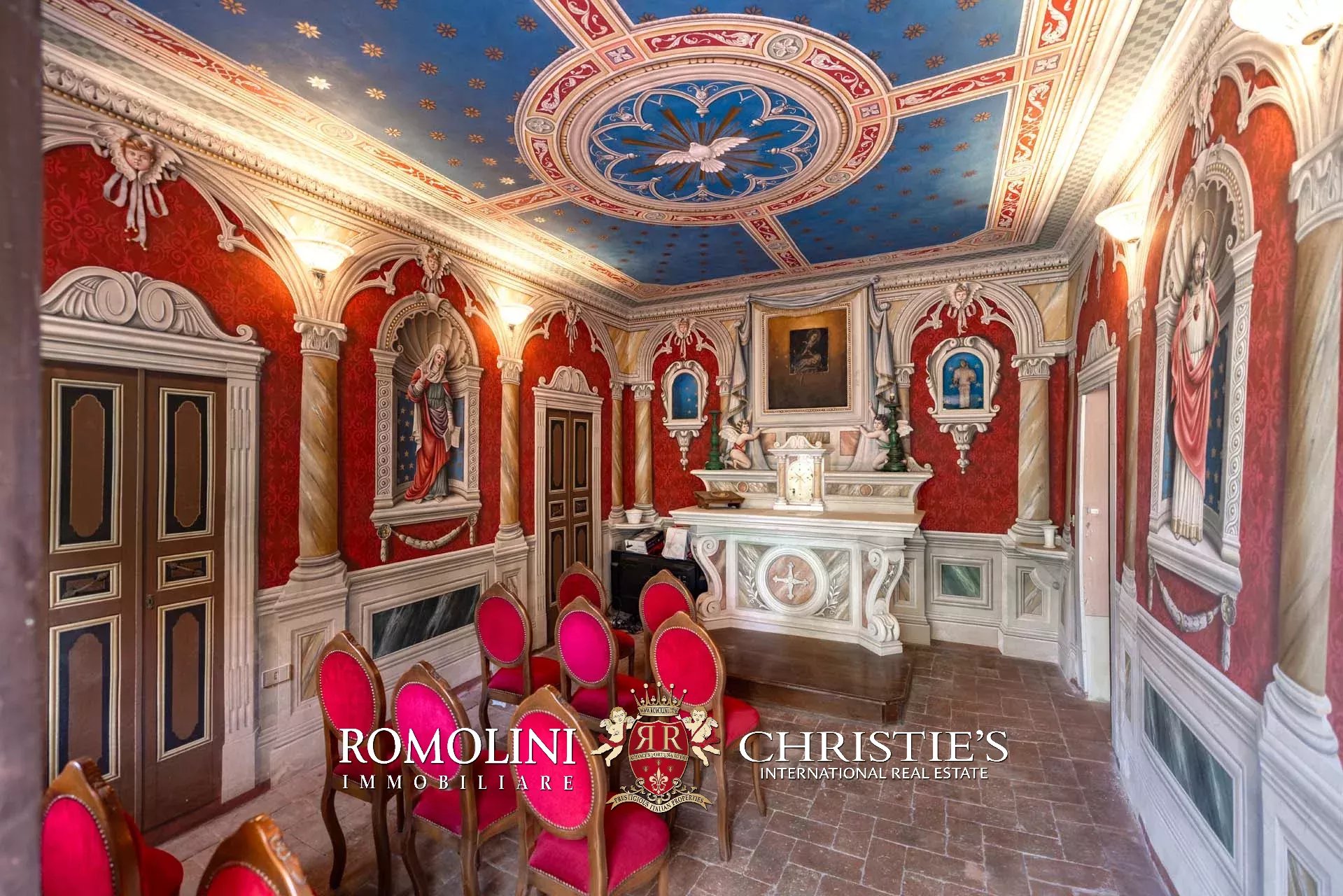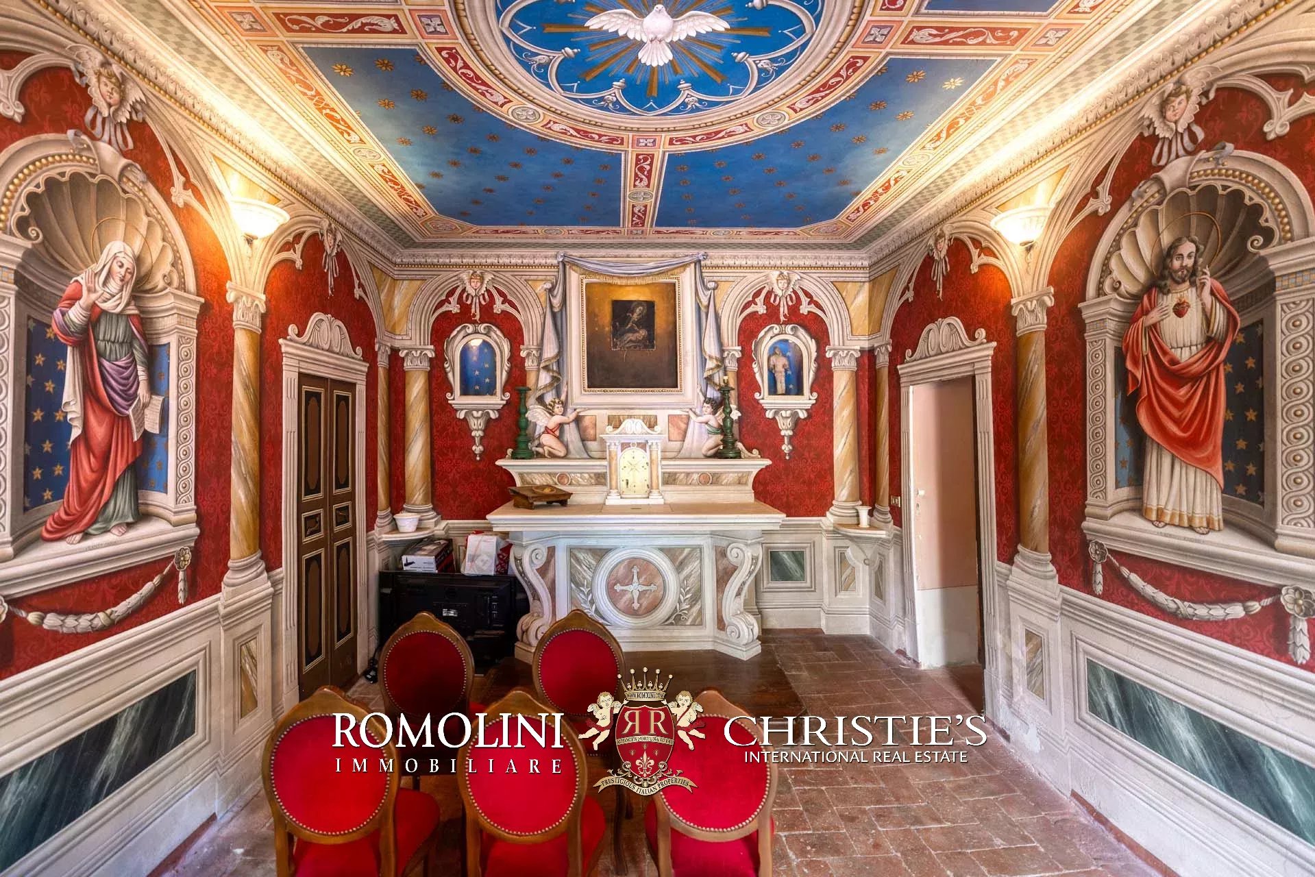 - Piano terra: salone di rappresentanza, salotto, sala da pranzo doppia con portico, cucina, ufficio privato, camera con bagno, cappella gentilizia e lavanderia sottoscala;