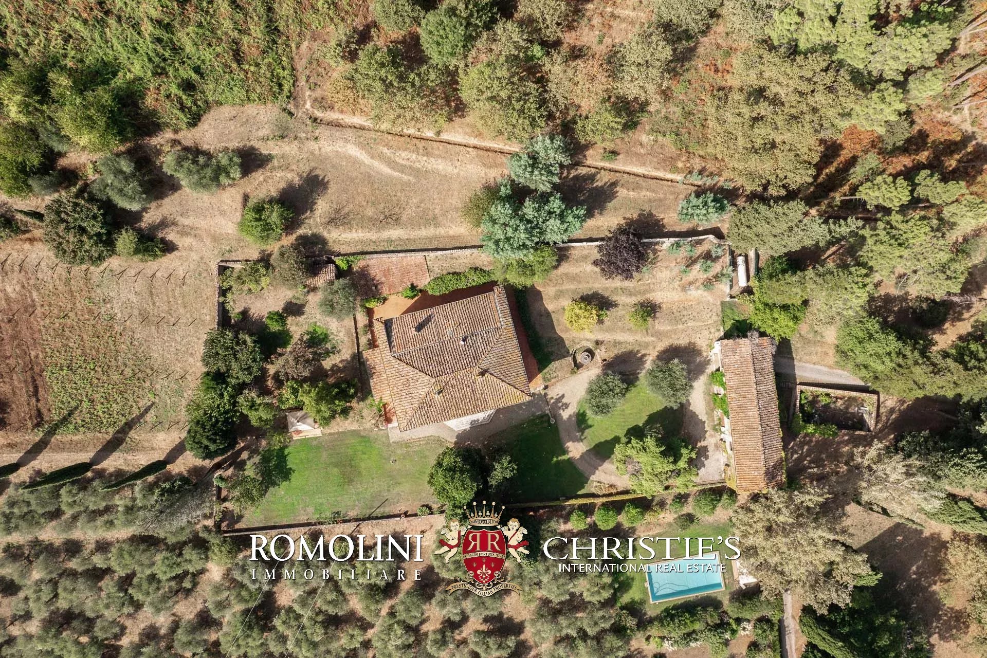 Il resto della proprietà è costituito da terreni agricoli ripartiti tra seminativo (2,2 ha), un ampio oliveto (1,8 ha) e bosco mediterraneo (2,4 ha) sul lato nord della proprietà, così da garantire privacy e riservatezza, oltre che riparo da rumori.