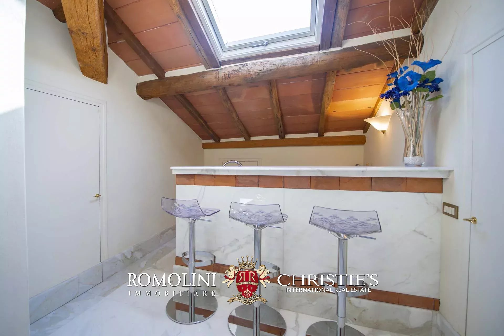 Ancora più in alto si trova la mansarda, che ospita un angolo bar, una camera matrimoniale con bagno privato e alcune soffitte (per le quali esiste già un progetto di conversione in altre due camere se interessati).