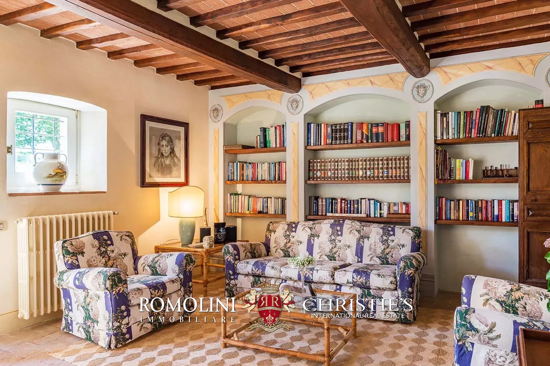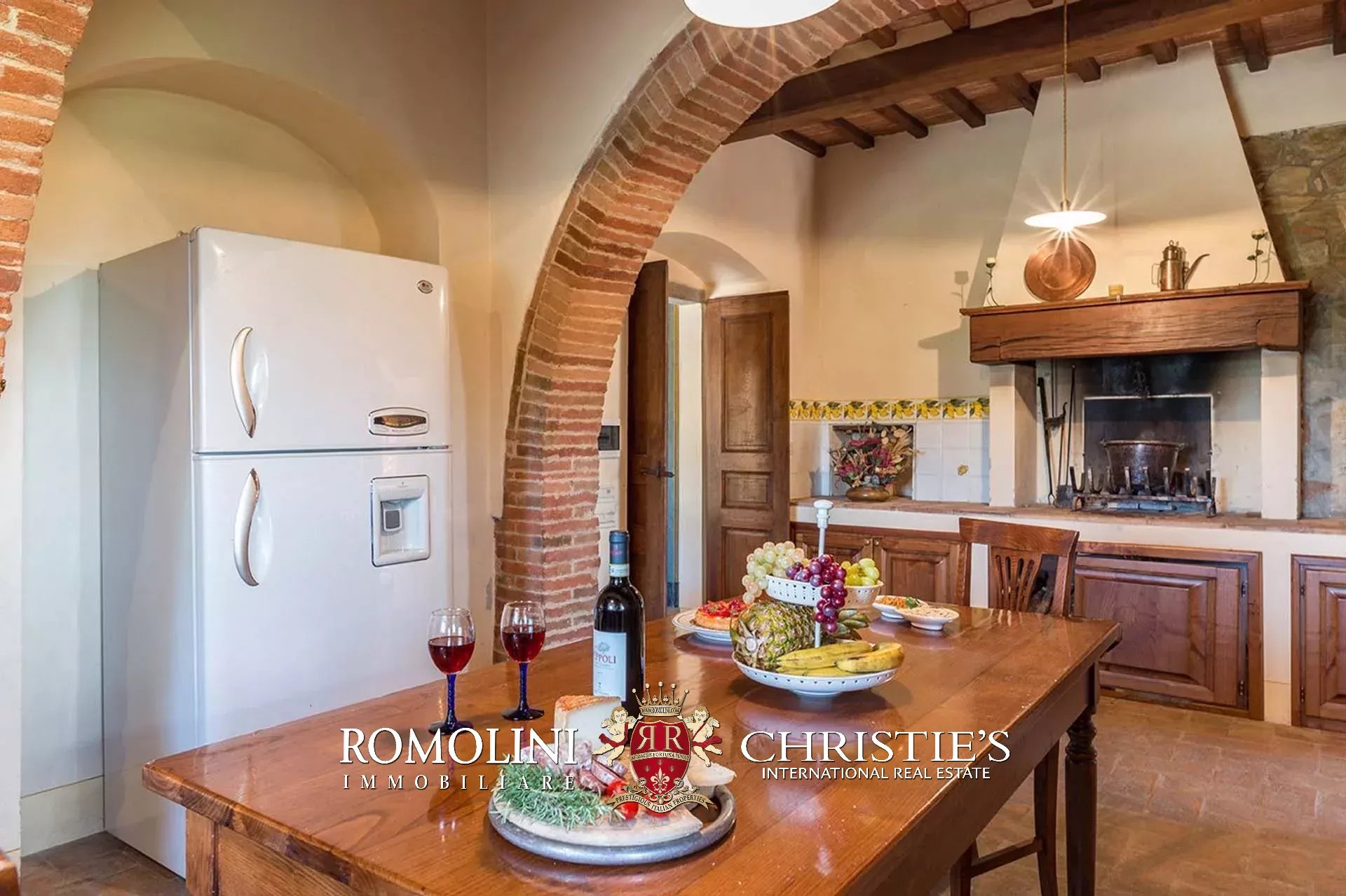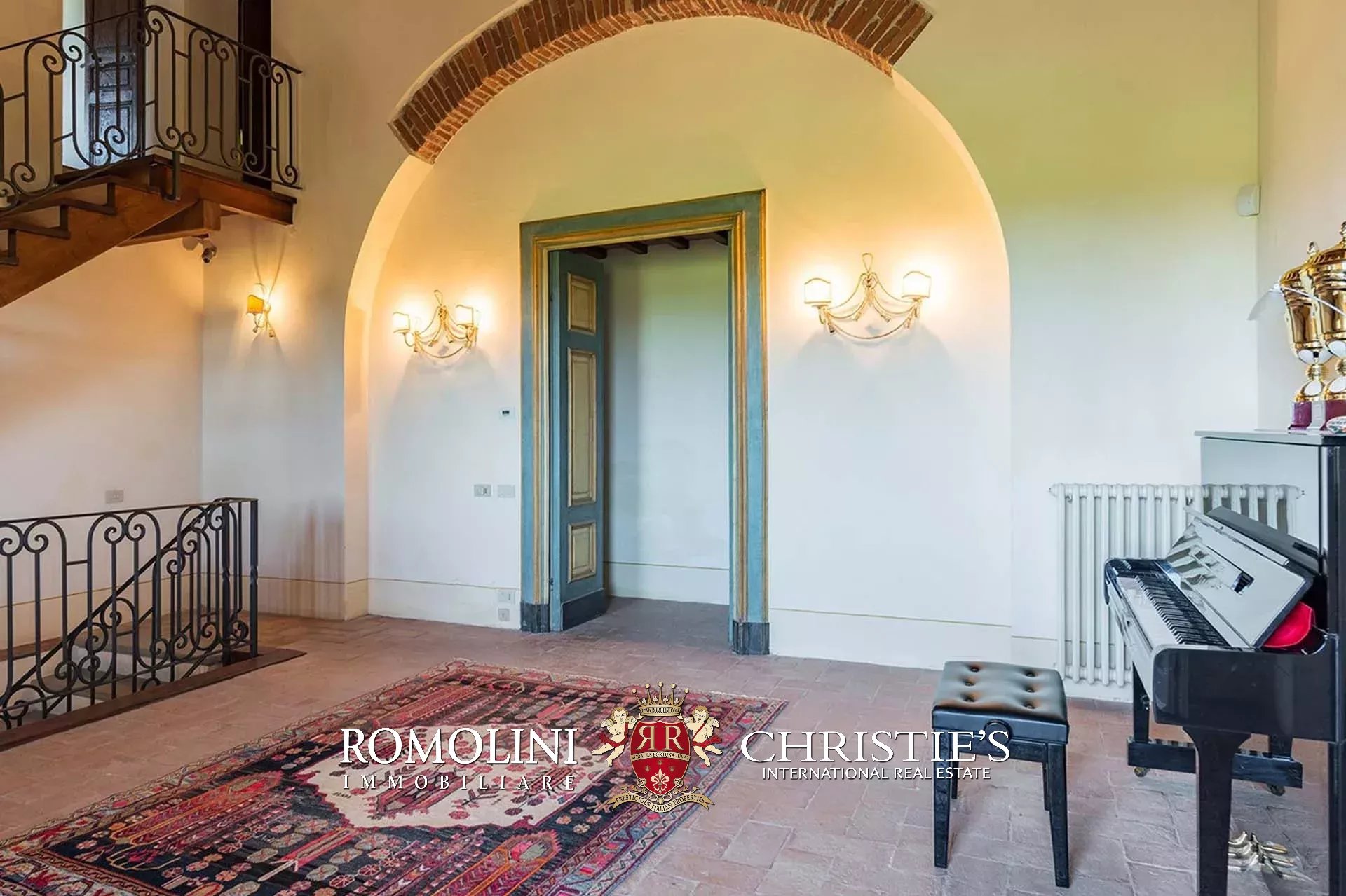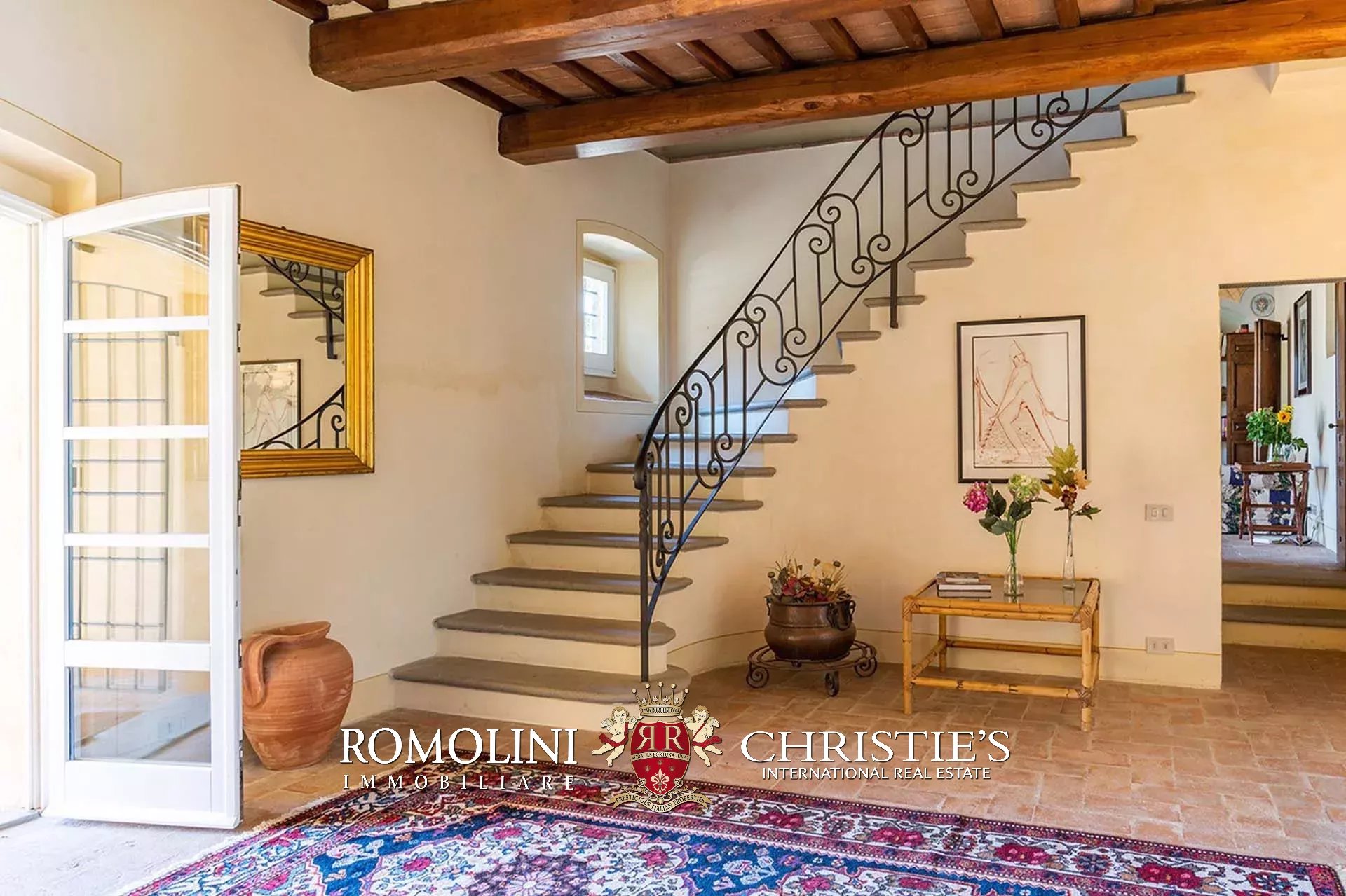 La villa (465 m², 6 camere e 6 bagni) è la classica dimora signorile di campagna, parzialmente intonacata e ancora dotata della caratteristica torretta in pietra all’angolo risalente al Duecento. Dal giardino si entra nel vano d’ingresso dell’edificio con la scala che porta ai piani superiori. Procedendo oltre si arriva alla grande zona giorno divisa in tre accoglienti ambienti. Dalla zona lettura una scala scende nella cantina interrata, collegata anche all’ingresso. Sempre dall’ingresso, sulla destra, si ha accesso alla cucina e subito oltre alla zona pranzo con grandi finestre sul giardino. All’angolo opposto del piano terra si trovano la lavanderia e un bagno di servizio.