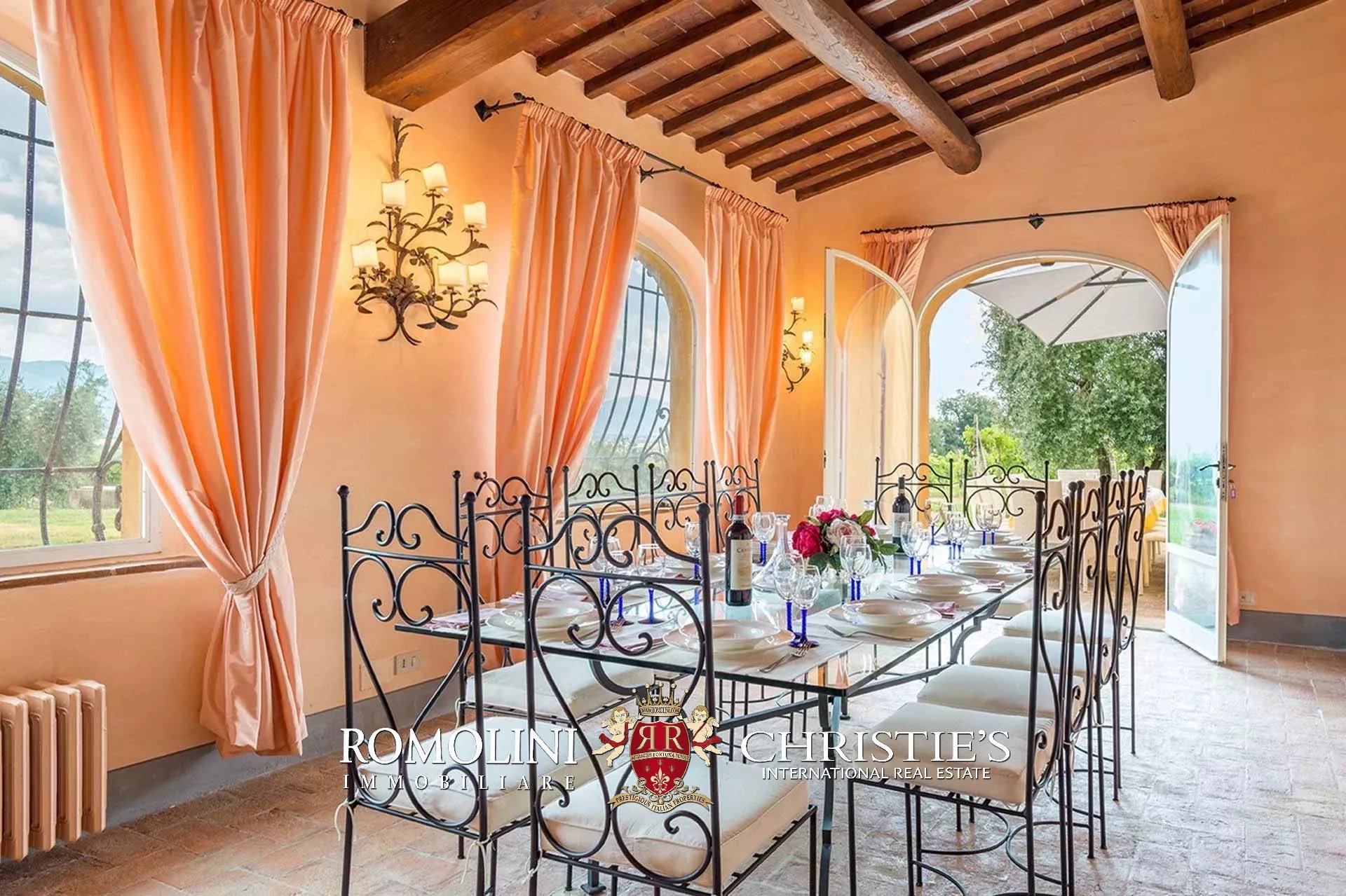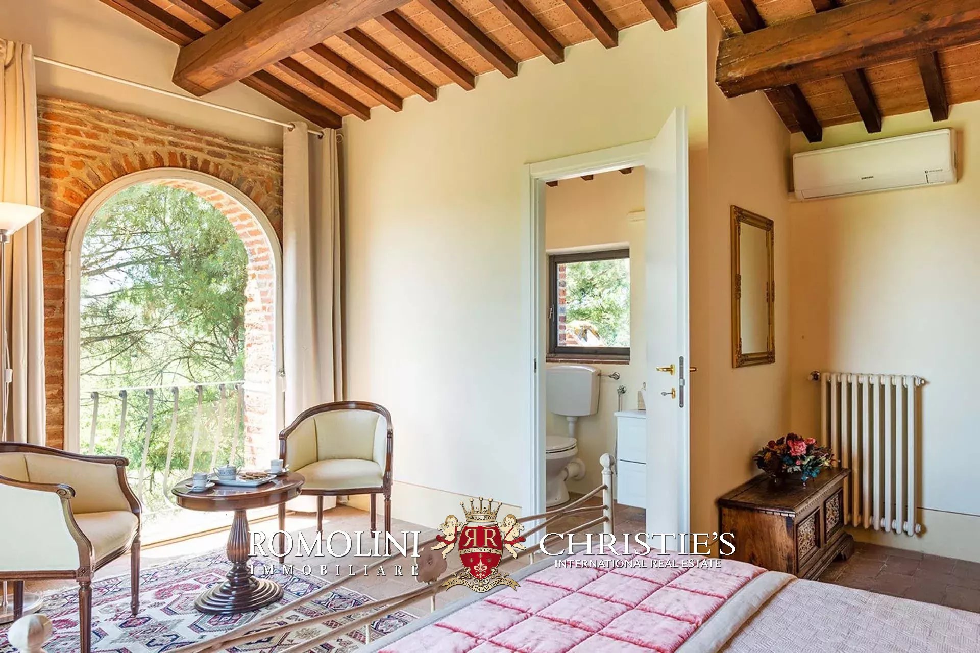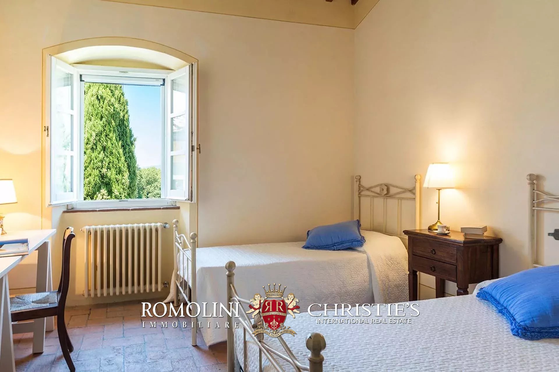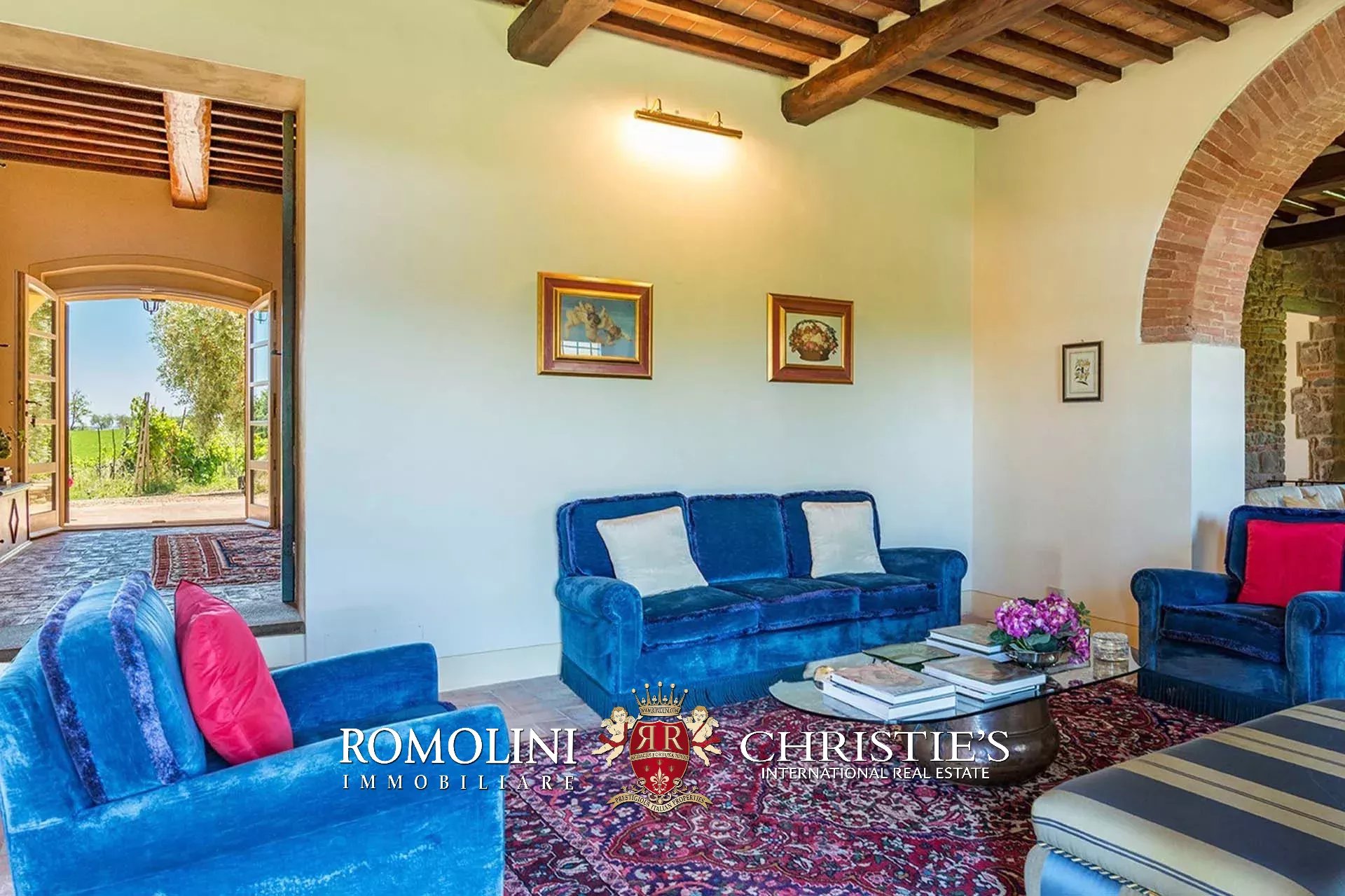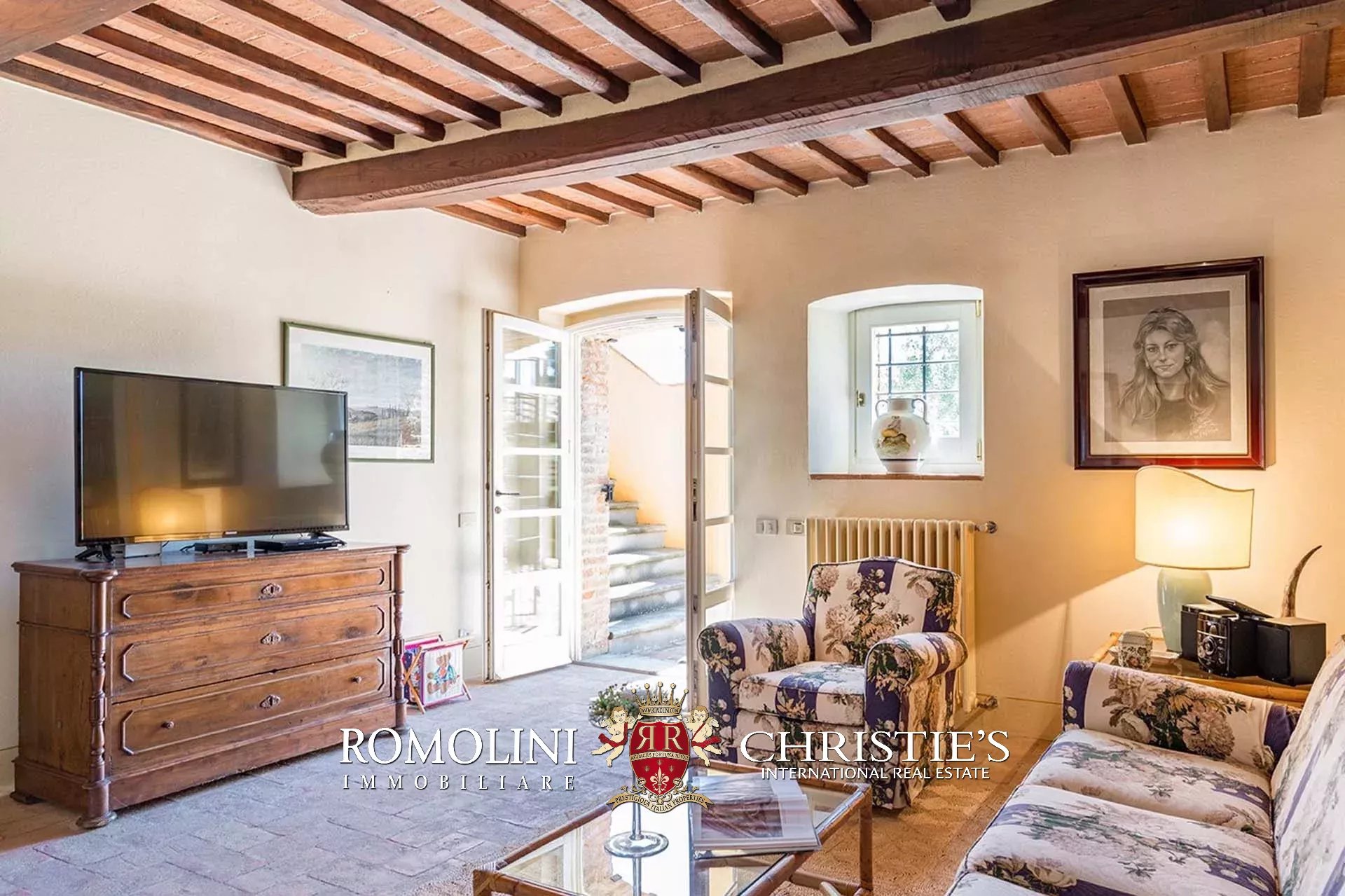 La villa (465 m², 6 camere e 6 bagni) è la classica dimora signorile di campagna, parzialmente intonacata e ancora dotata della caratteristica torretta in pietra all’angolo risalente al Duecento. Dal giardino si entra nel vano d’ingresso dell’edificio con la scala che porta ai piani superiori. Procedendo oltre si arriva alla grande zona giorno divisa in tre accoglienti ambienti. Dalla zona lettura una scala scende nella cantina interrata, collegata anche all’ingresso. Sempre dall’ingresso, sulla destra, si ha accesso alla cucina e subito oltre alla zona pranzo con grandi finestre sul giardino. All’angolo opposto del piano terra si trovano la lavanderia e un bagno di servizio.