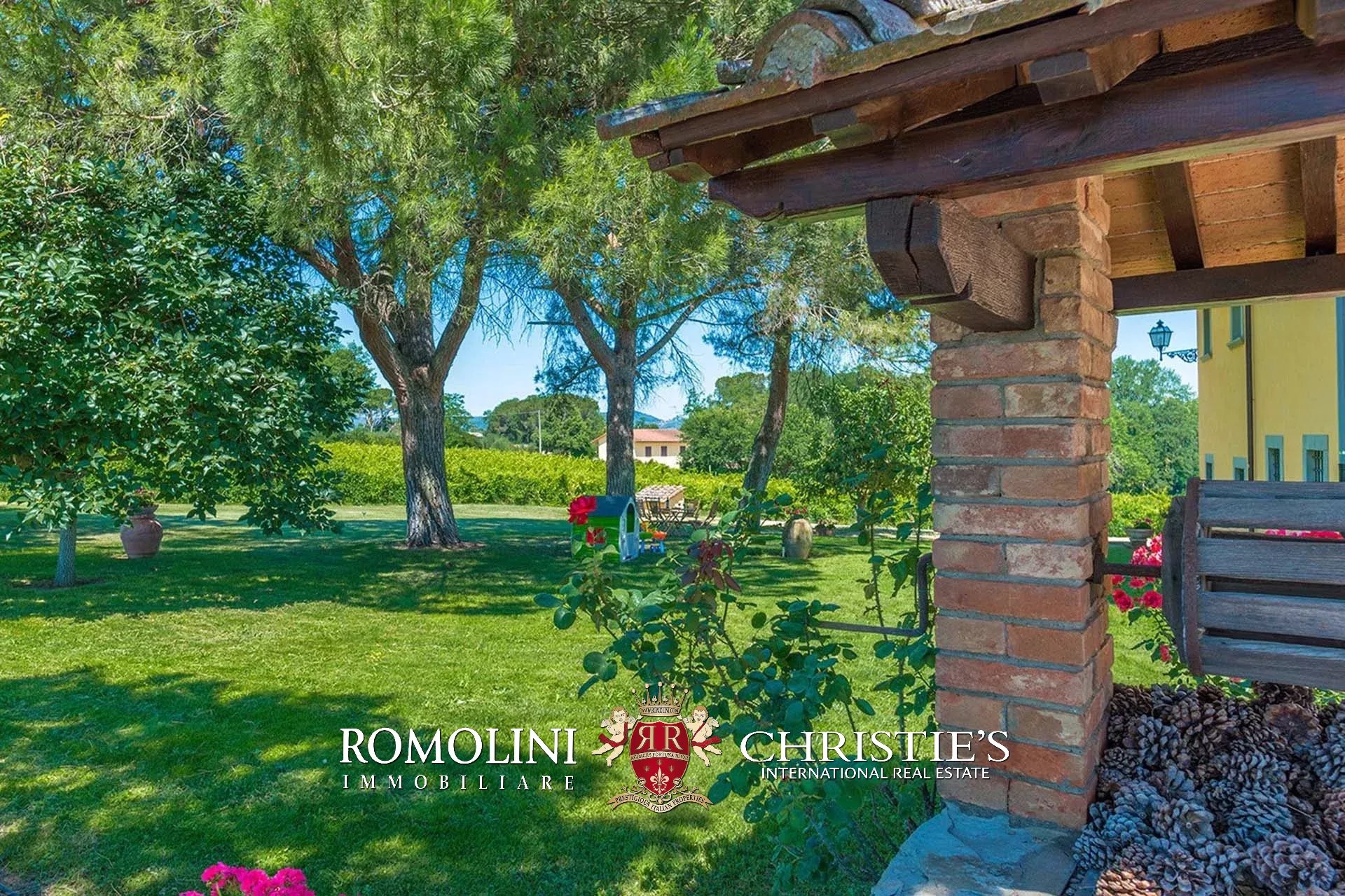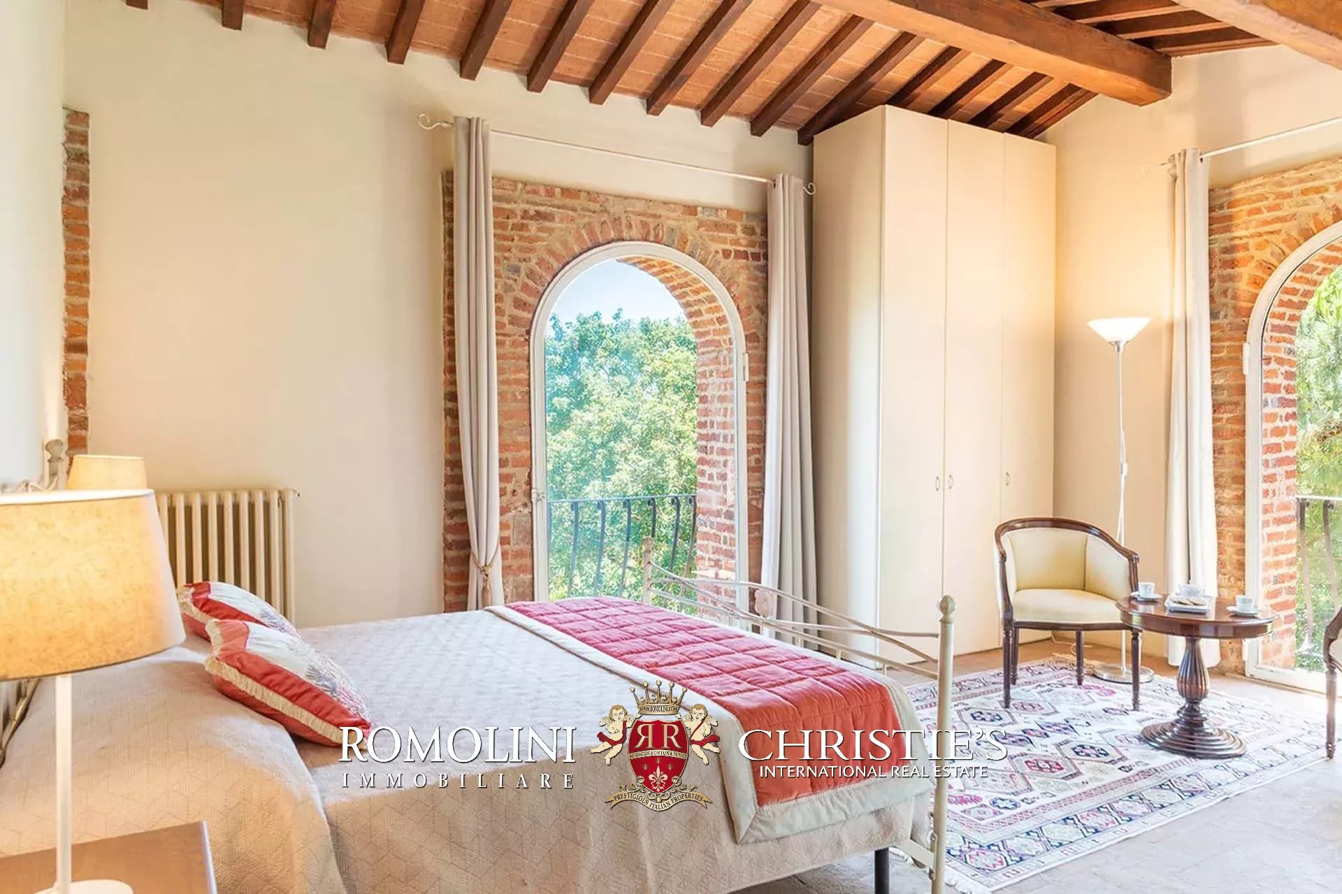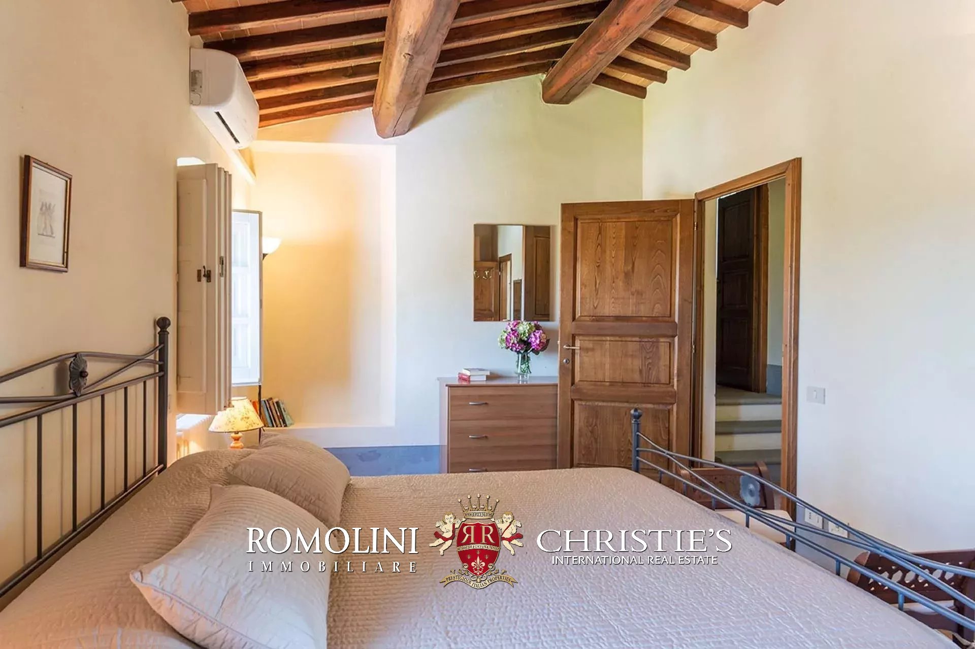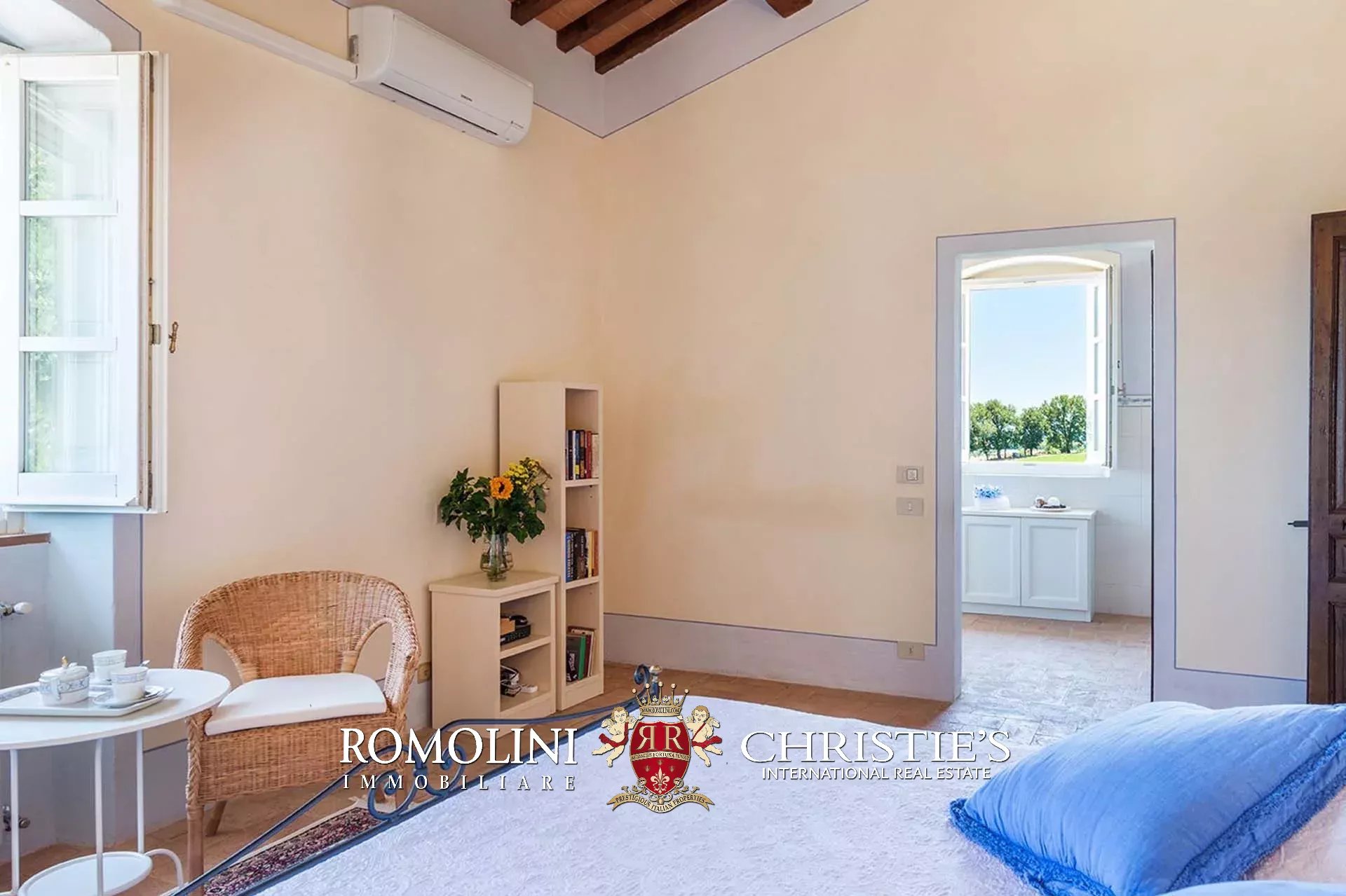 La villa (465 m², 6 camere e 6 bagni) è la classica dimora signorile di campagna, parzialmente intonacata e ancora dotata della caratteristica torretta in pietra all’angolo risalente al Duecento. Dal giardino si entra nel vano d’ingresso dell’edificio con la scala che porta ai piani superiori. Procedendo oltre si arriva alla grande zona giorno divisa in tre accoglienti ambienti. Dalla zona lettura una scala scende nella cantina interrata, collegata anche all’ingresso. Sempre dall’ingresso, sulla destra, si ha accesso alla cucina e subito oltre alla zona pranzo con grandi finestre sul giardino. All’angolo opposto del piano terra si trovano la lavanderia e un bagno di servizio.