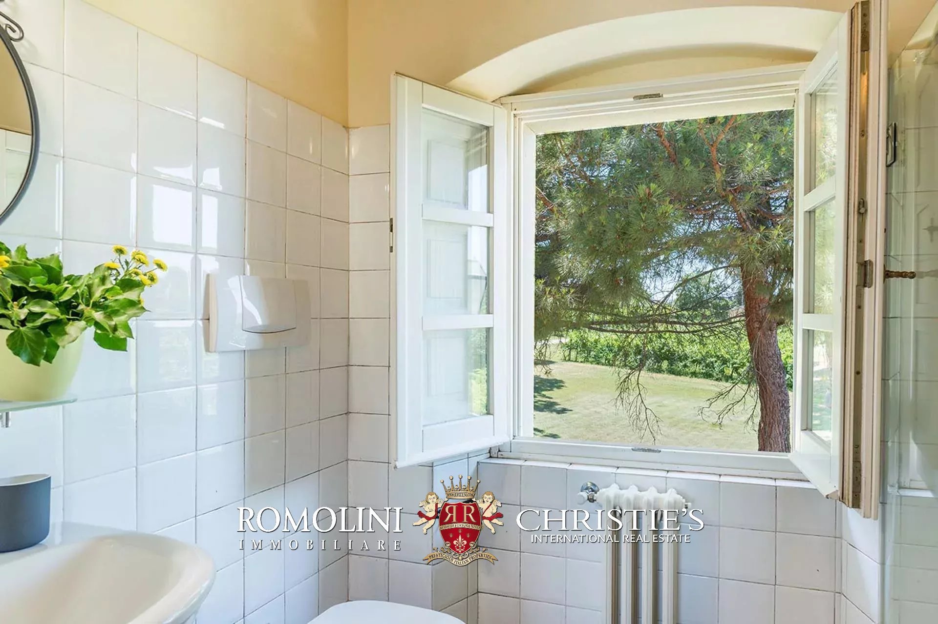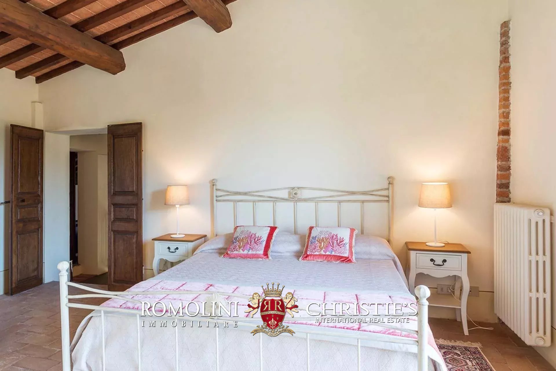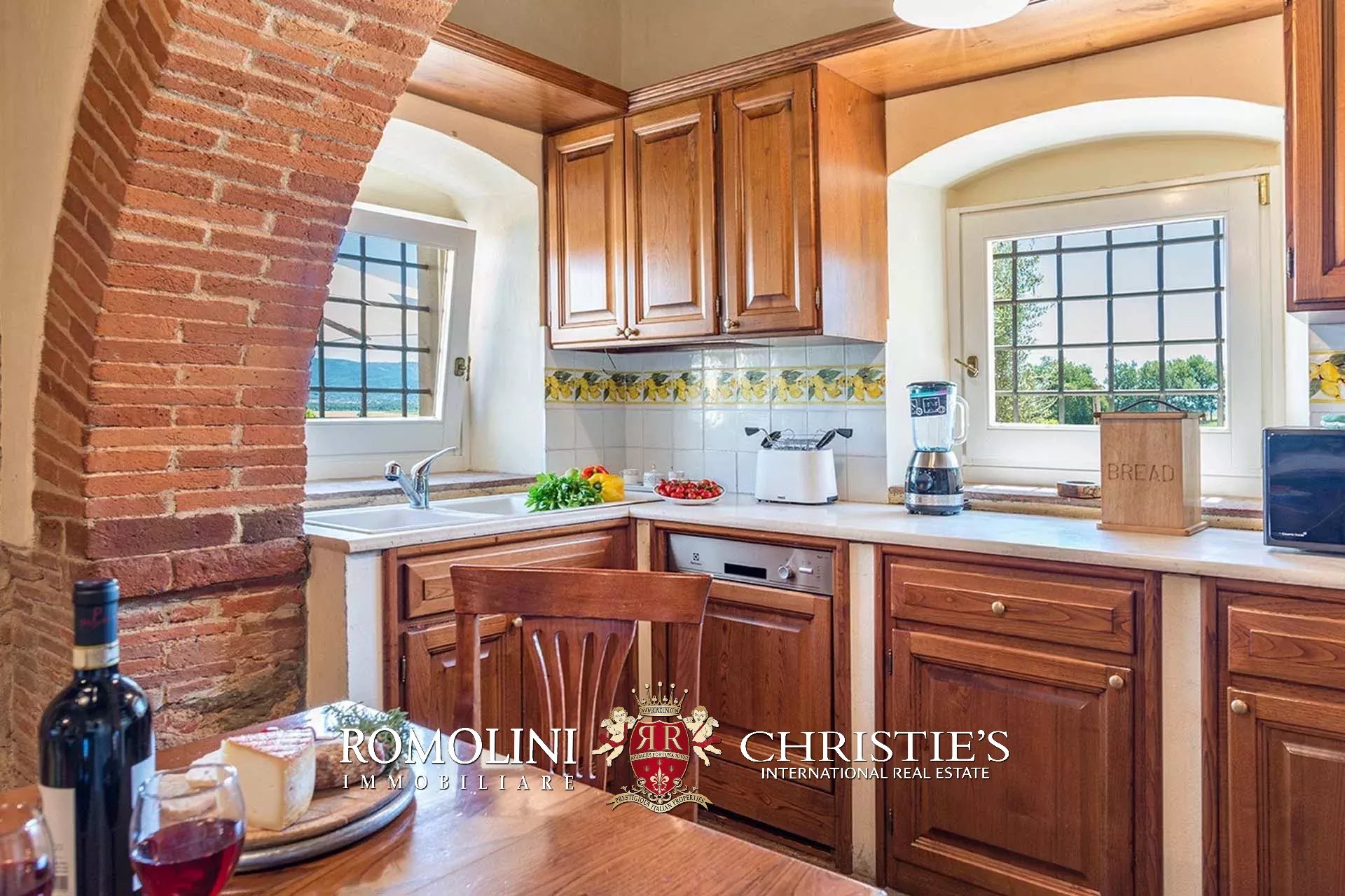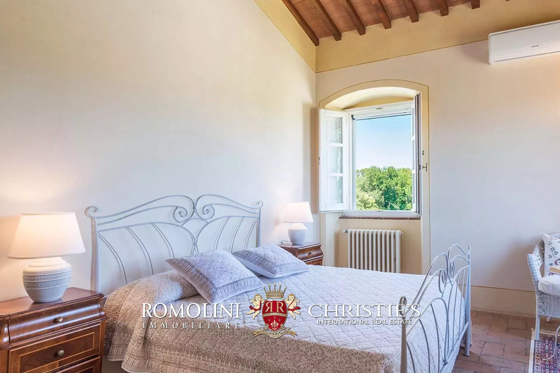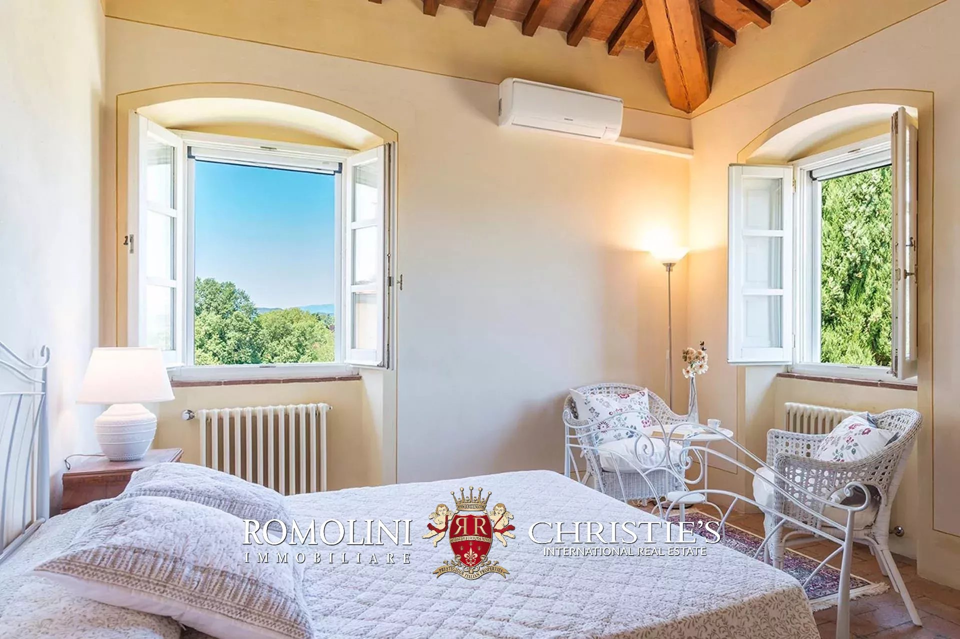 La villa (465 m², 6 camere e 6 bagni) è la classica dimora signorile di campagna, parzialmente intonacata e ancora dotata della caratteristica torretta in pietra all’angolo risalente al Duecento. Dal giardino si entra nel vano d’ingresso dell’edificio con la scala che porta ai piani superiori. Procedendo oltre si arriva alla grande zona giorno divisa in tre accoglienti ambienti. Dalla zona lettura una scala scende nella cantina interrata, collegata anche all’ingresso. Sempre dall’ingresso, sulla destra, si ha accesso alla cucina e subito oltre alla zona pranzo con grandi finestre sul giardino. All’angolo opposto del piano terra si trovano la lavanderia e un bagno di servizio.