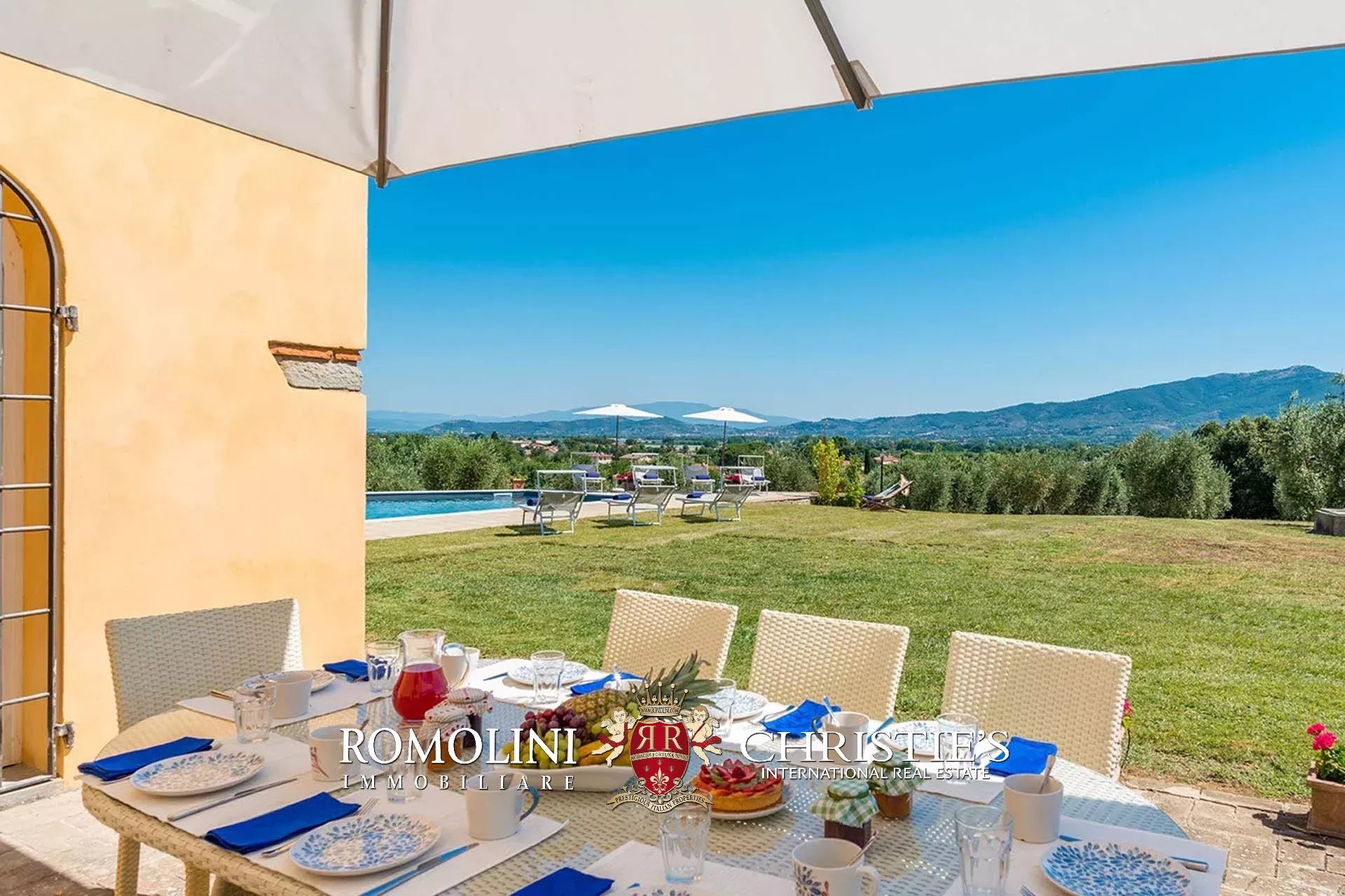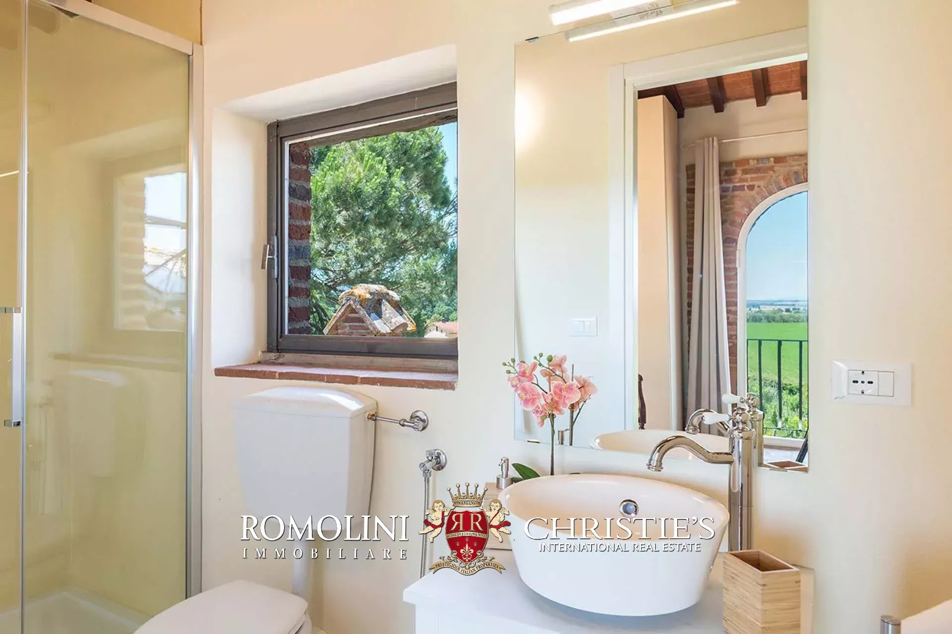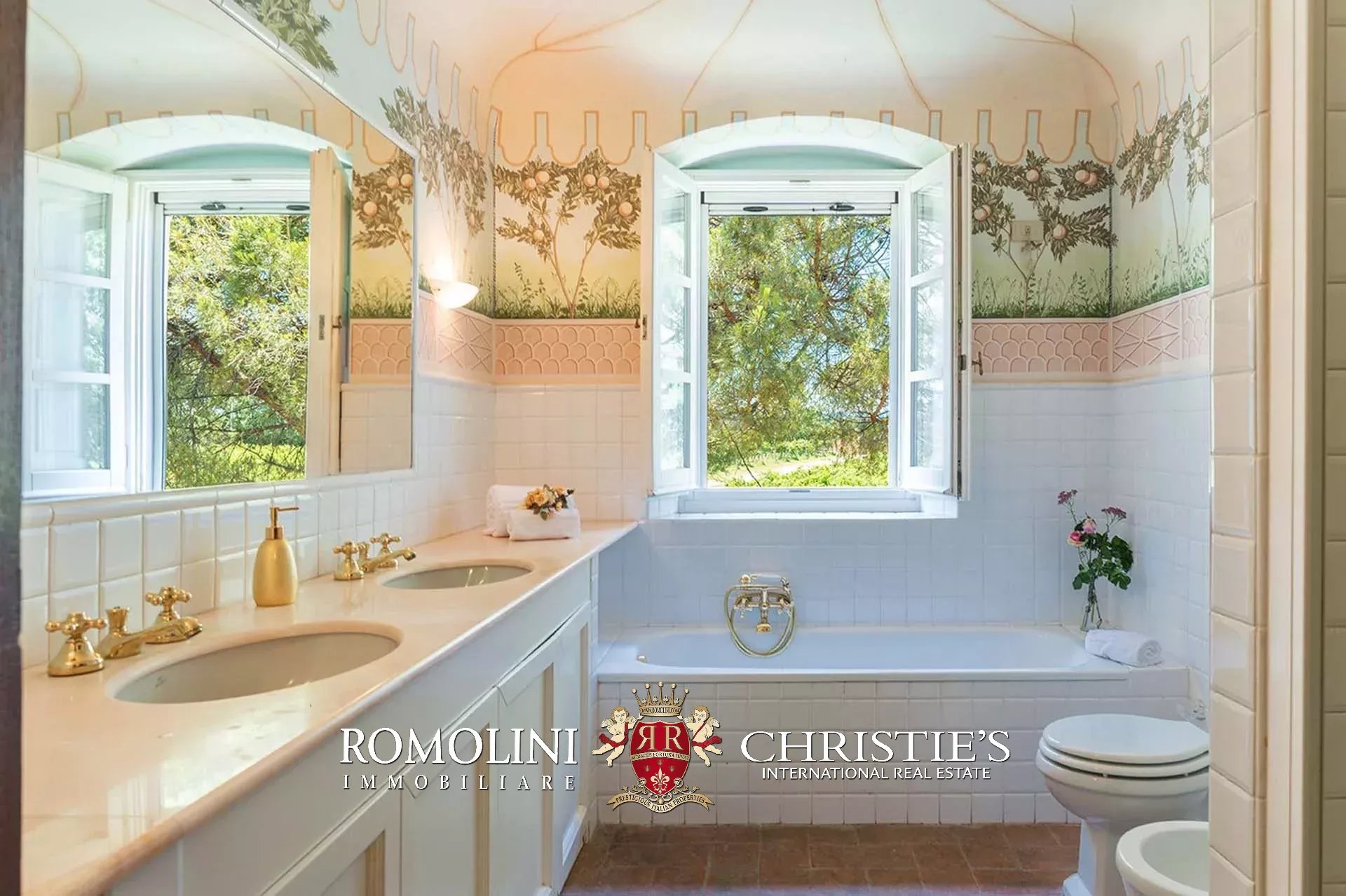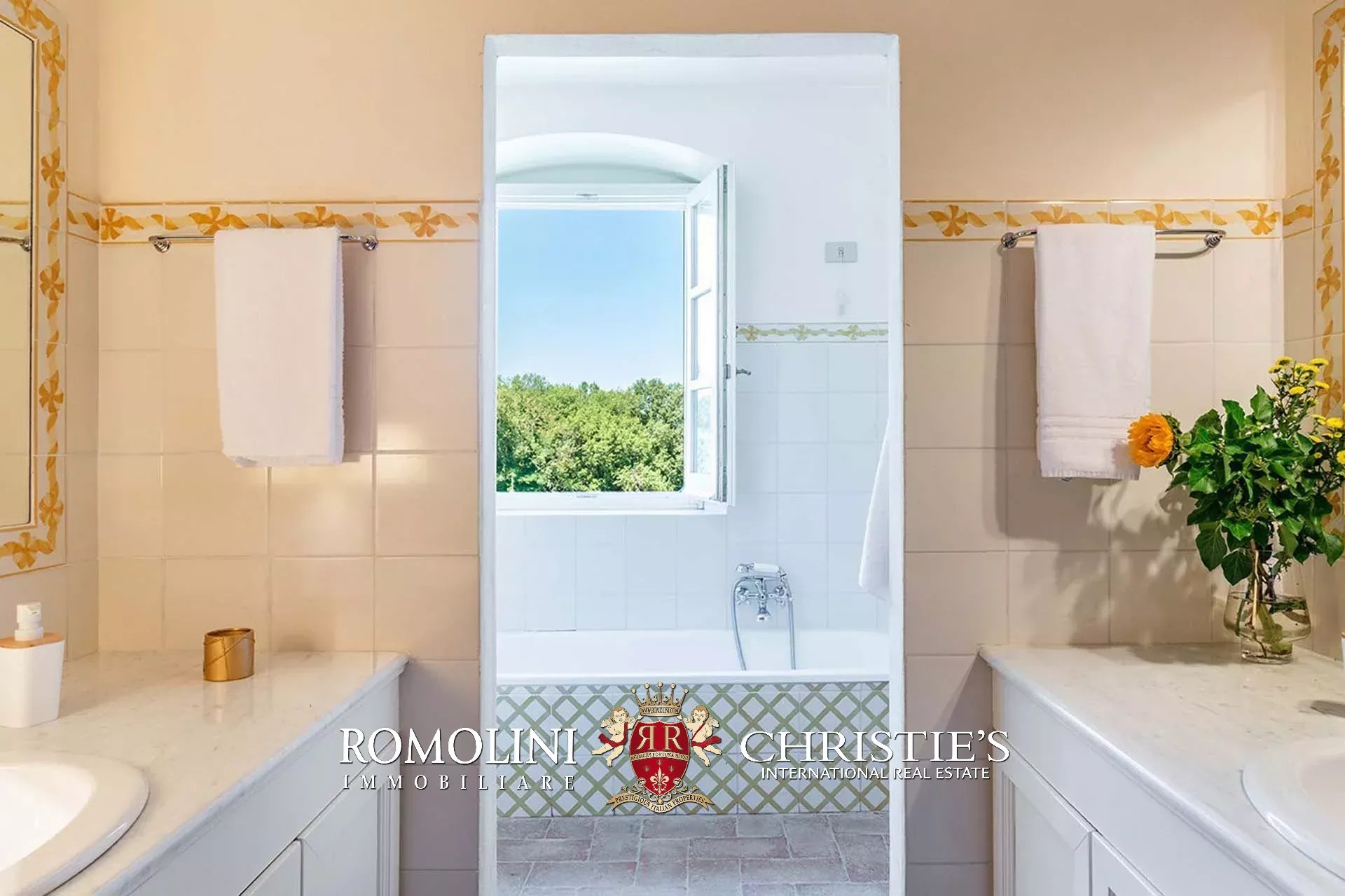 La villa (465 m², 6 camere e 6 bagni) è la classica dimora signorile di campagna, parzialmente intonacata e ancora dotata della caratteristica torretta in pietra all’angolo risalente al Duecento. Dal giardino si entra nel vano d’ingresso dell’edificio con la scala che porta ai piani superiori. Procedendo oltre si arriva alla grande zona giorno divisa in tre accoglienti ambienti. Dalla zona lettura una scala scende nella cantina interrata, collegata anche all’ingresso. Sempre dall’ingresso, sulla destra, si ha accesso alla cucina e subito oltre alla zona pranzo con grandi finestre sul giardino. All’angolo opposto del piano terra si trovano la lavanderia e un bagno di servizio.