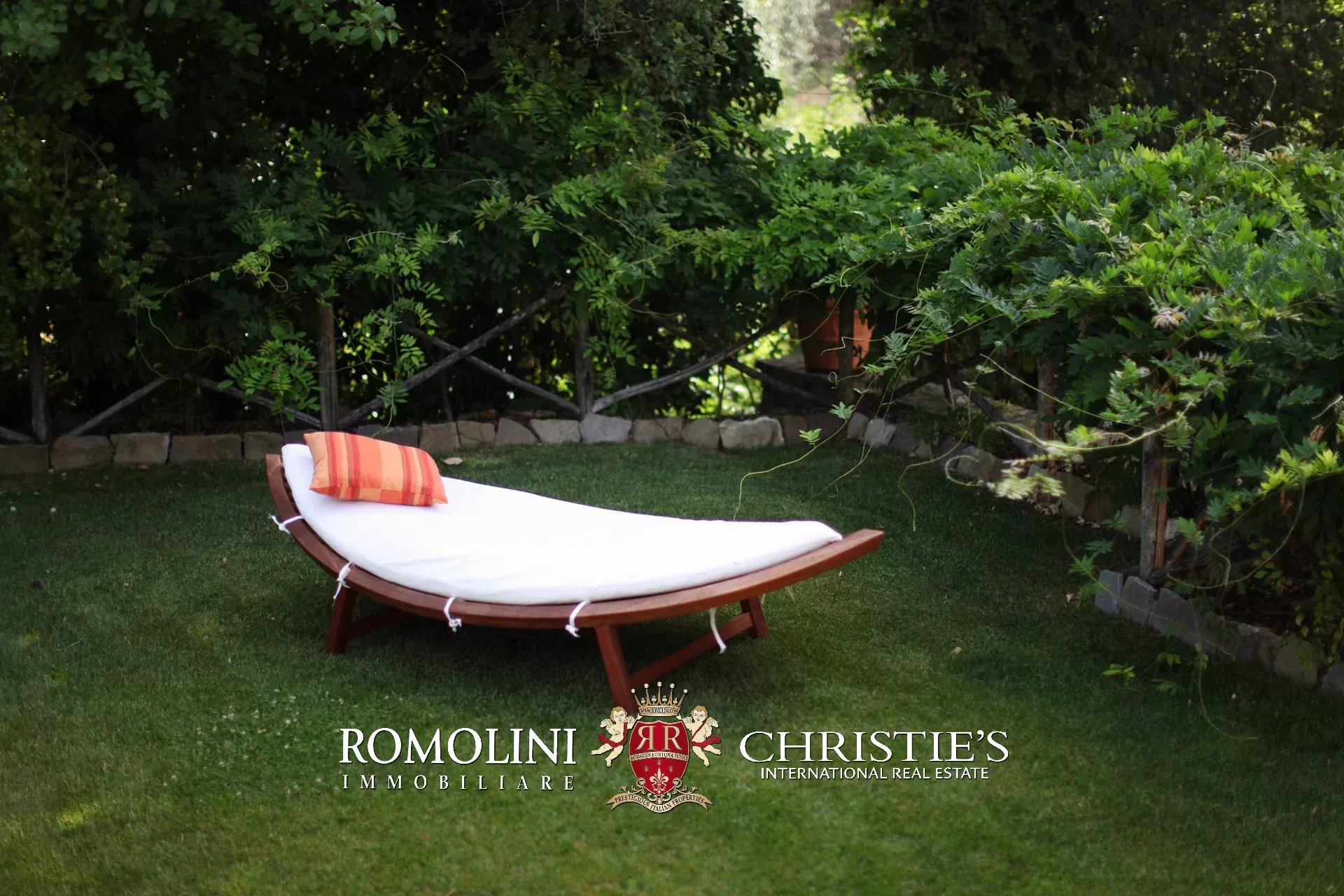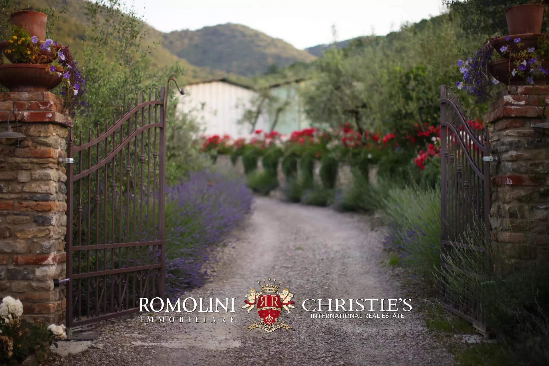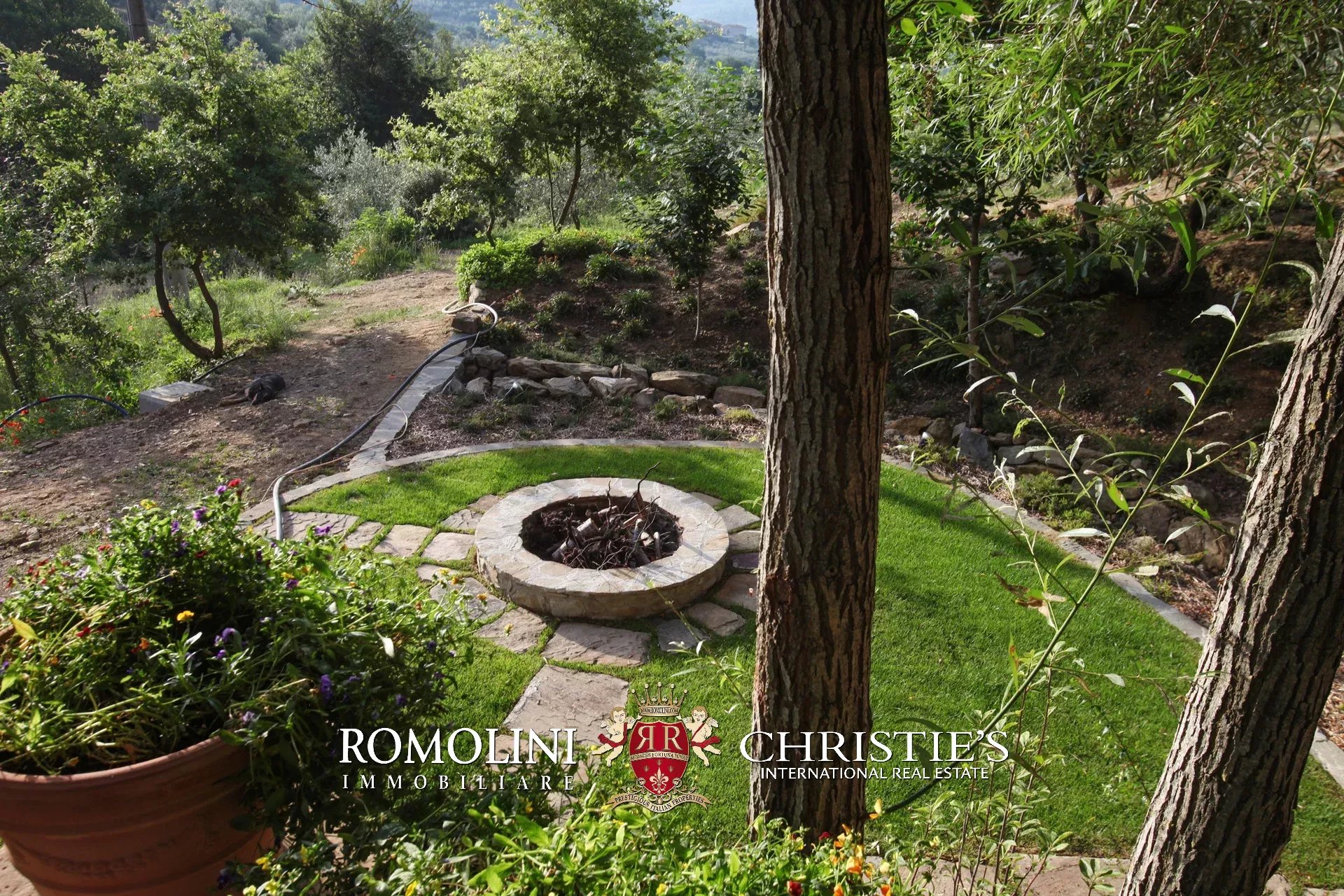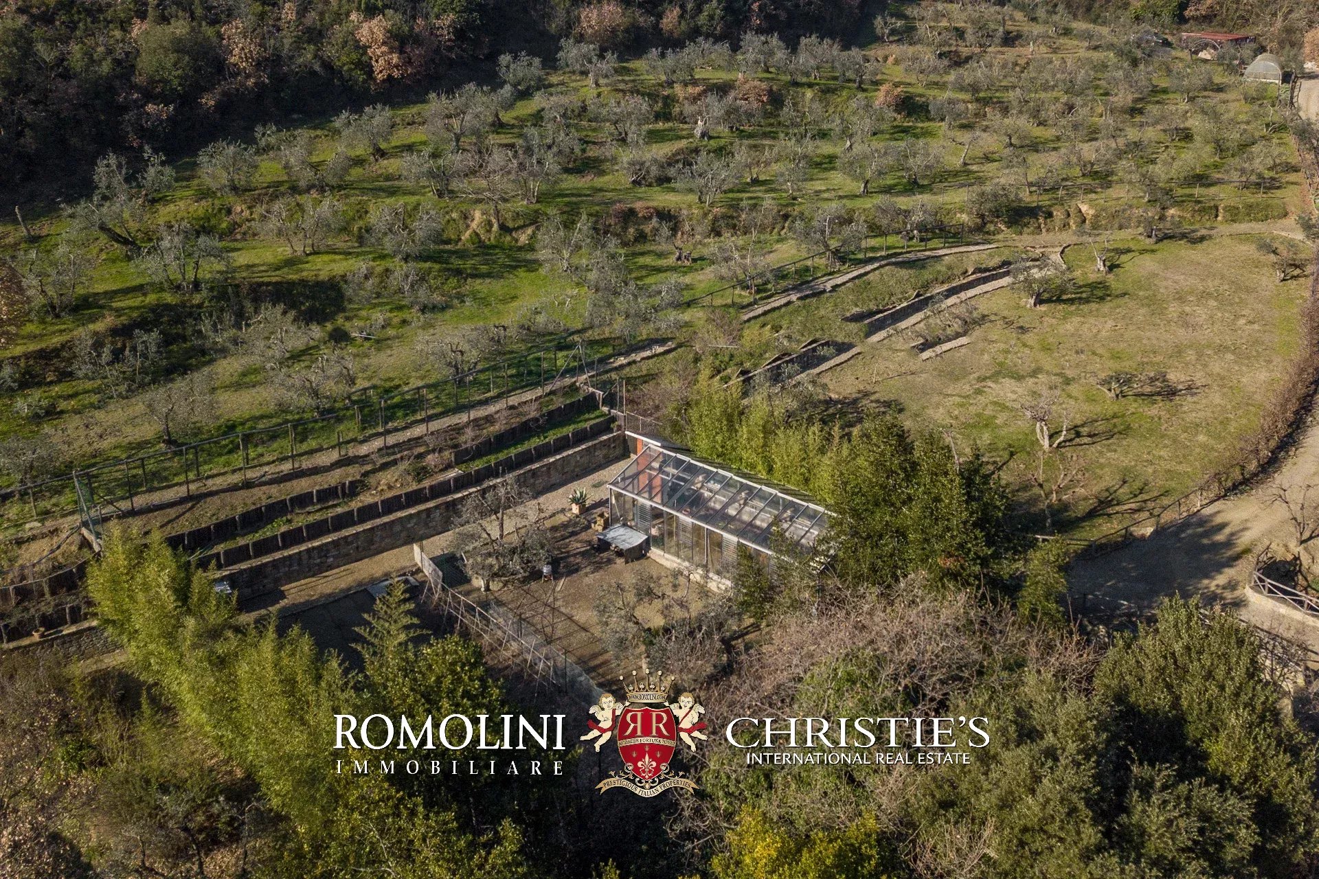 La proprietà copre circa 5,7 ettari di terreno, parzialmente coperti da un curatissimo giardino fiorito tutto attorno agli edifici (3.800 mq). La restante superficie è destinata a oliveto (3,6 ha che includono anche alcuni filari di vite) e bosco misto (1,7 ha). Molto suggestivo è il ruscello che attraversa la proprietà creando cascatelle e piccoli laghetti.