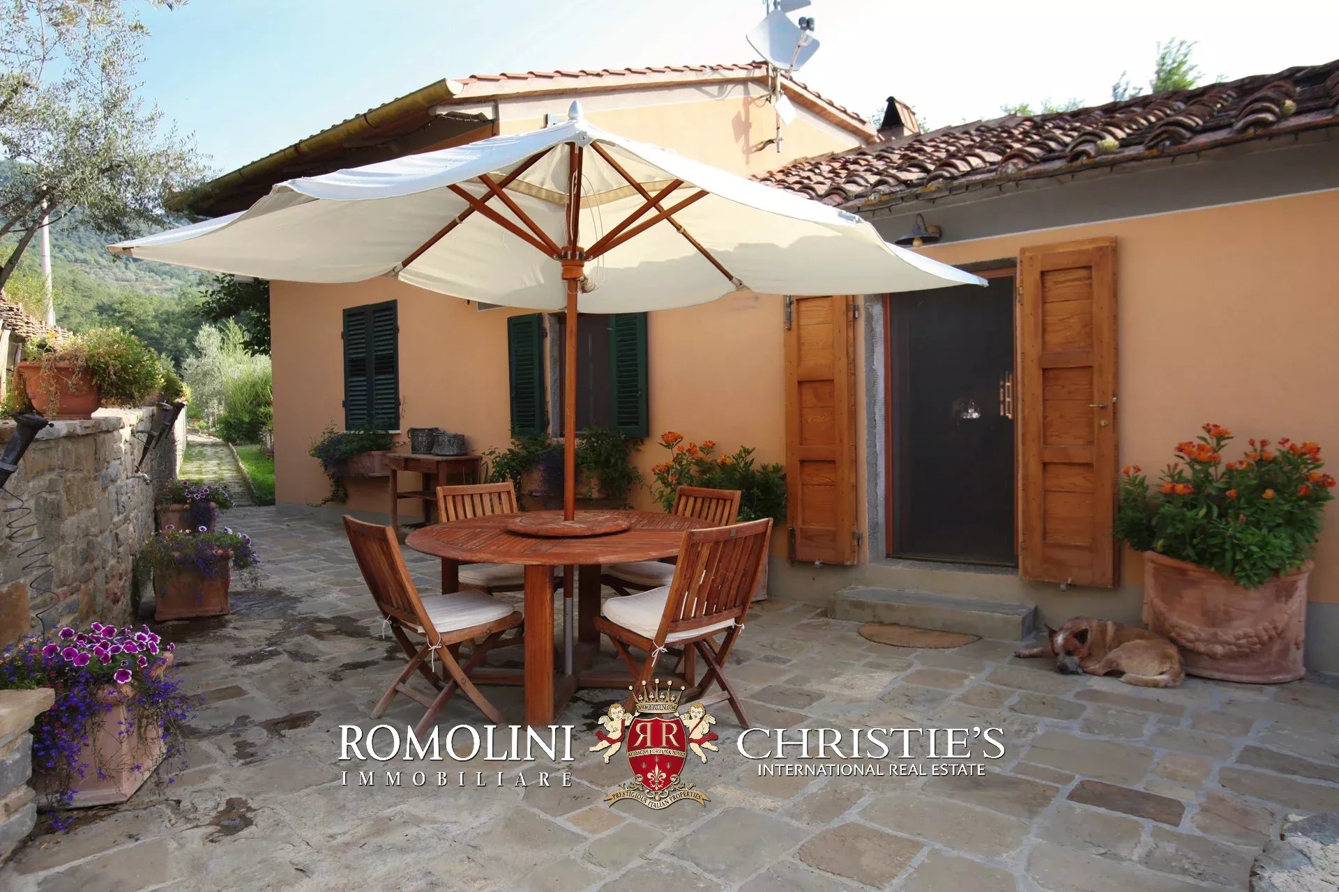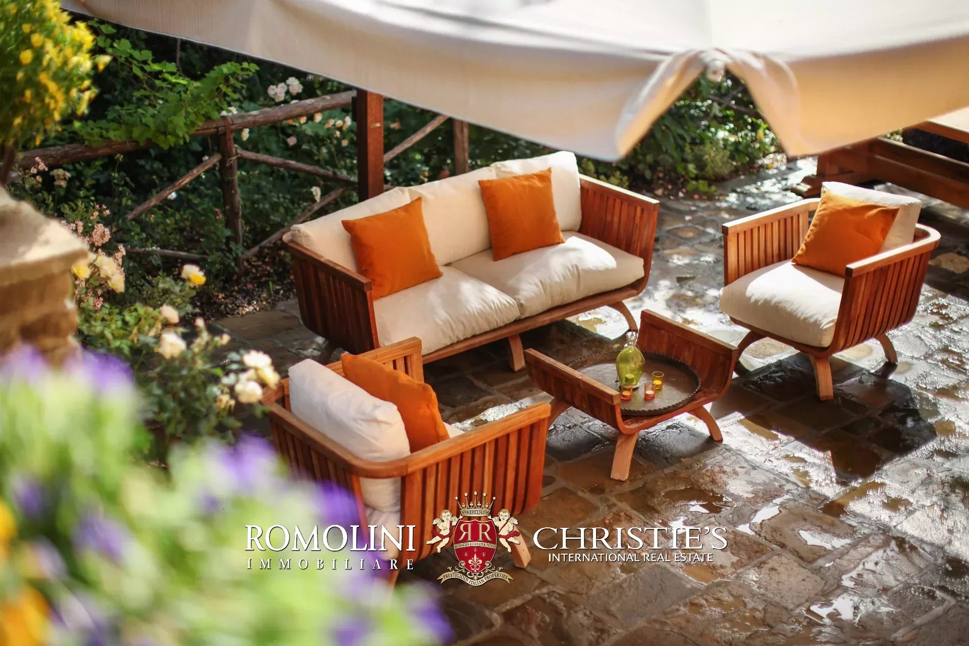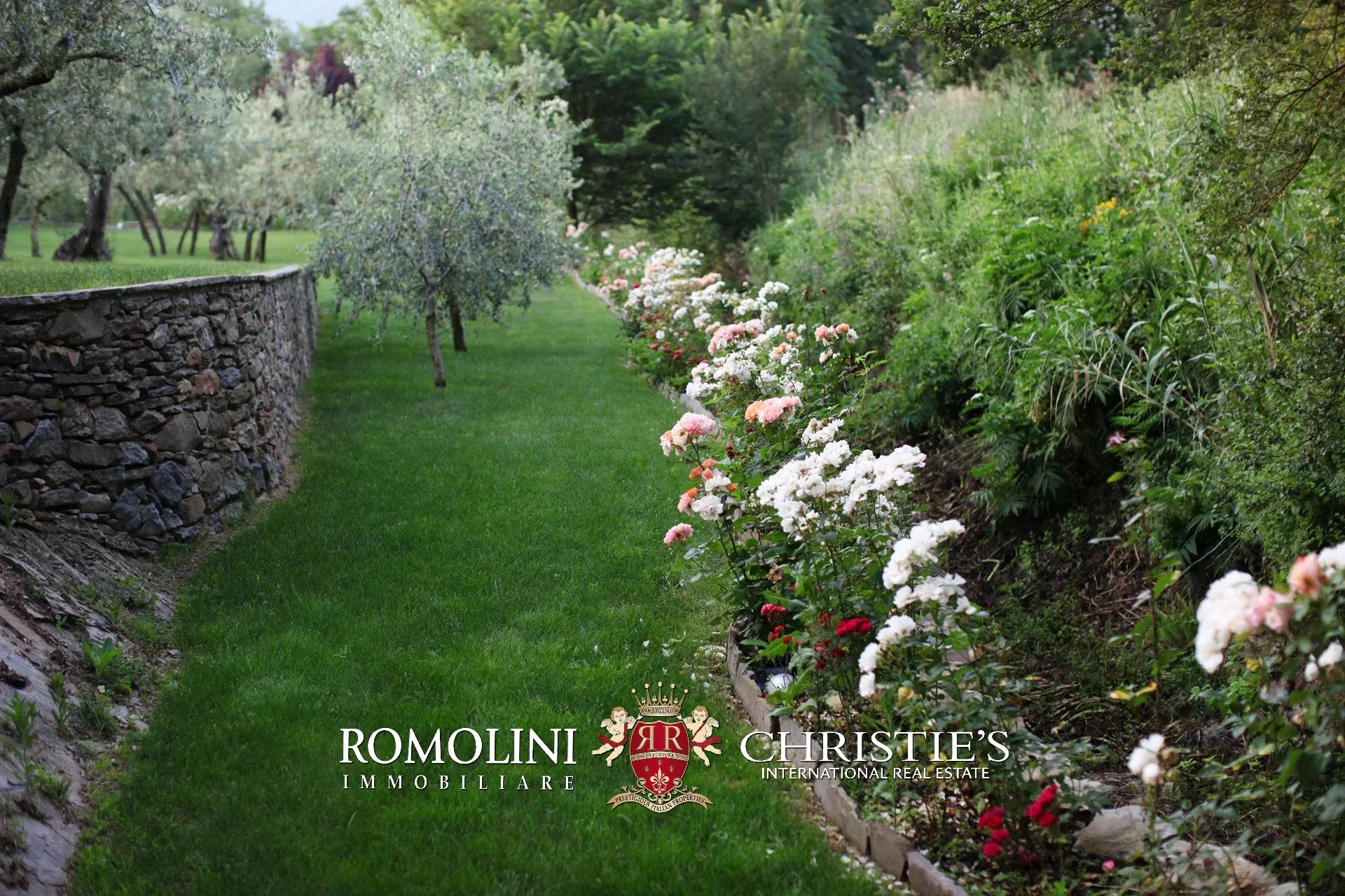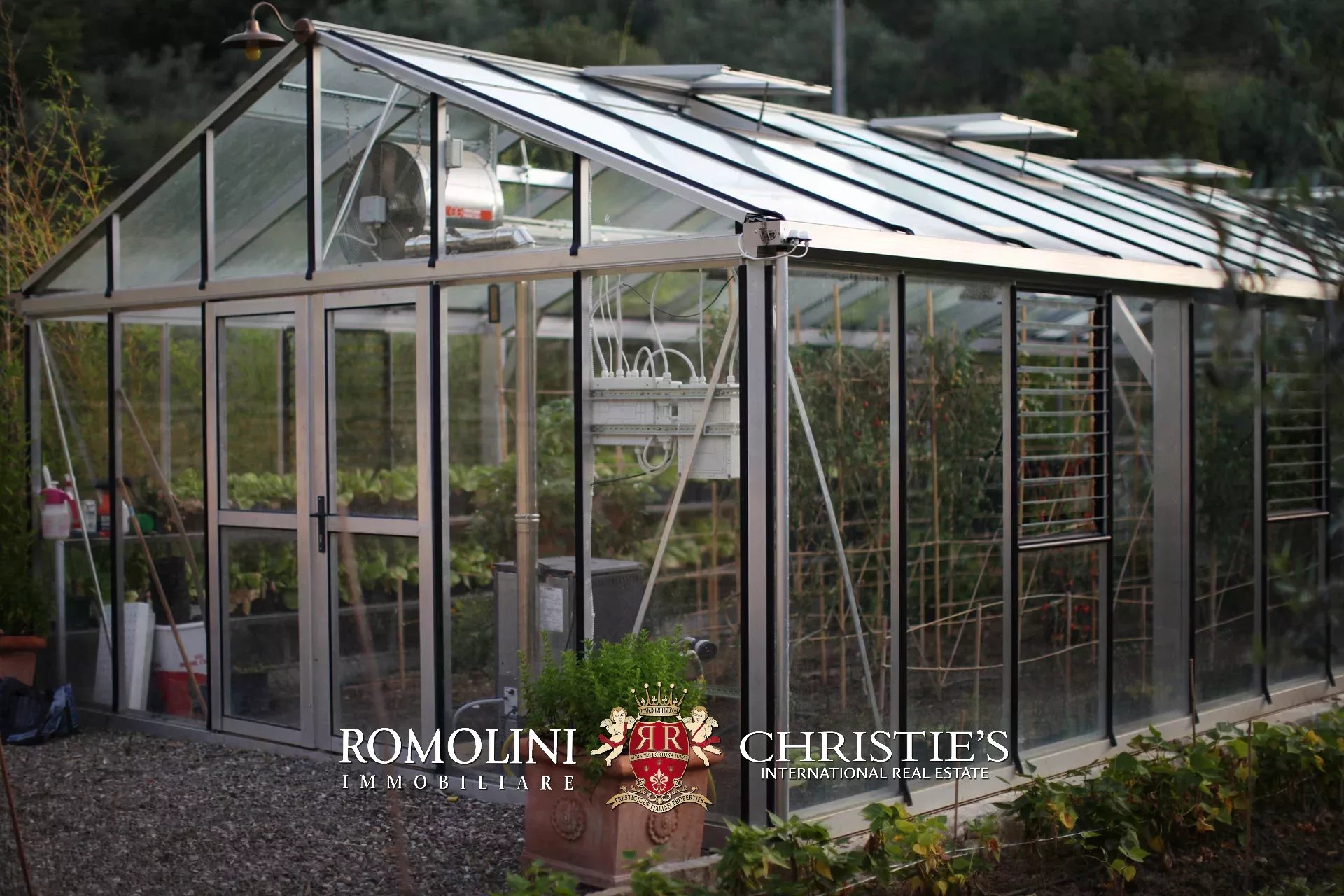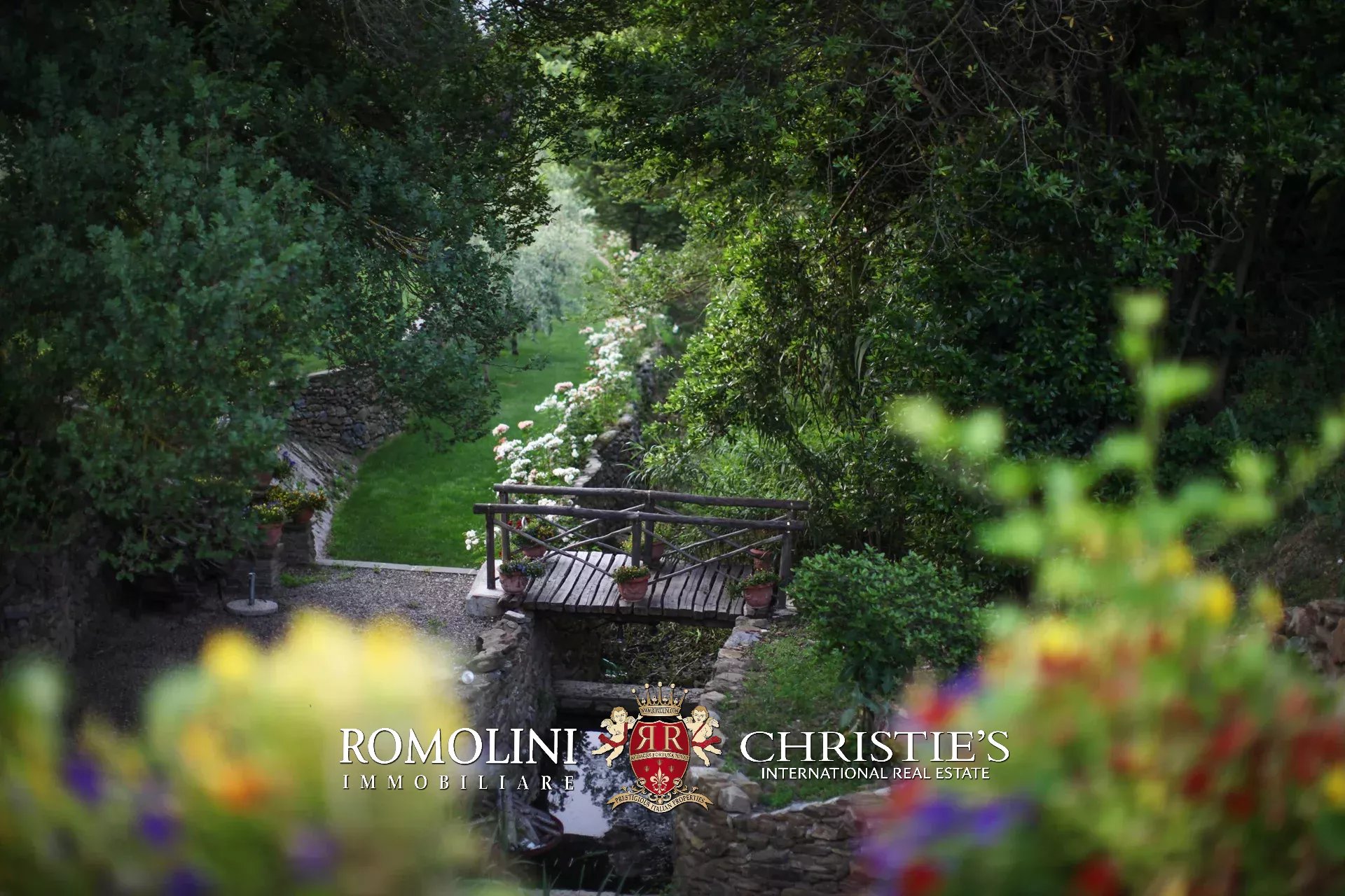 La proprietà copre circa 5,7 ettari di terreno, parzialmente coperti da un curatissimo giardino fiorito tutto attorno agli edifici (3.800 mq). La restante superficie è destinata a oliveto (3,6 ha che includono anche alcuni filari di vite) e bosco misto (1,7 ha). Molto suggestivo è il ruscello che attraversa la proprietà creando cascatelle e piccoli laghetti.