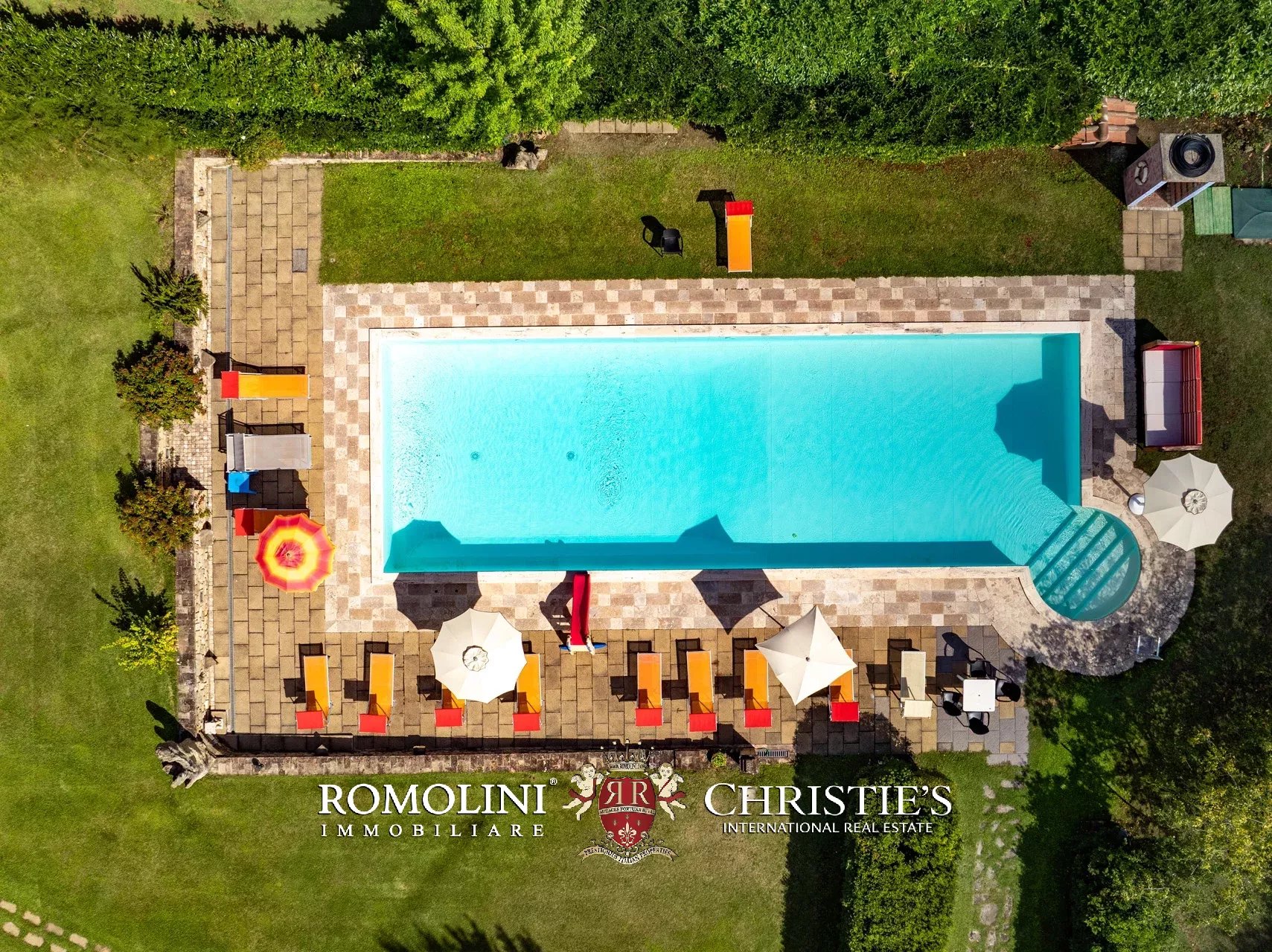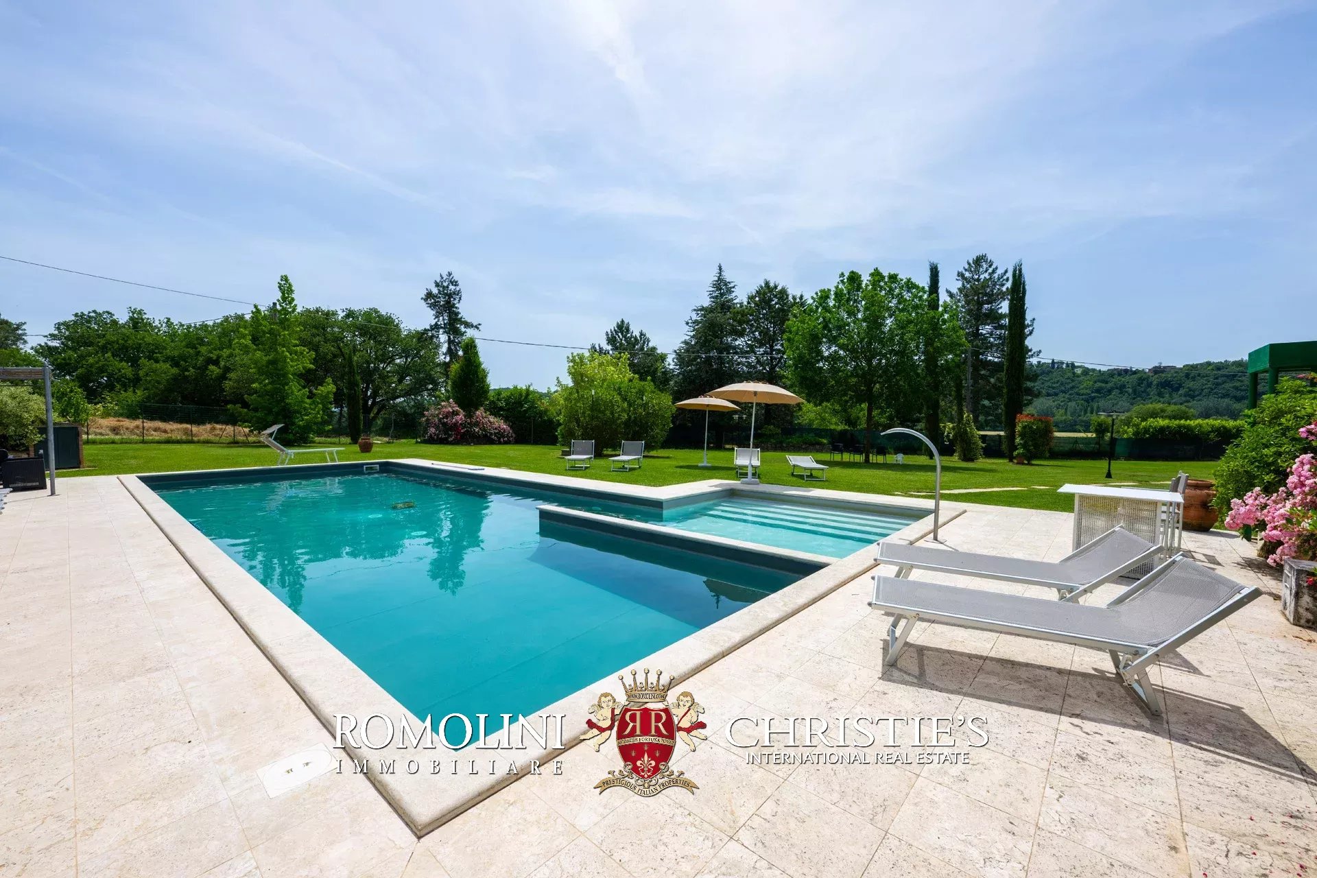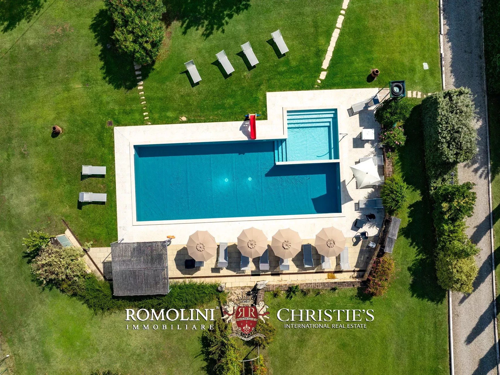 Le ville sono immerse in un lussureggiante parco alberato di 10.000 m², interamente recintato e ben curato. Ogni villa può contare su una piscina privata esclusiva (rispettivamente 18 × 6 m con scala romana e 16 × 6 m con angolo per bambini e idromassaggio), posta a pochi passi dall’edificio e circondata da un solarium in pietra e divise tra loro da una siepe che assicura privacy a ogni vasca in caso si ospitino due diversi gruppi di ospiti.