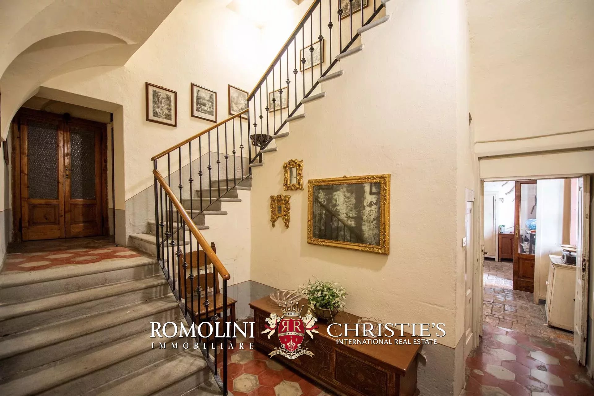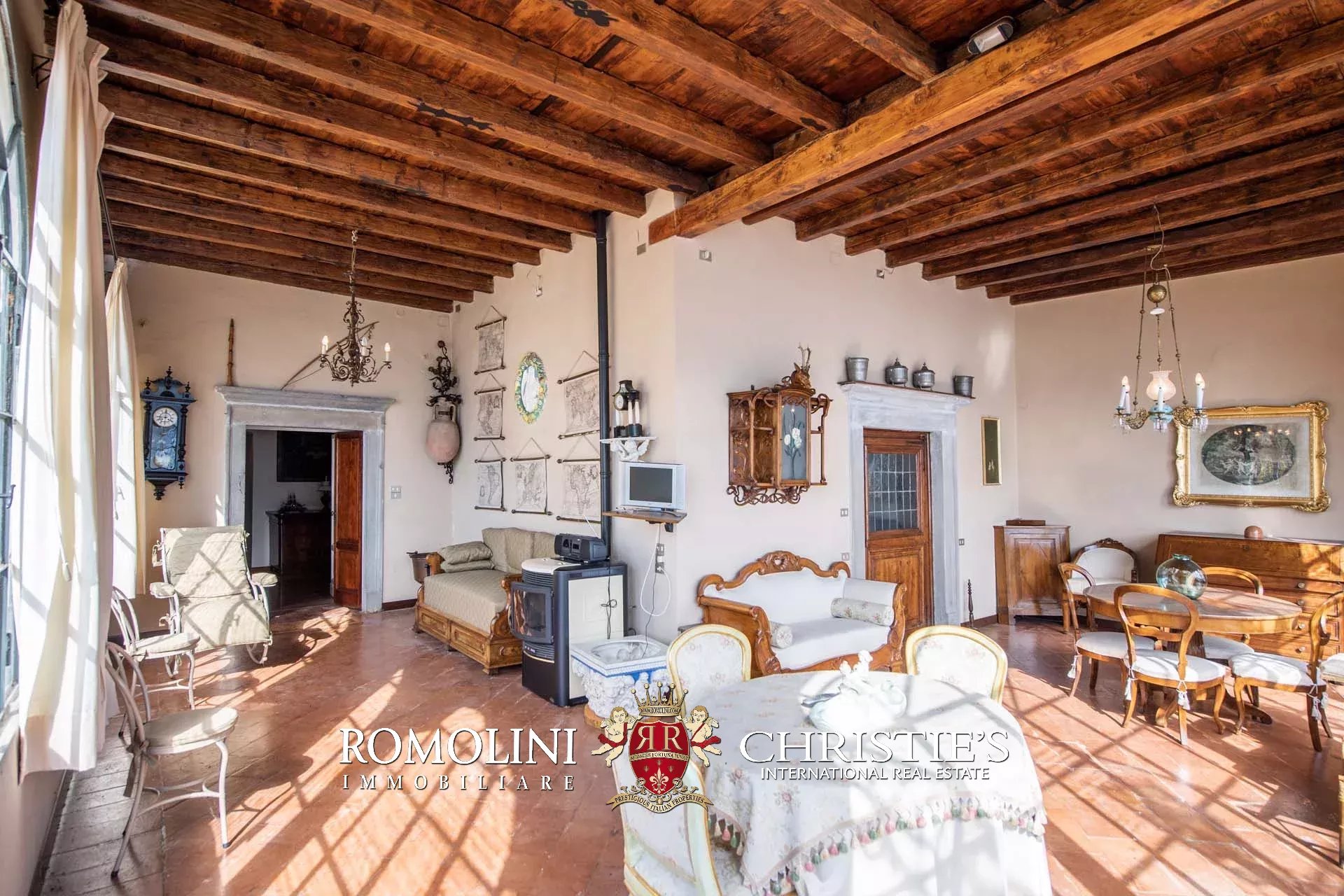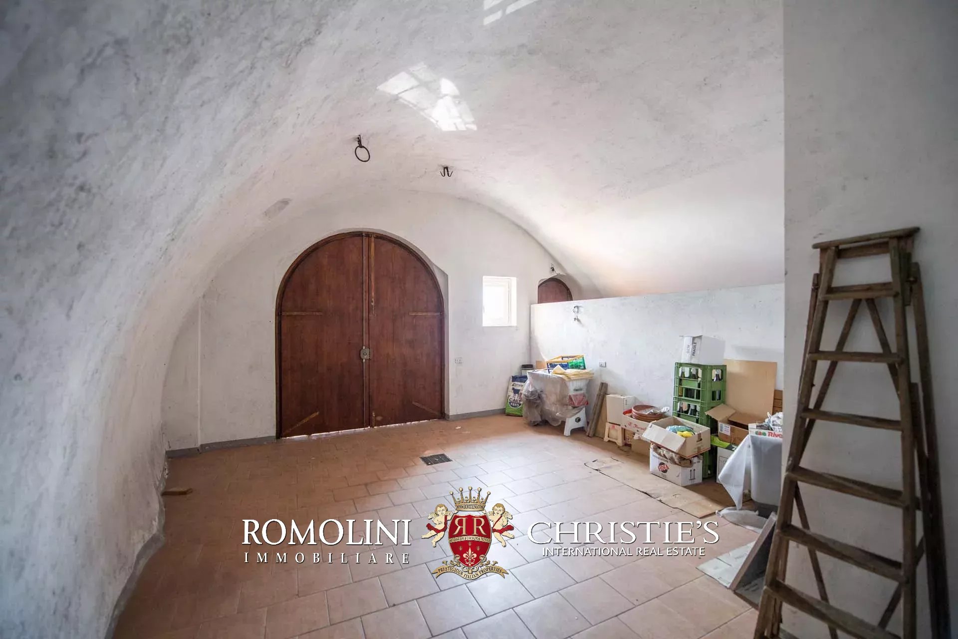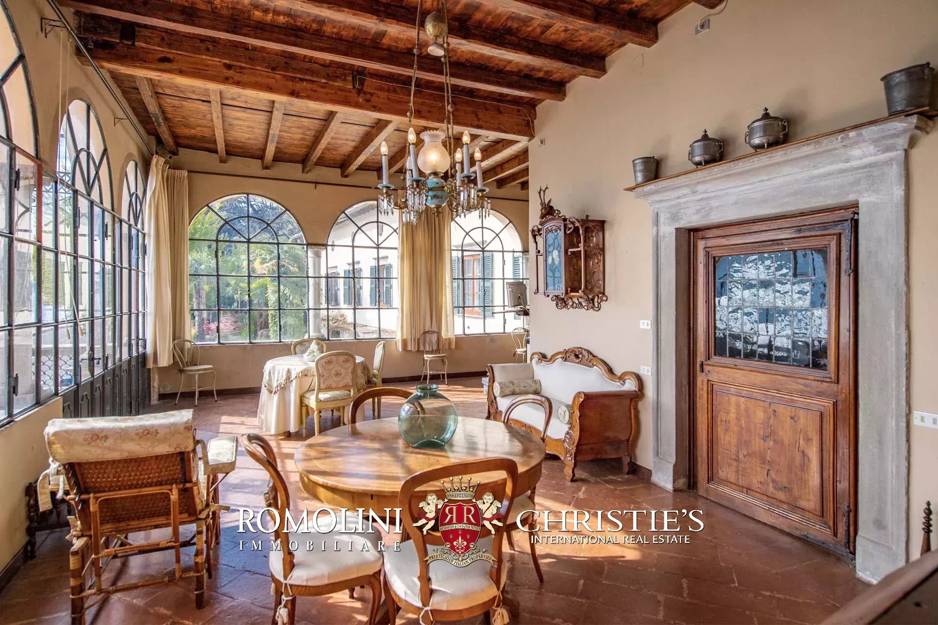 Al piano terra (soffitti con altezza variabile tra 2,8 e 3,6 m) si trovano tre ampie sale di rappresentanza con una splendida veranda esterna, una cucina con dispensa e un bagno. Altri locali accessori, sempre al piano terra ma con accesso indipendente, includono varie cantine e magazzini.