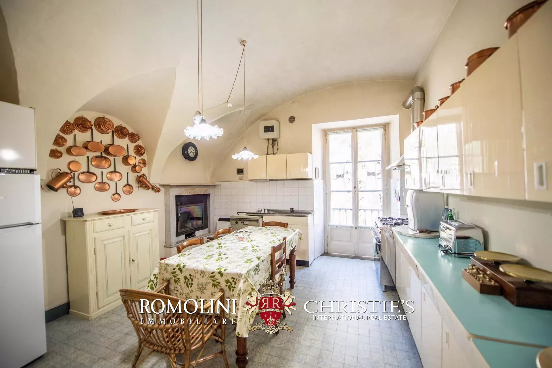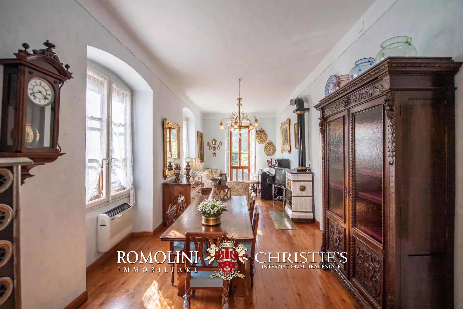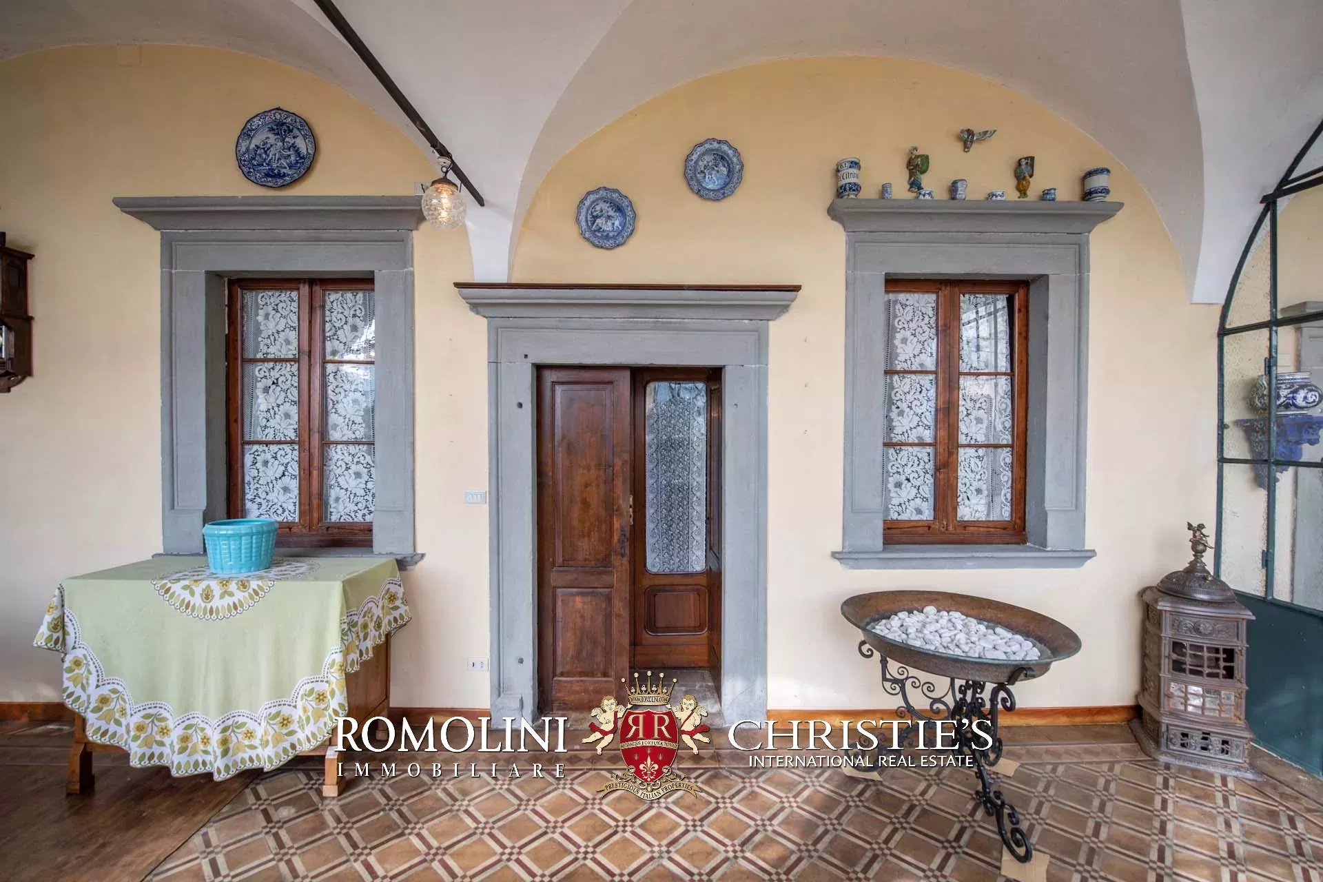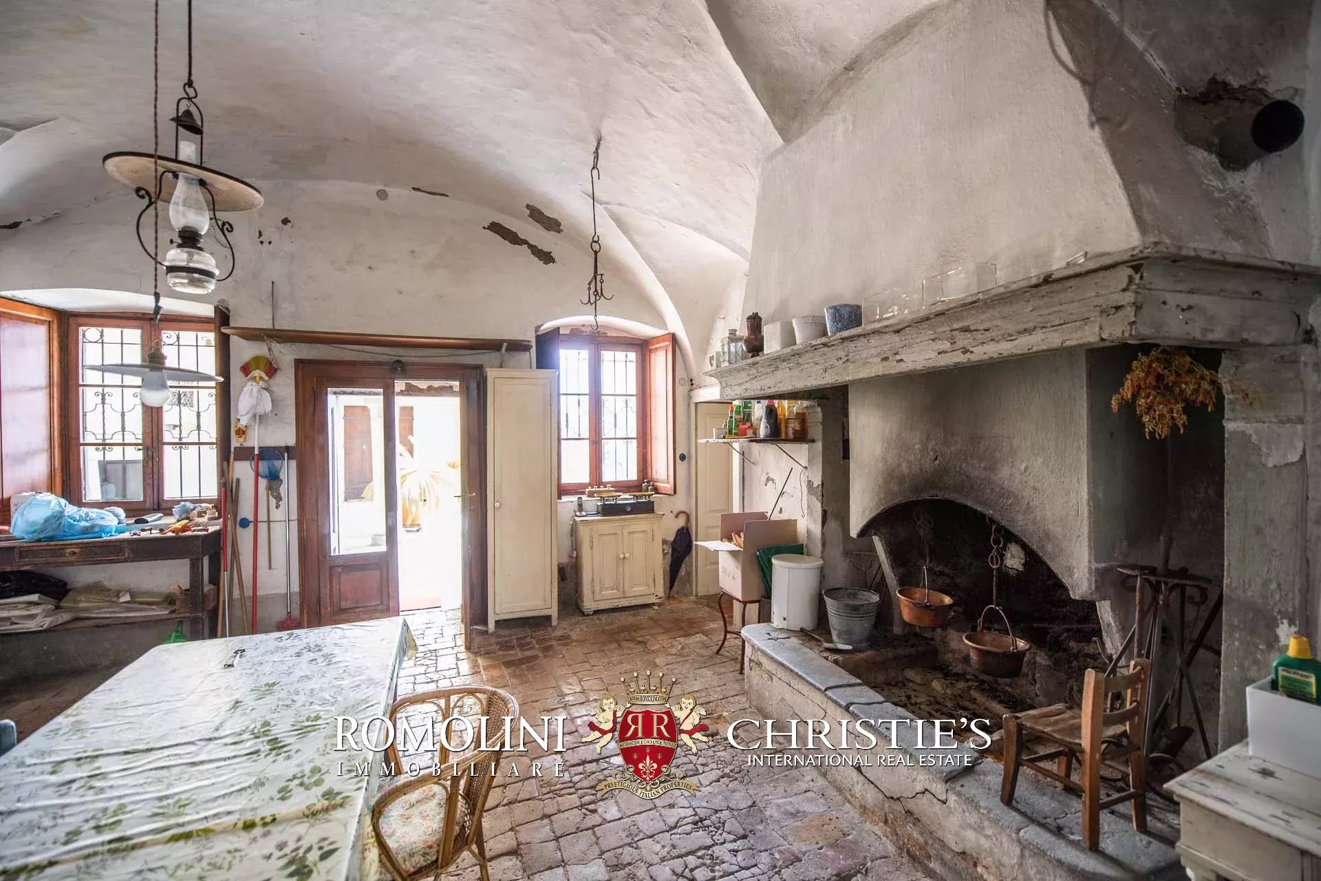 Al piano terra (soffitti con altezza variabile tra 2,8 e 3,6 m) si trovano tre ampie sale di rappresentanza con una splendida veranda esterna, una cucina con dispensa e un bagno. Altri locali accessori, sempre al piano terra ma con accesso indipendente, includono varie cantine e magazzini.