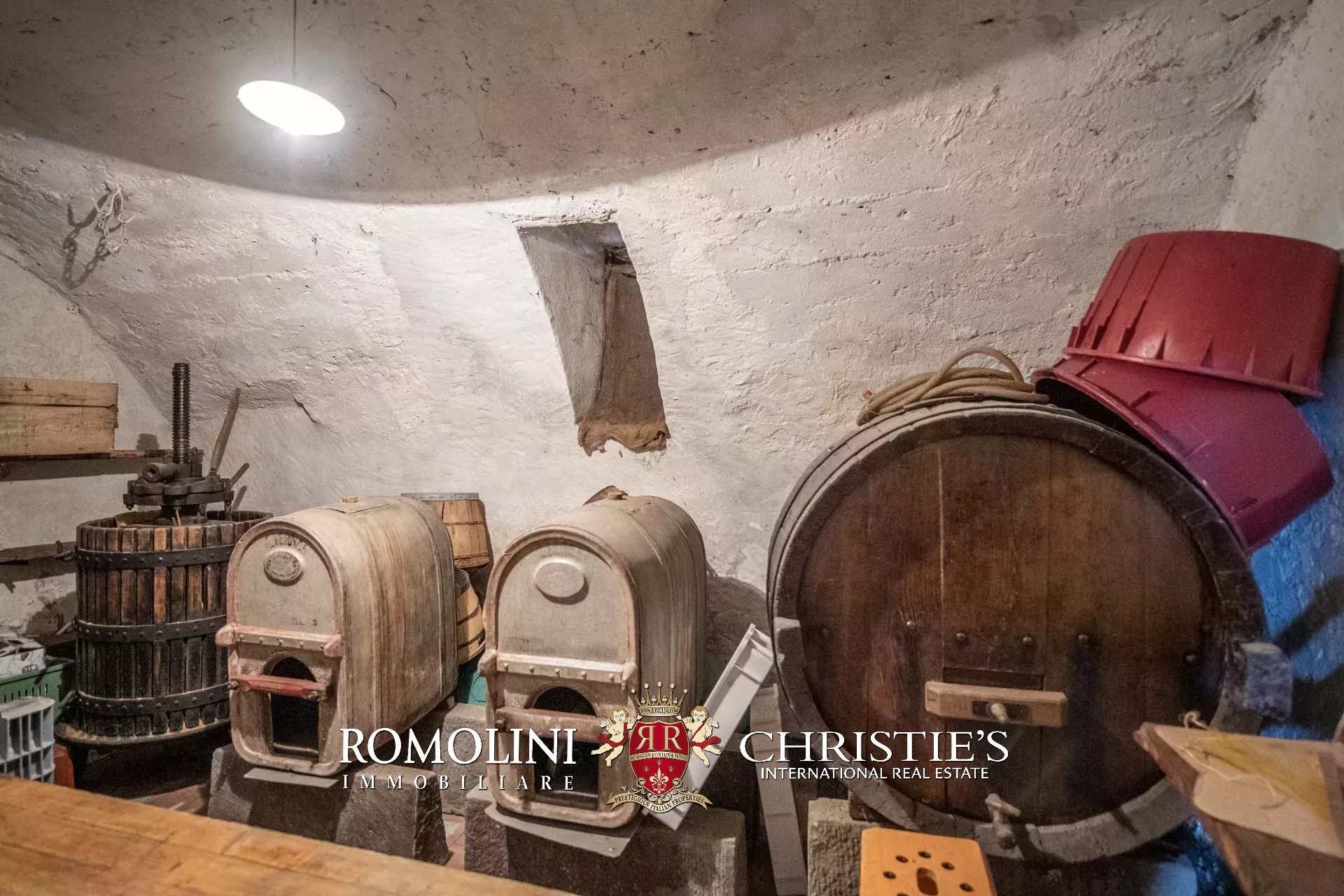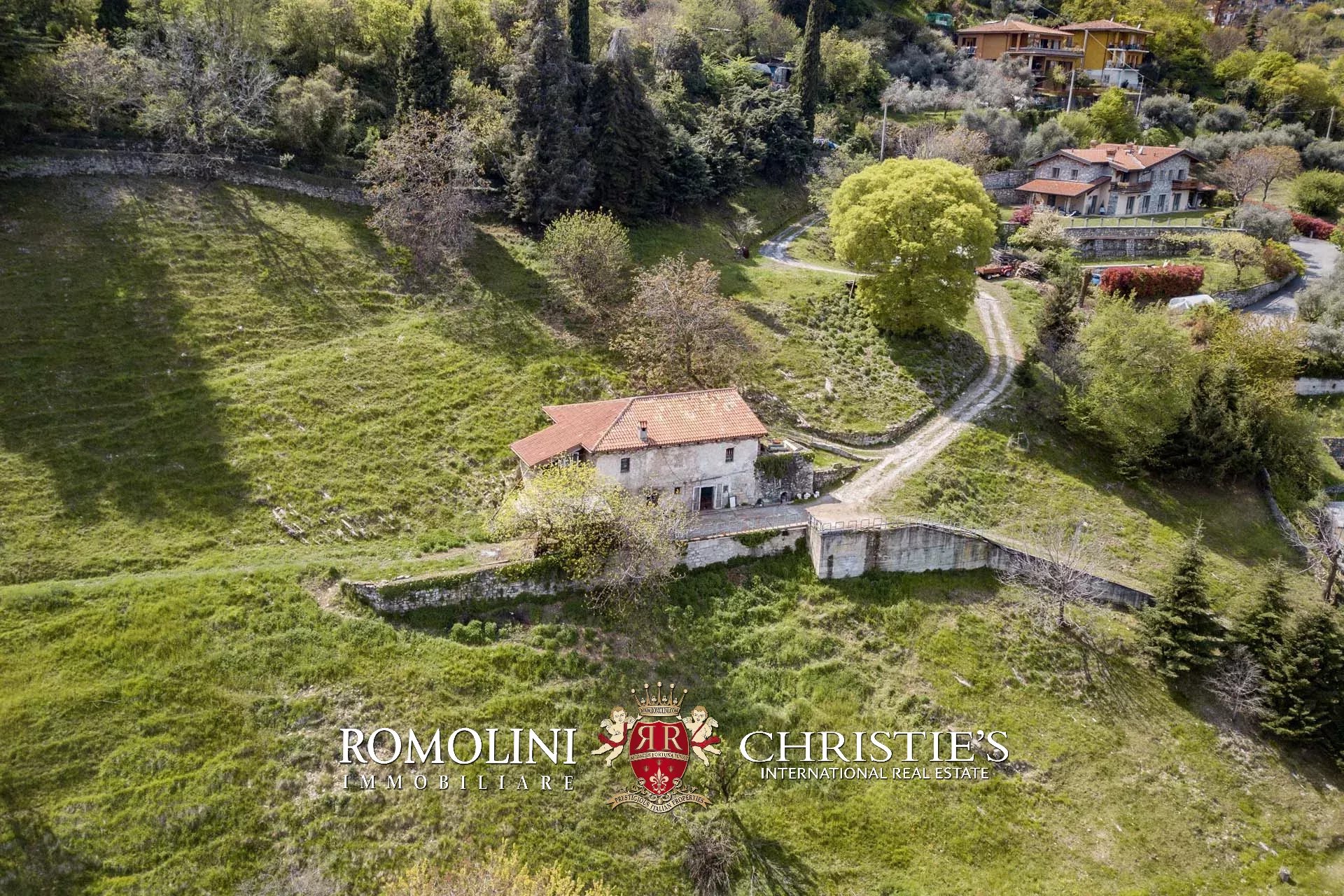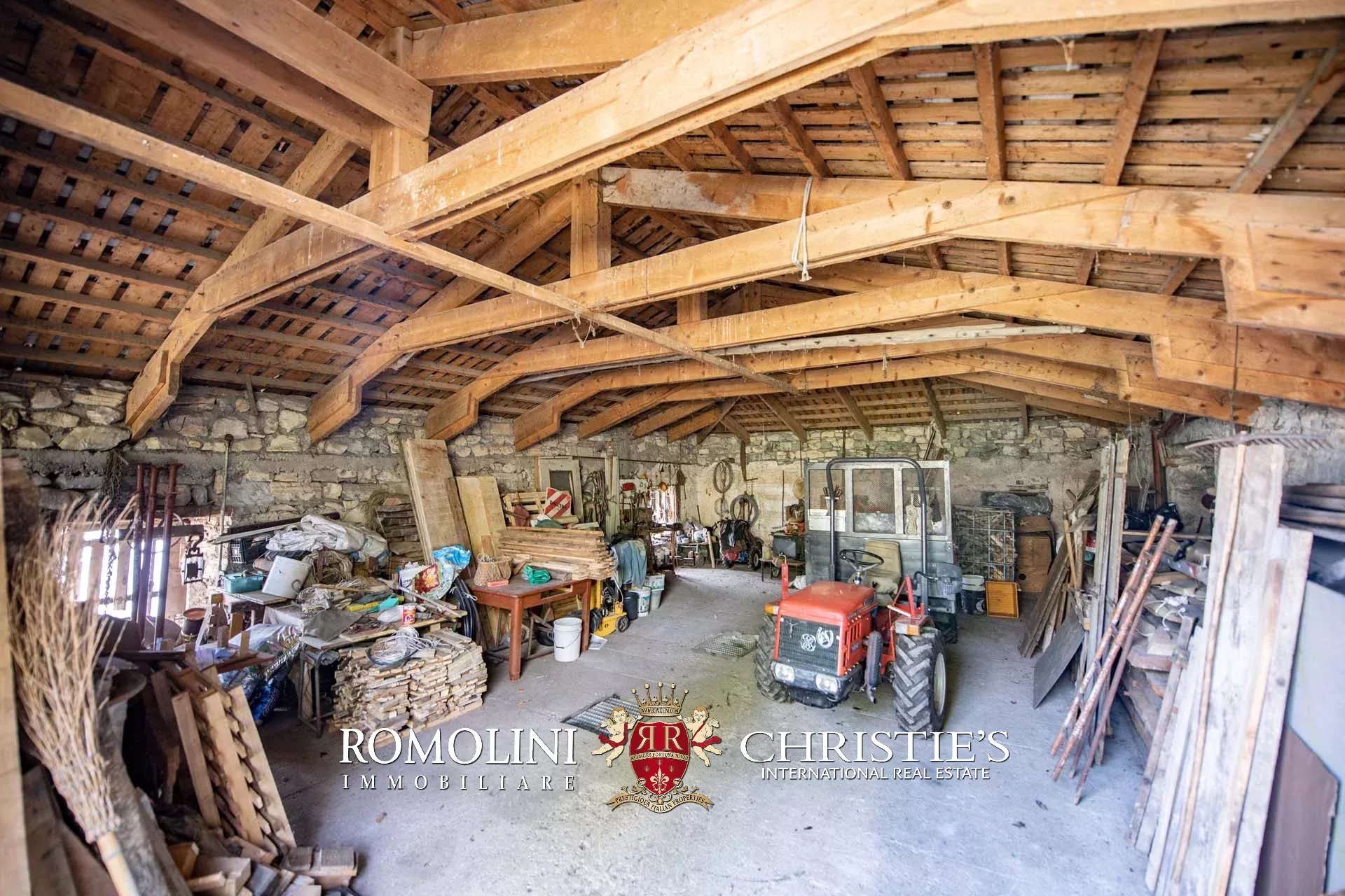 Sul retro, ai confini del giardino, si trova poi una cascina (135 m²) su due piani. L’edificio, realizzato in pietra con tetto in legno e coppi originali, è attualmente usato come magazzino e deposito per gli attrezzi e può essere raggiunto tramite una stretta strada sterrata percorribile anche con piccoli mezzi. L’edificio è in discrete condizioni e trarrebbe giovamento da alcuni interventi di consolidamento e ristrutturazione. Subito sotto la cascina si trova anche una vecchia vasca di accumulo per l’acqua, alimentata dalla sorgente naturale della proprietà.