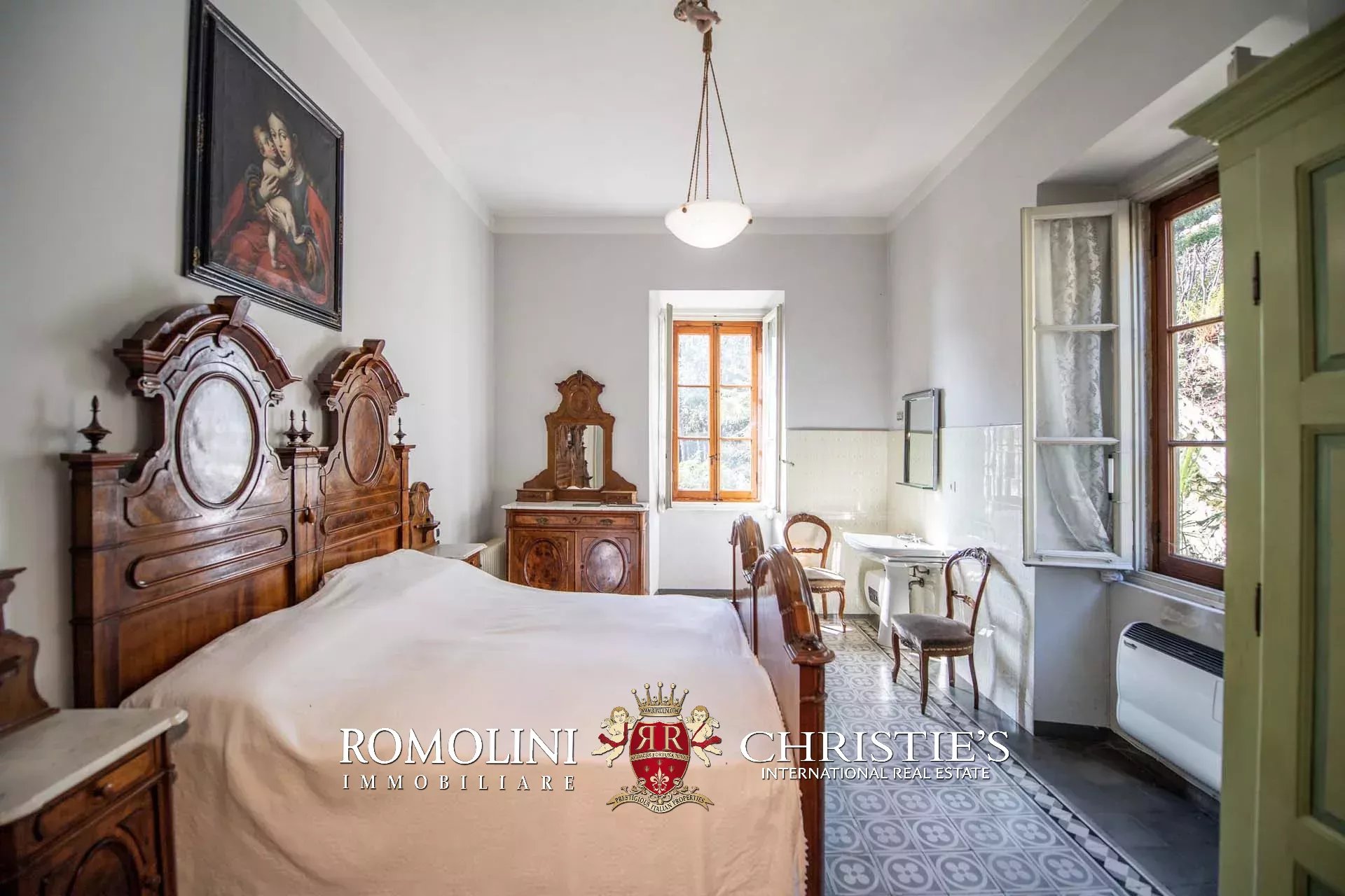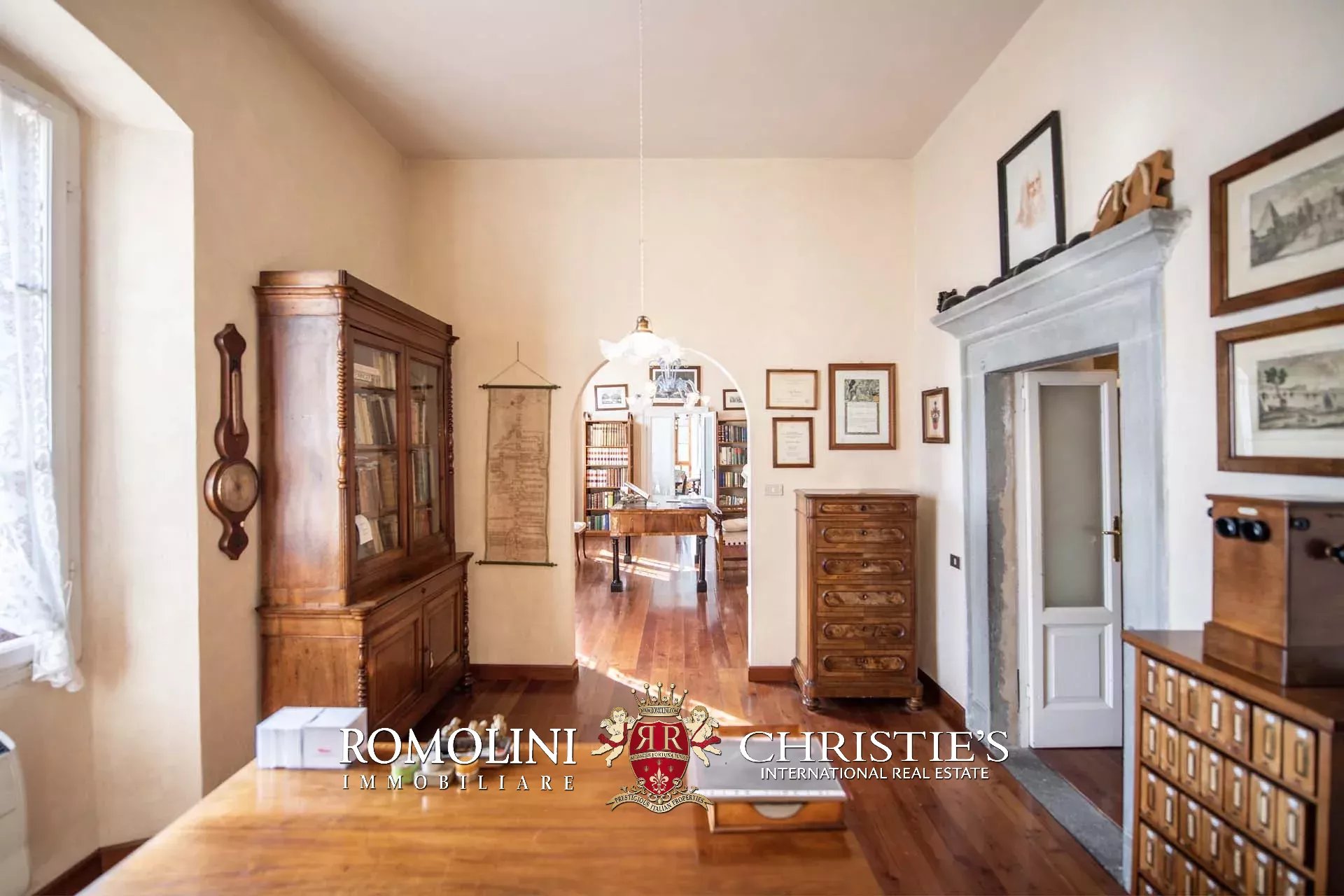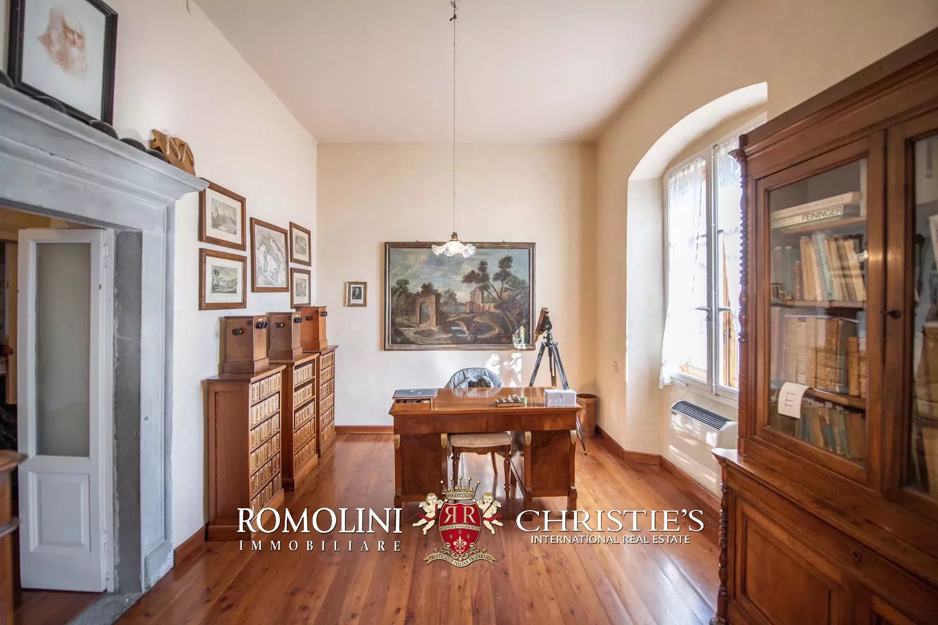 Salendo al piano primo (soffitti con altezza variabile tra 2,7 e 3,6 m) tramite una magnifica scala in pietra locale troviamo un soggiorno, due studi, una libreria con sala lettura, cinque camere, due bagni e una splendida veranda con terrazza affacciata sul lago da un lato e sul giardino dall’altro.