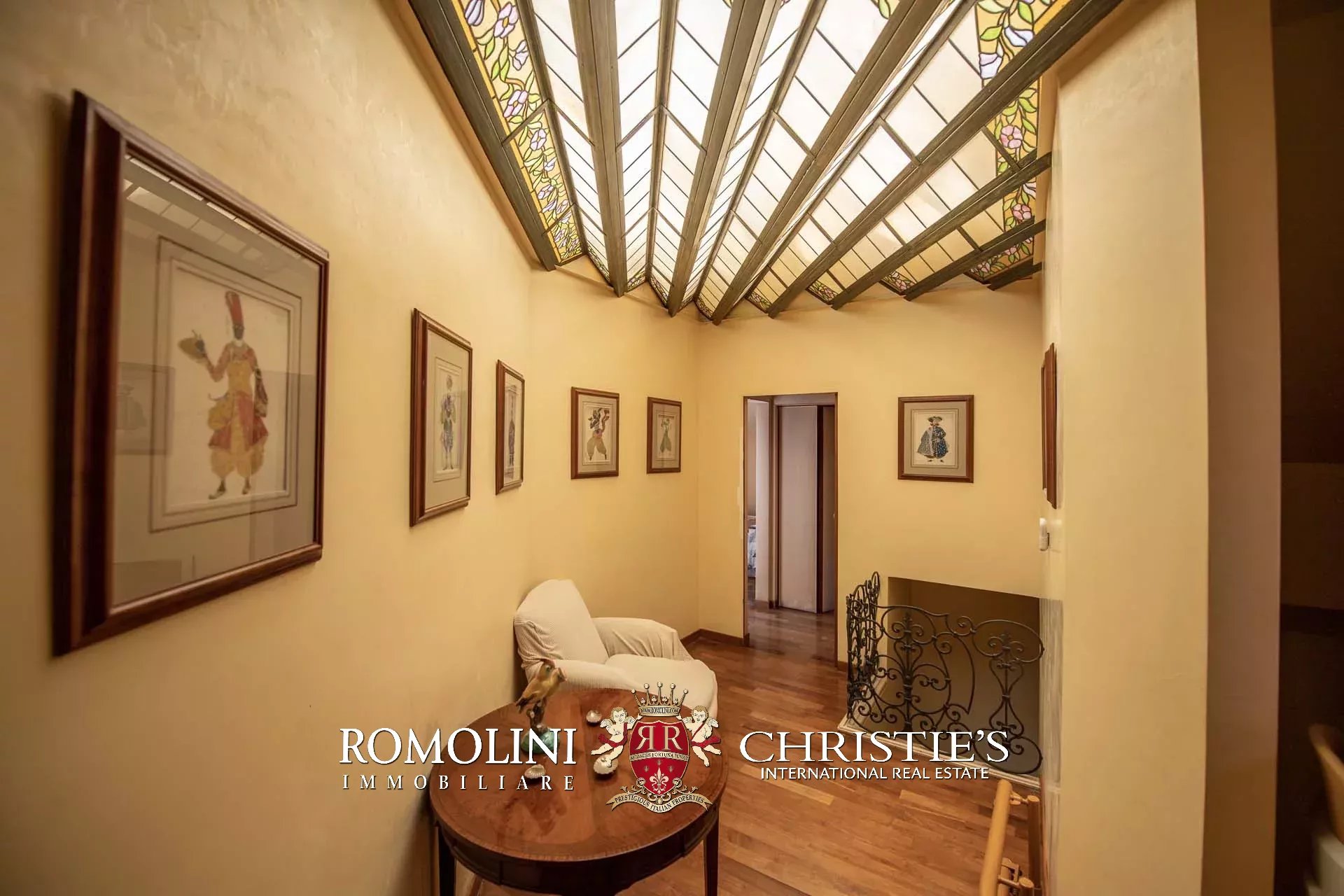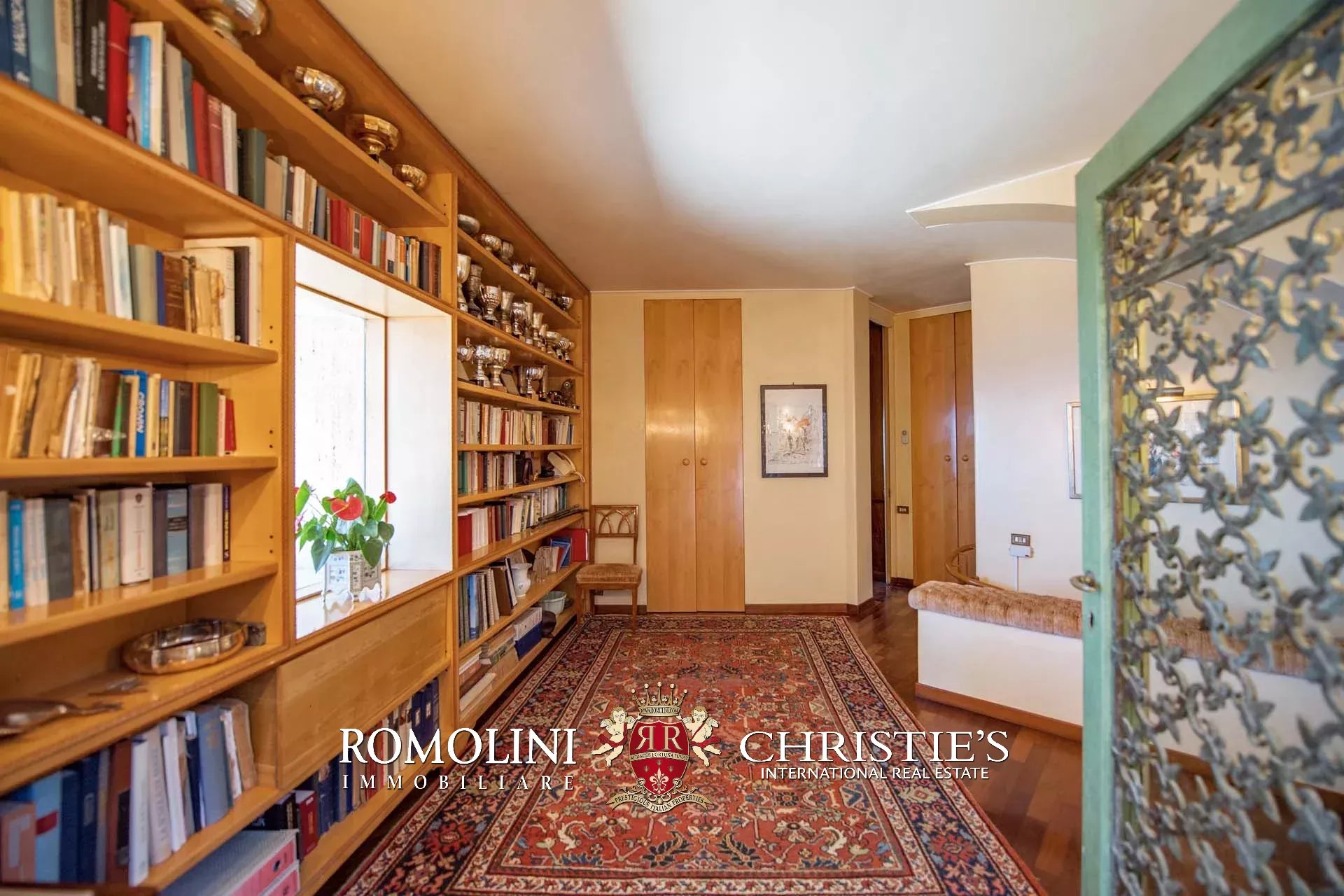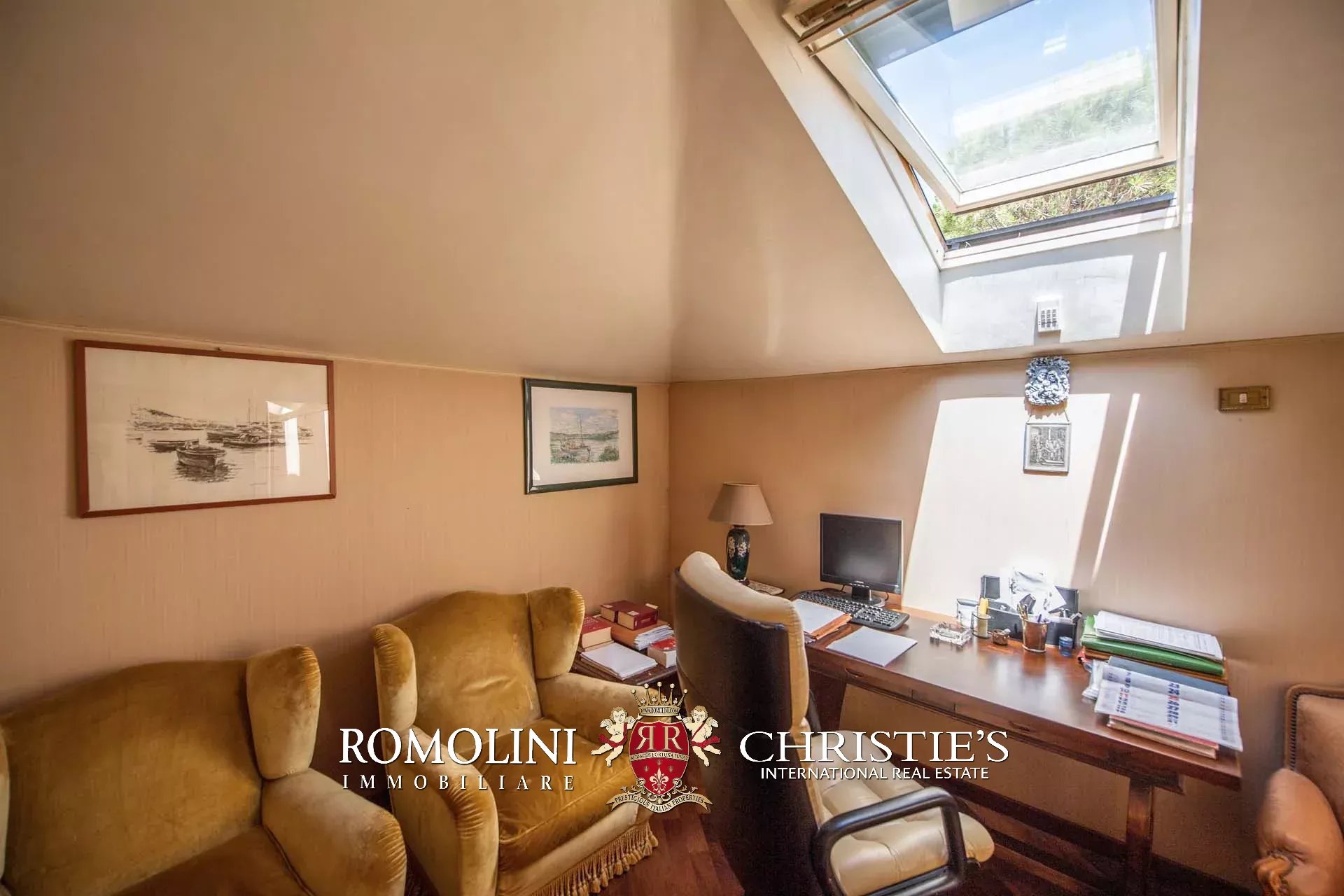 All’uscita della sala poliuso si trova anche la scala che porta al piano terra vero e proprio della villa, dove si trova il secondo ingresso che si apre sul giardino della villa. Da questa stanza, dotata di guardaroba, si passa poi in un ampio studio con camino e vetrata sul mare. Accanto allo studio si trova un locale lavanderia/stireria, mentre proseguendo per il corridoio si arriva infine alla prima camera con bagno privato. Le stanze sono tutte illuminate da grandi finestre che danno sul mare da un lato e sul giardino dall’altro.