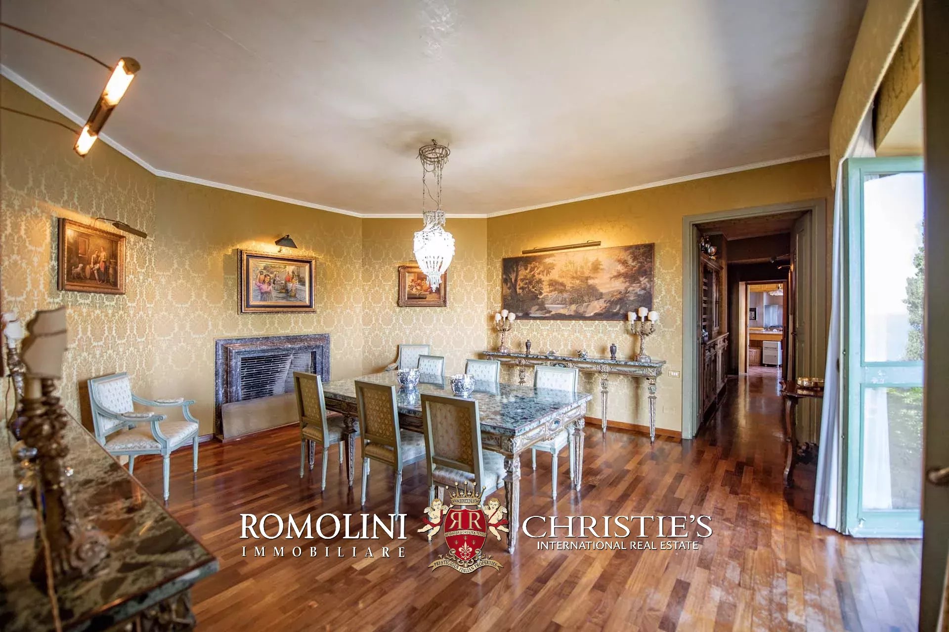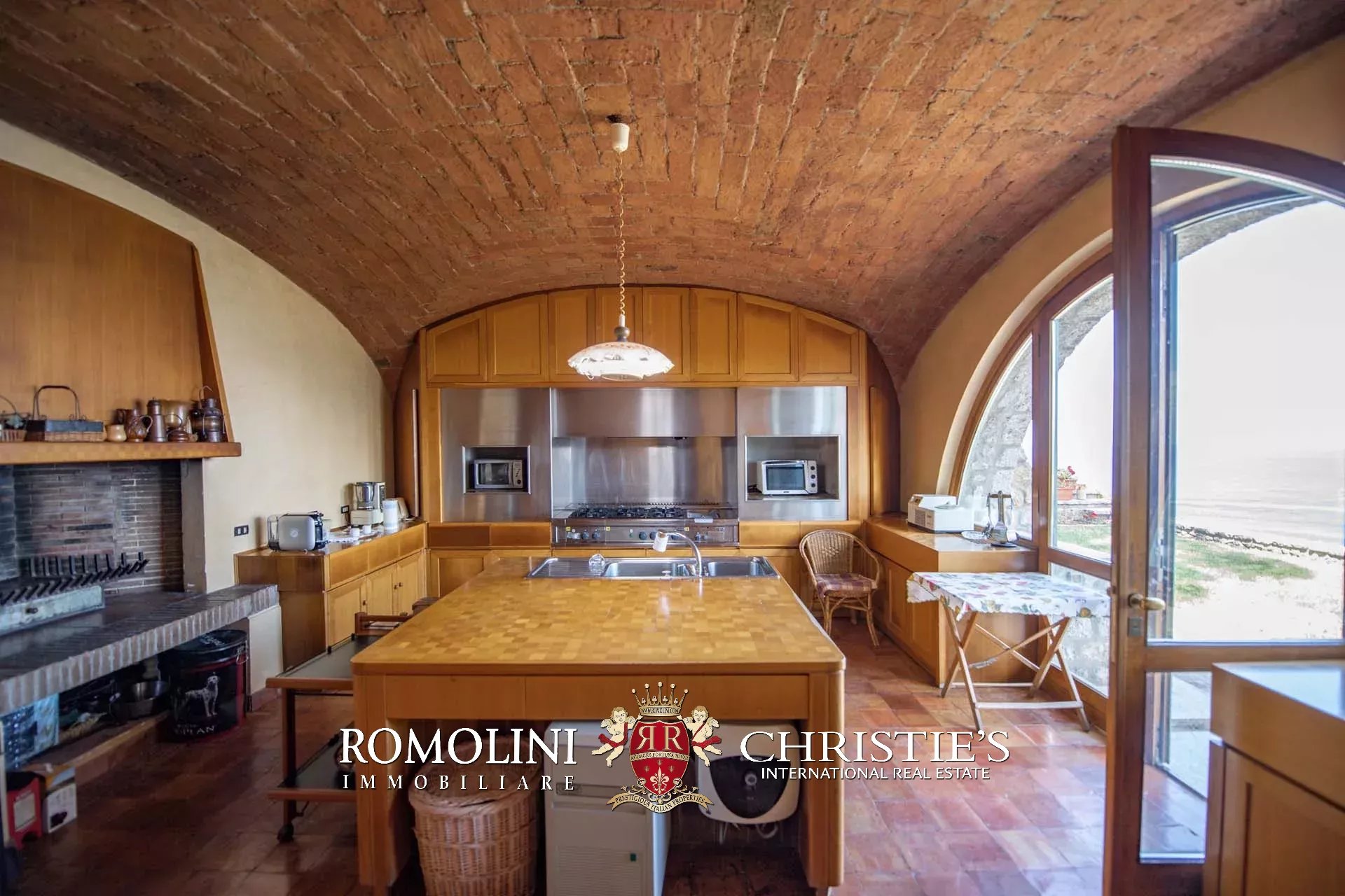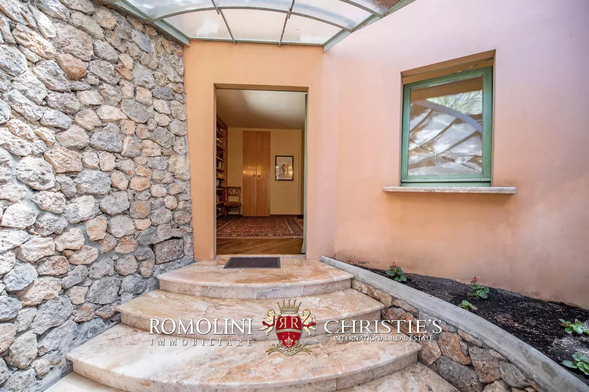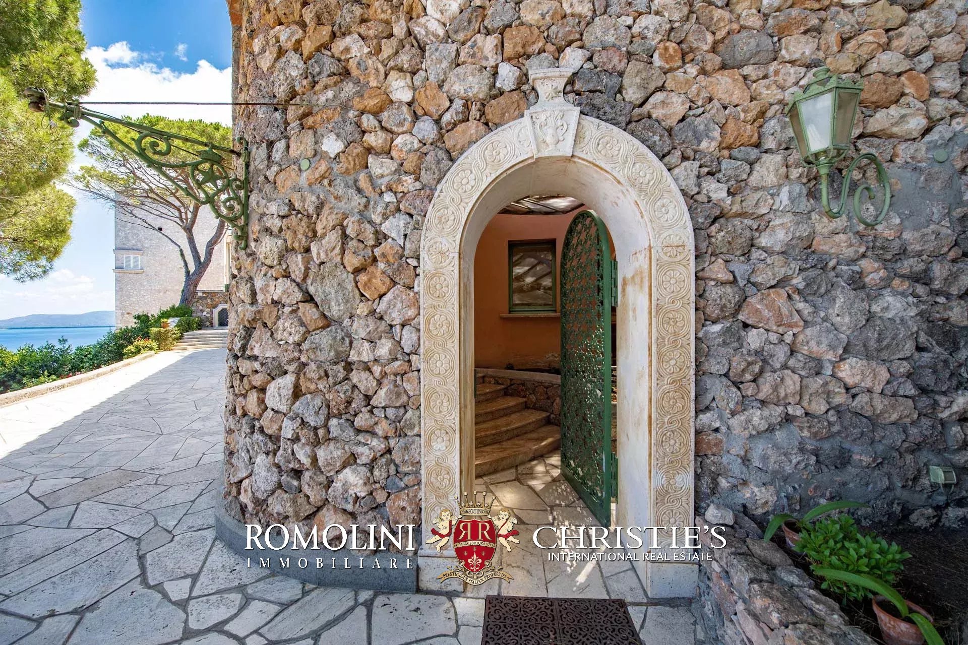 La villa (400 m², fino a 4 camere e 5 bagni) dispone di due accessi separati. Il primo, situato proprio lungo la strada che esce da Porto Santo Stefano, porta nell’ampio garage della casa (44 m²). Da qui, passando attraverso una stanza poliuso con bagno, si entra nel piano inferiore della villa. La prima stanza che si incontra è il grande soggiorno con camino settecentesco in marmo. Da qui si passa alla sala da pranzo e, proseguendo all’interno di un corridoio, si arriva infine a un tinello e alla cucina con lo splendido soffitto a volta. Tutte le sale presentano delle grandi aperture vetrate che guardano direttamente il mare e si aprono sul giardino.