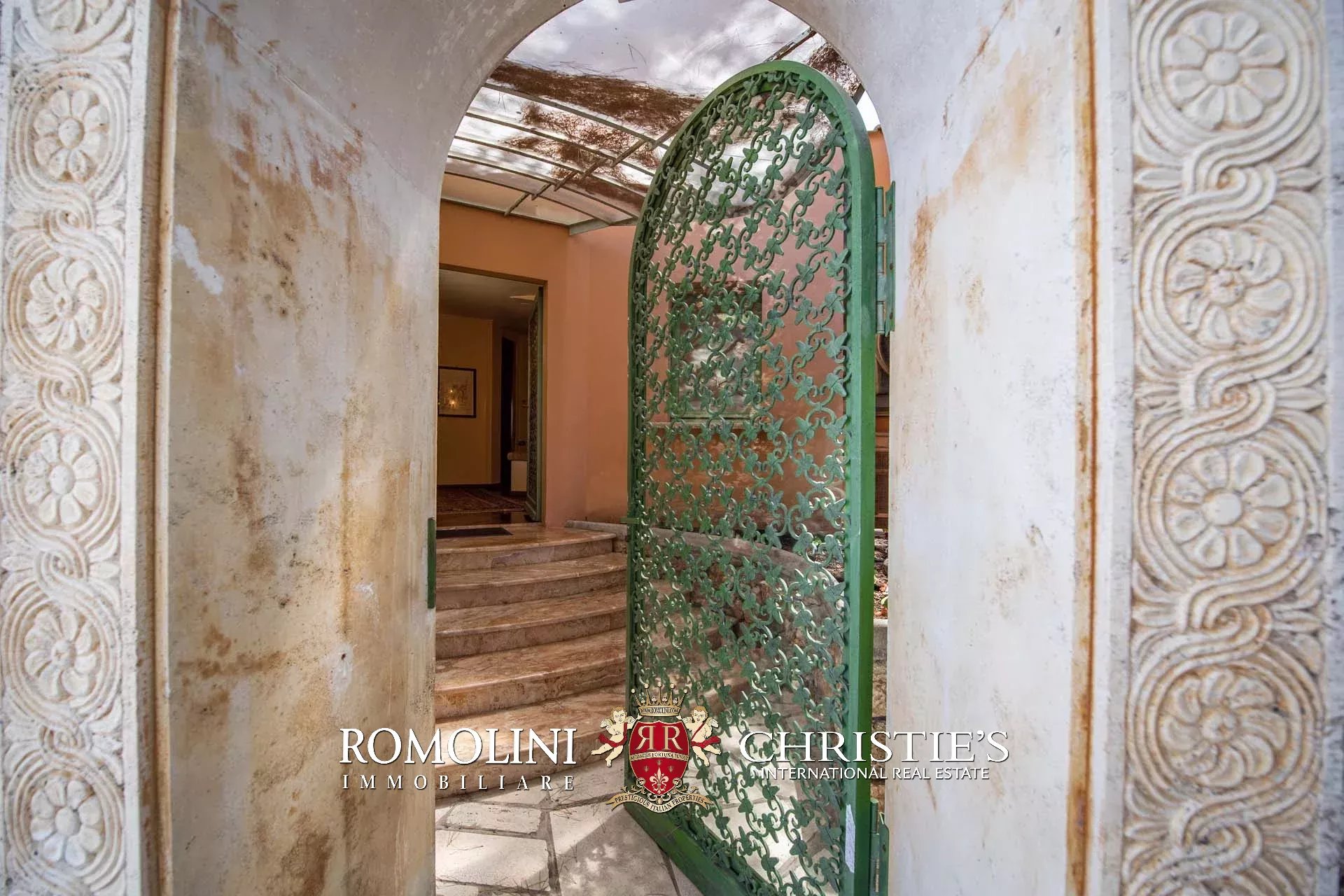 L’accesso principale della villa, posto poco più avanti rispetto a quello tramite il garage e chiuso da un cancello in ferro, si apre su un piazzale pavimentato con lastre di travertino dove si possono agevolmente parcheggiare diverse auto.