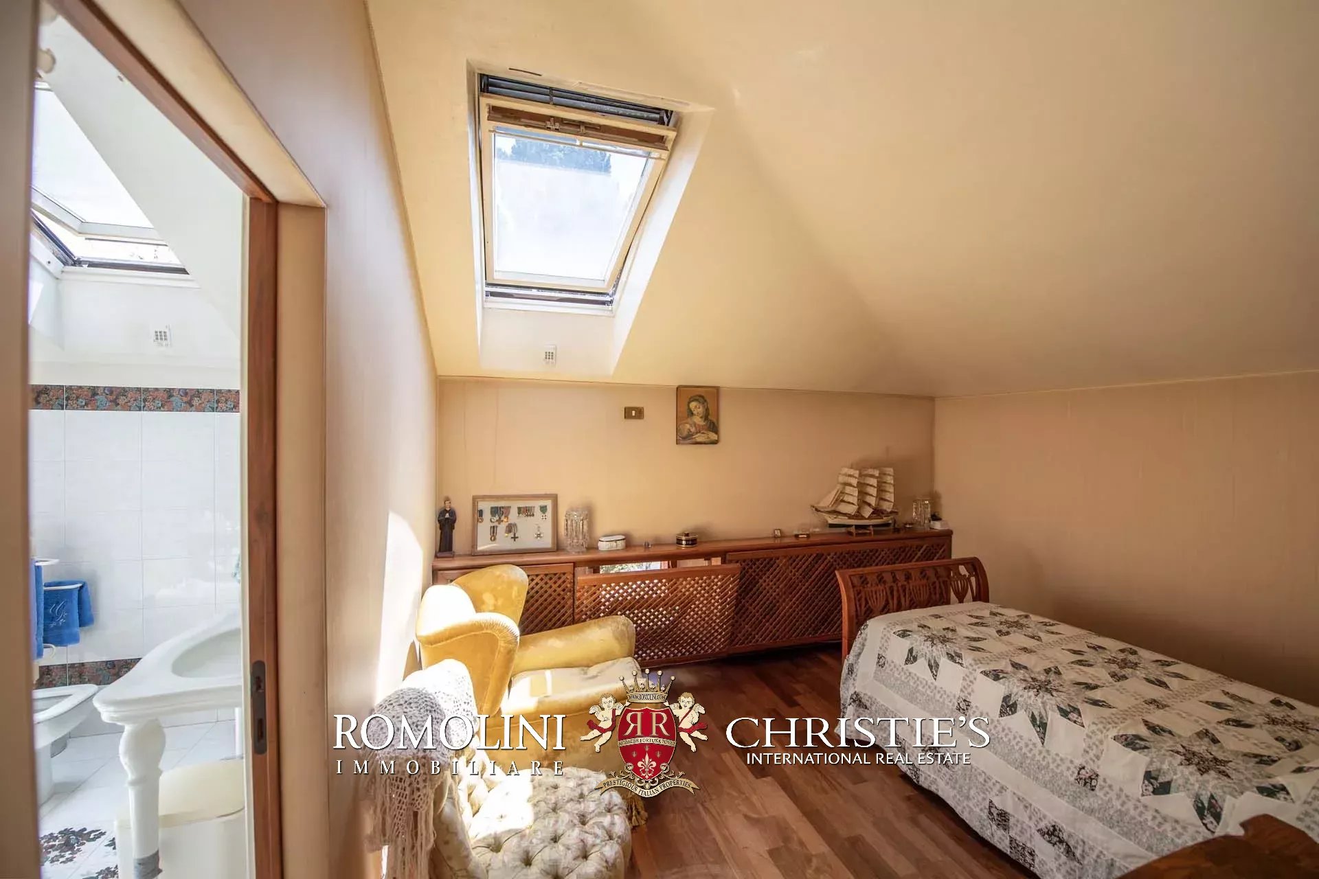 Tornando all’ingresso, la scala sale poi al primo piano dove si trova la zona notte della villa. Dal disimpegno in cima alla scala si accede sulla sinistra alla camera padronale dotata di bagno privato, cabina armadio e guardaroba, mentre sulla destra si arriva alla seconda camera, più piccola ma dotata anch’essa di bagno privato e guardaroba. I locali del primo piano non hanno finestre, ma sono illuminati tramite grandi lucernari.